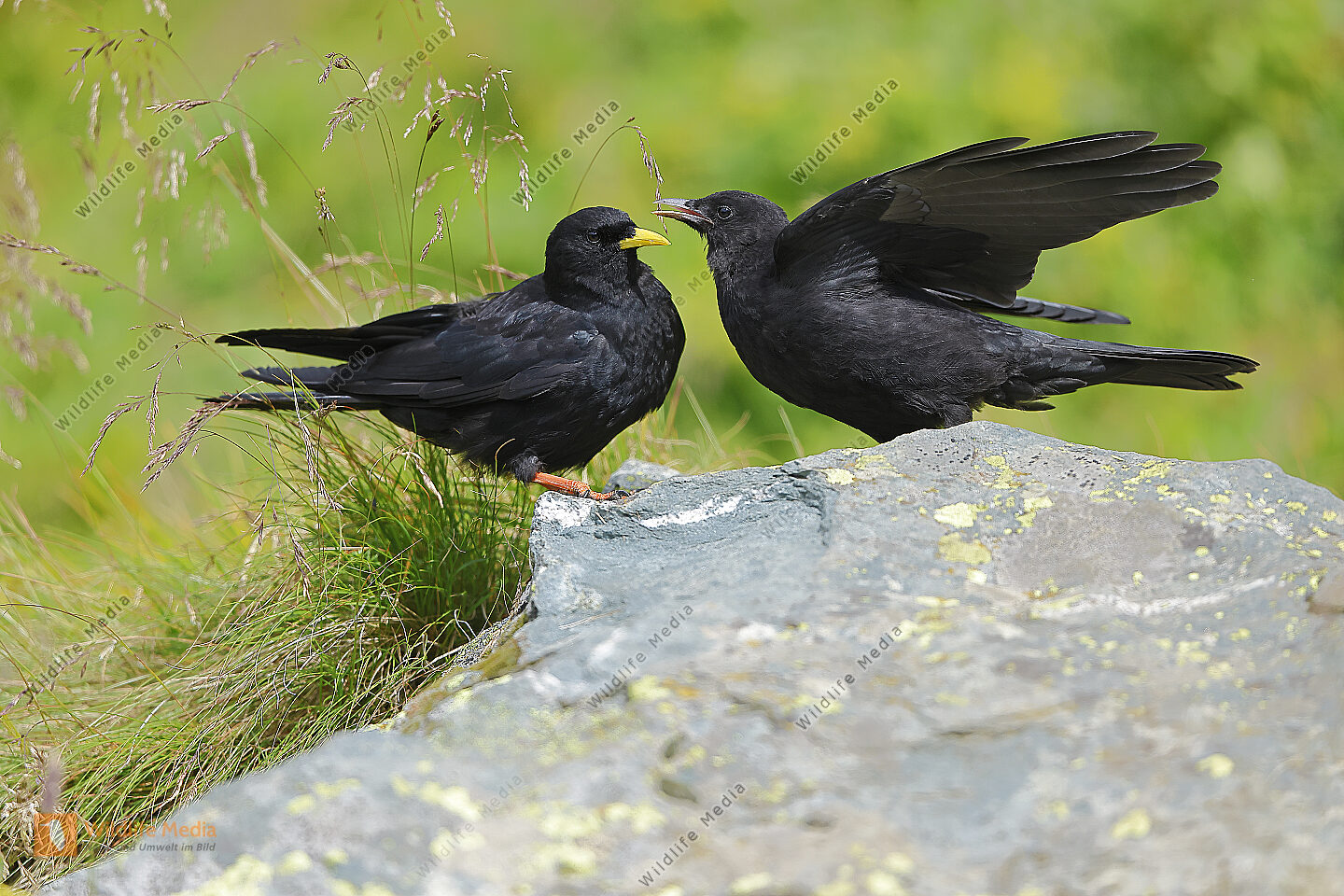 Alpendohle füttert Jungvogel