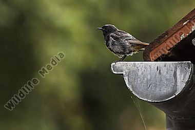 Amsel im Regen sitzt am Fenster