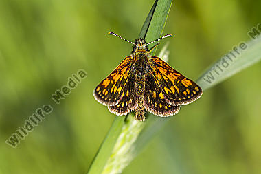 Zoom Rostfarbiger Dickkopffalter an einem Grashalm