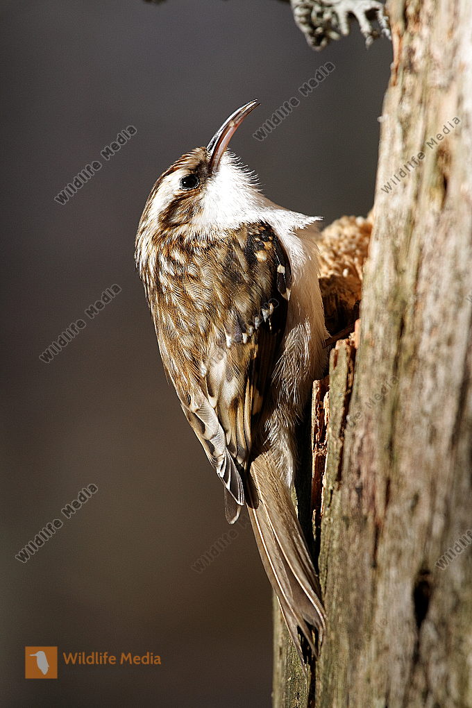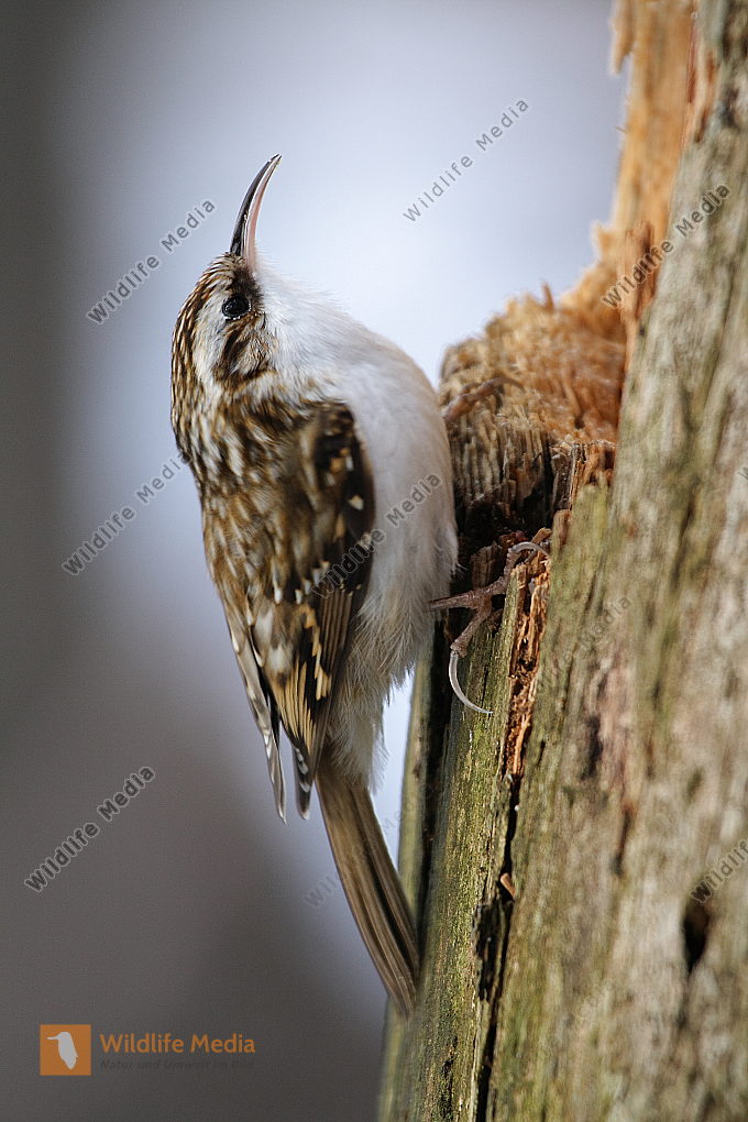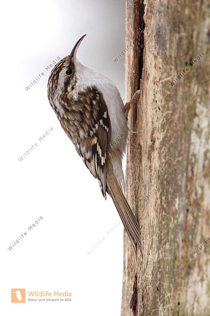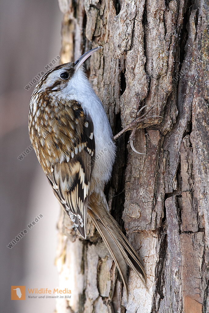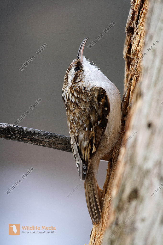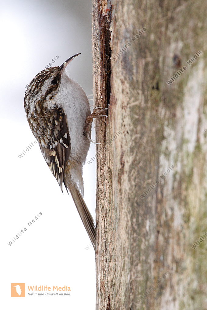 Ein Waldbaumläufer am Baumstamm auf Futtersuche