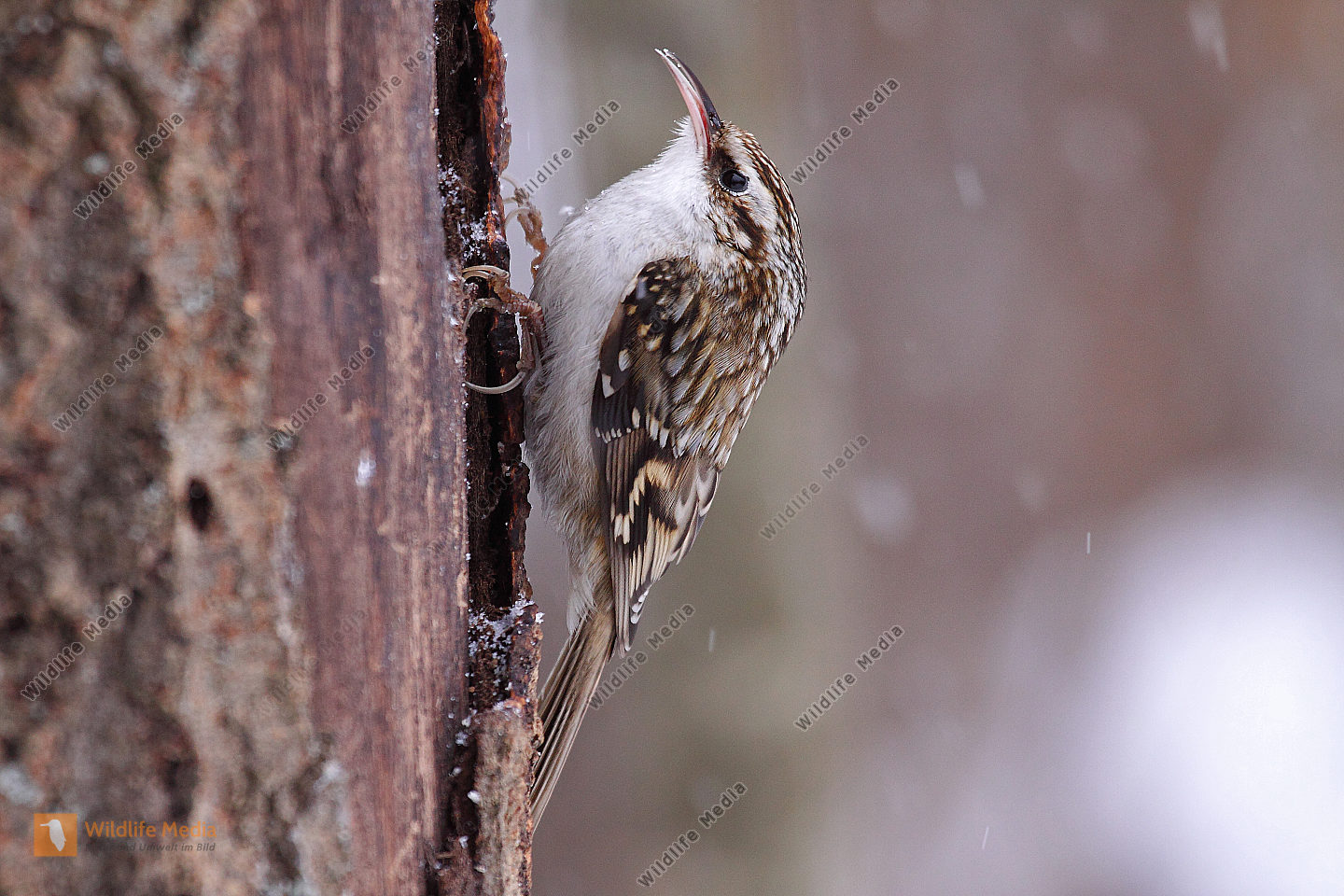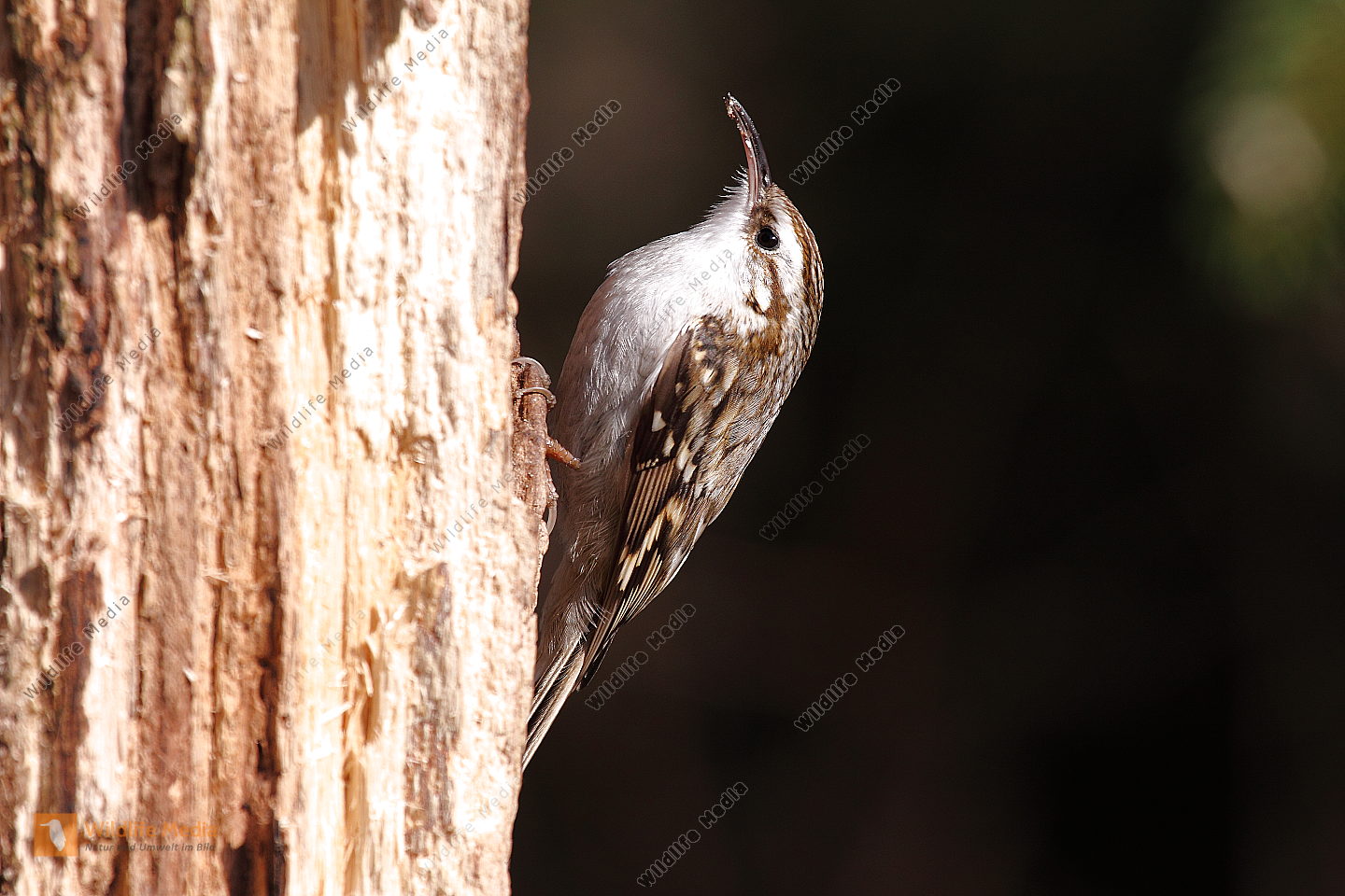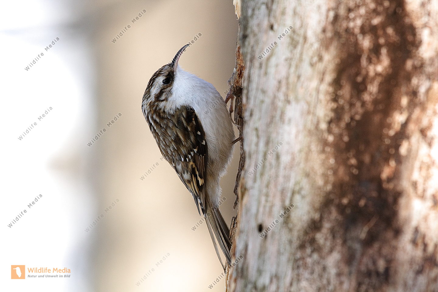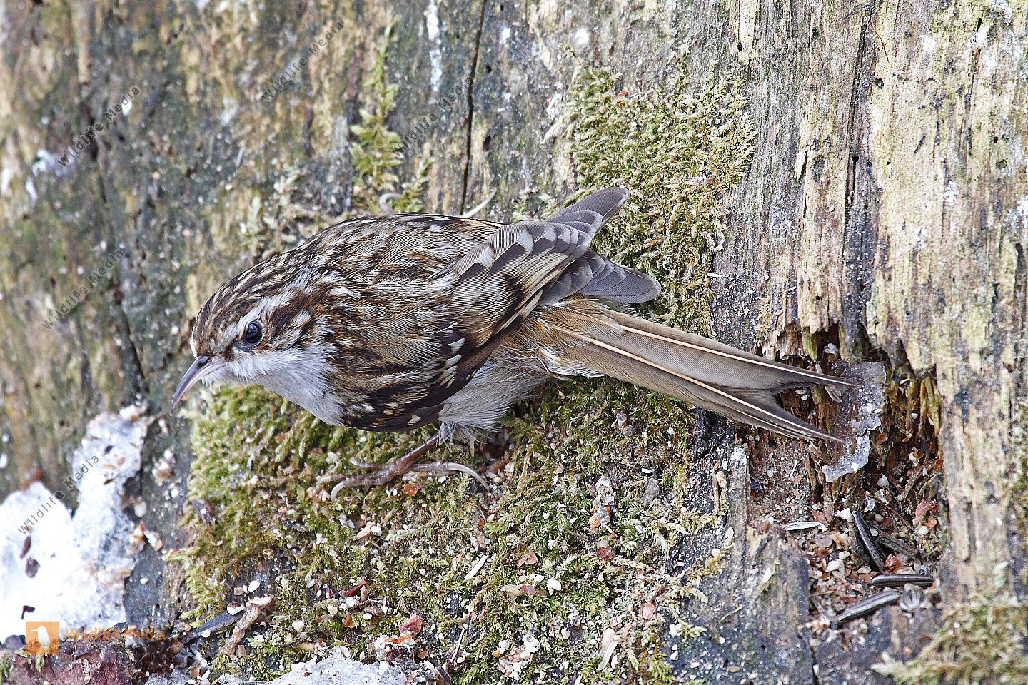 Ein Waldbaumläufer am Baumstamm auf Futtersuche