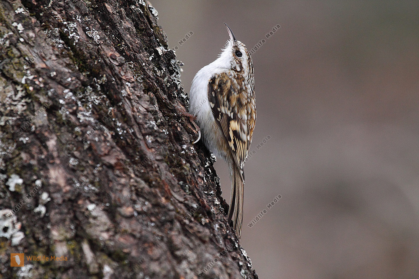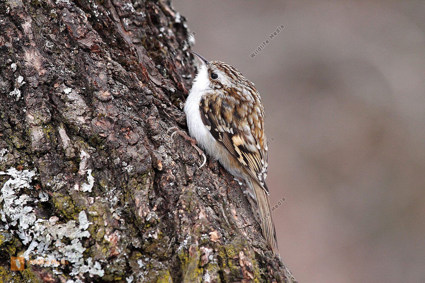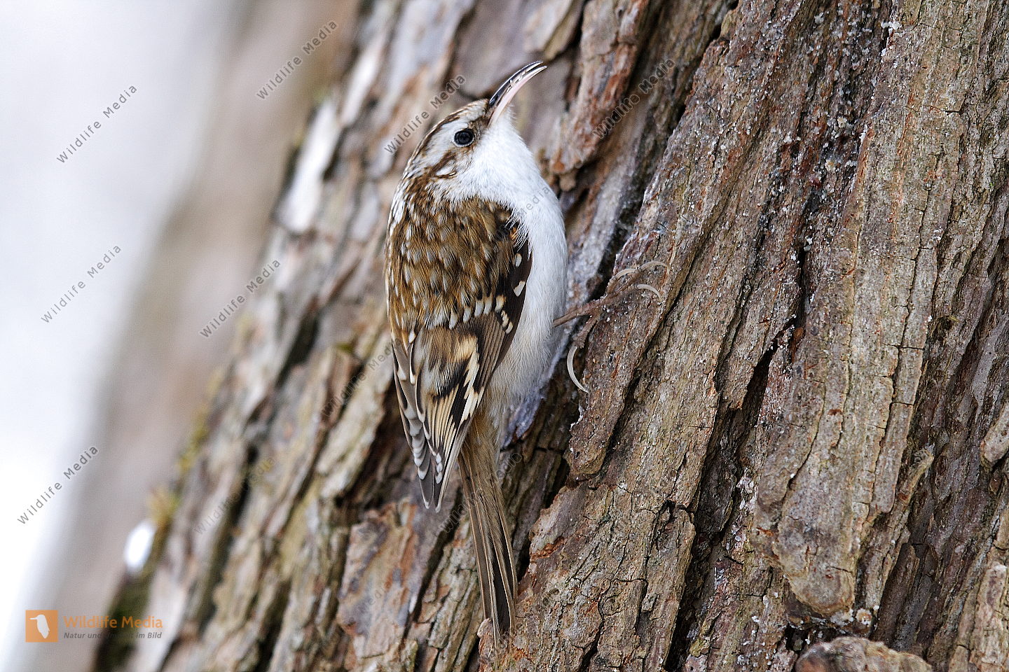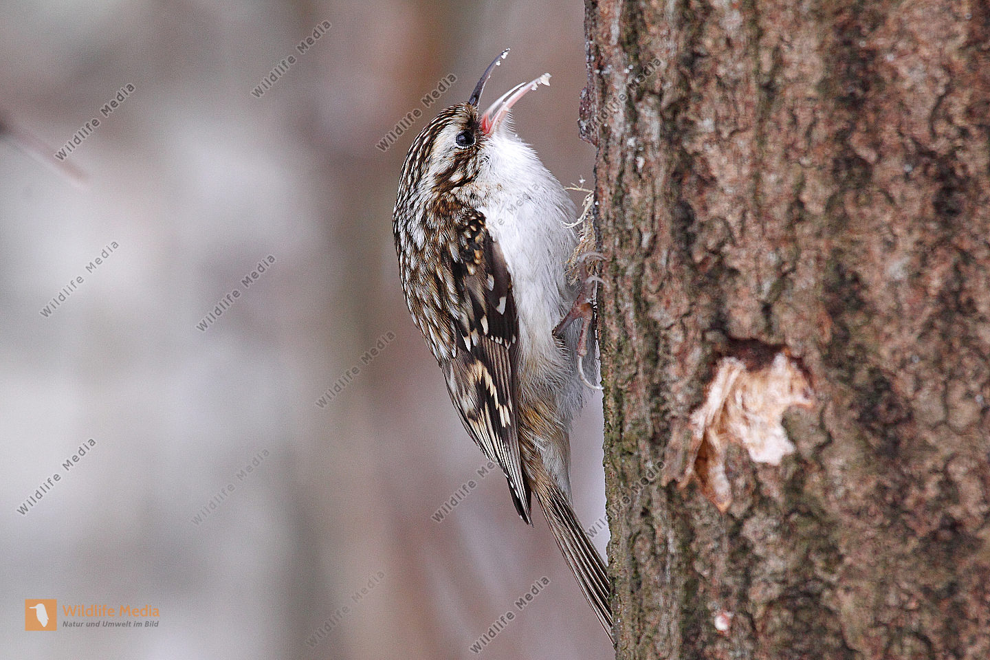 Ein Waldbaumläufer am Baumstamm auf Futtersuche