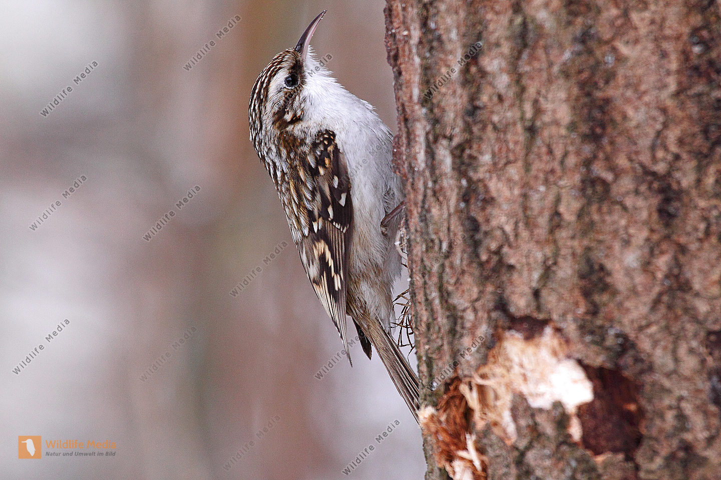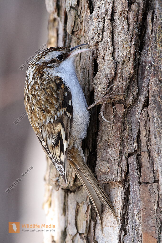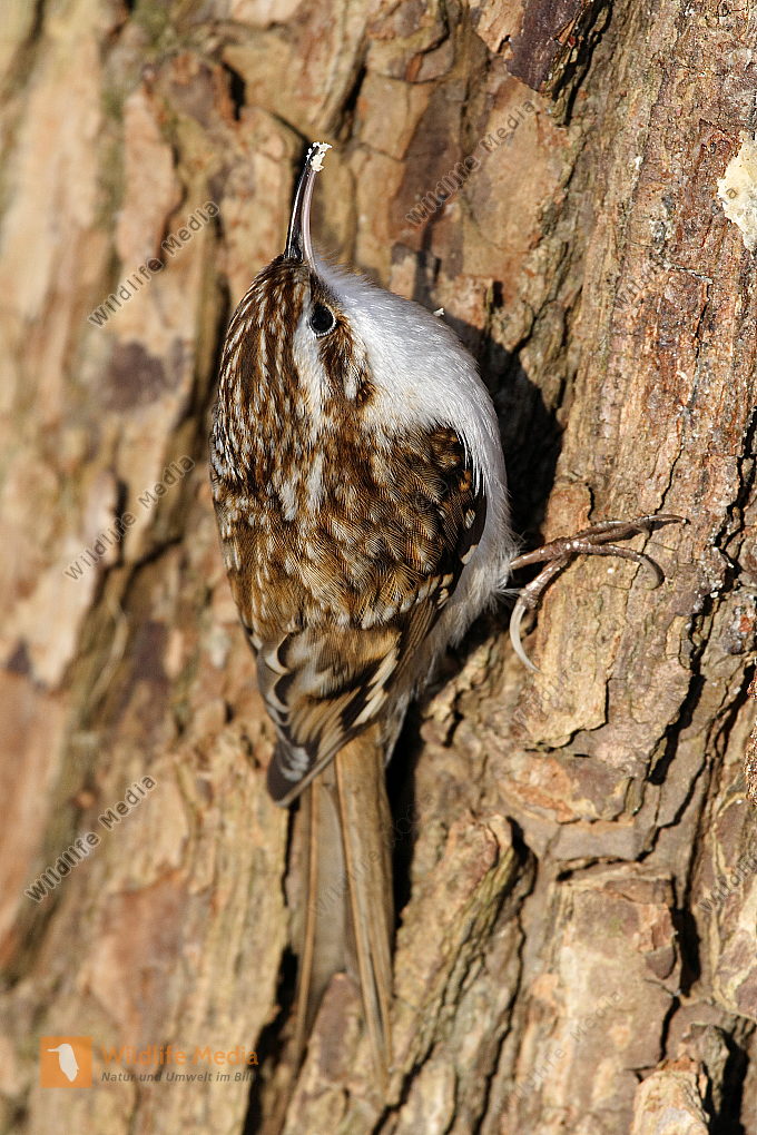 Zoom Ein Waldbaumläufer am Baumstamm auf Futtersuche