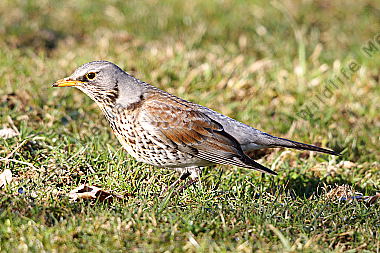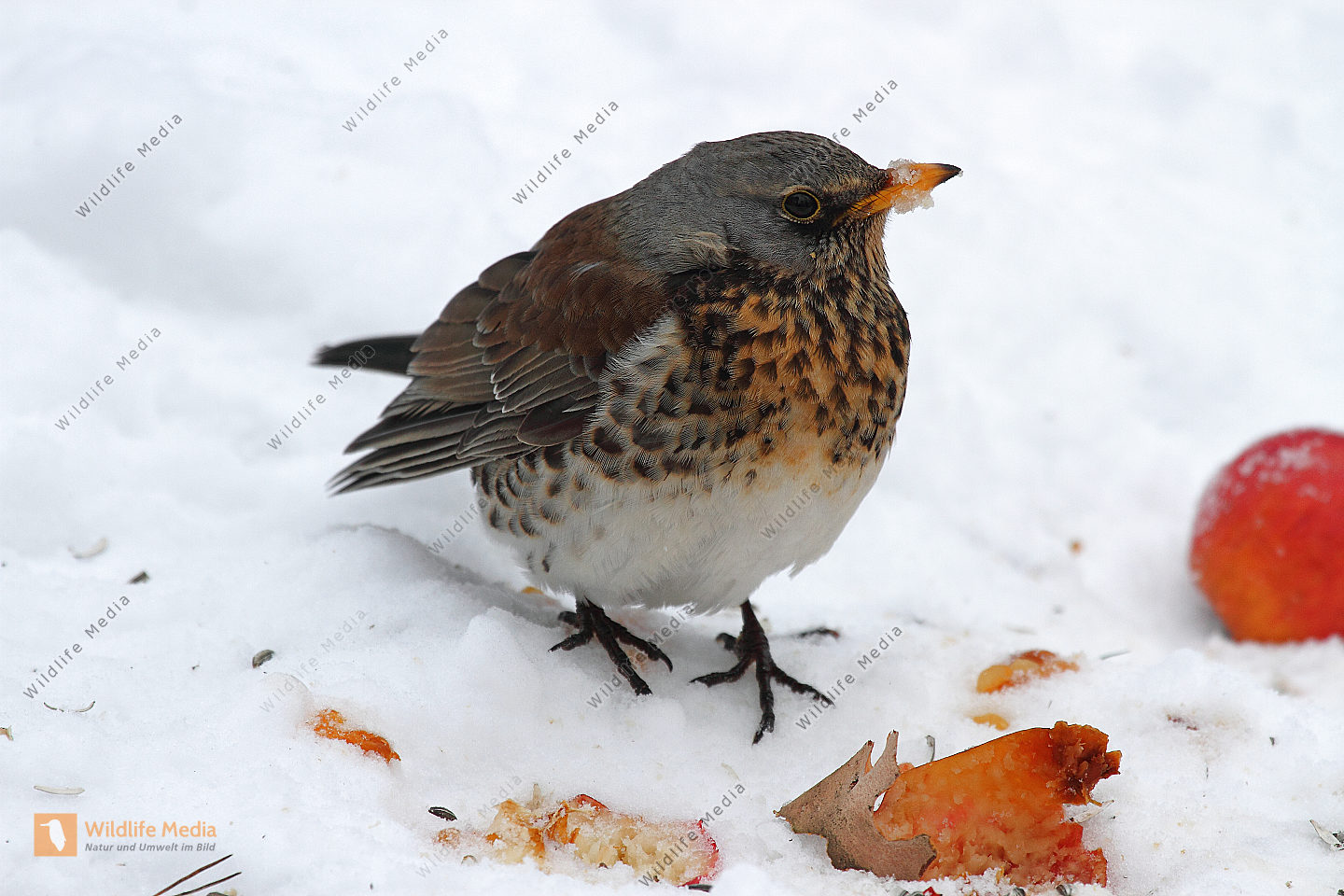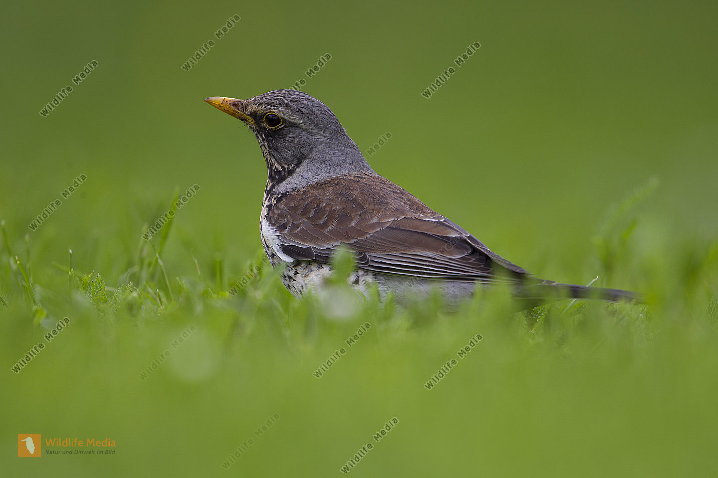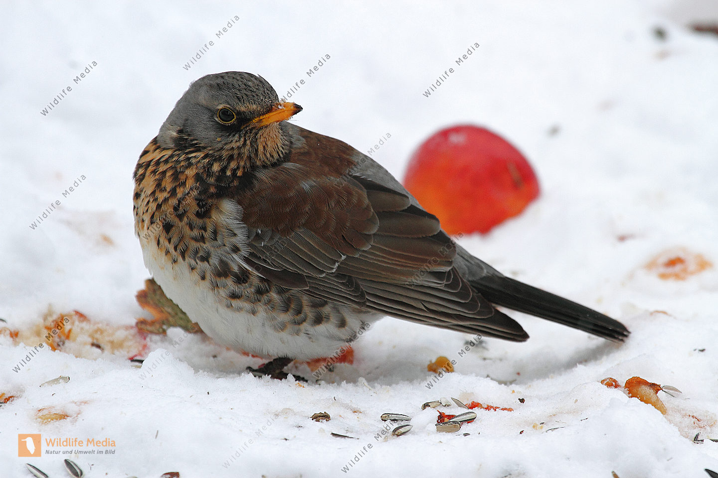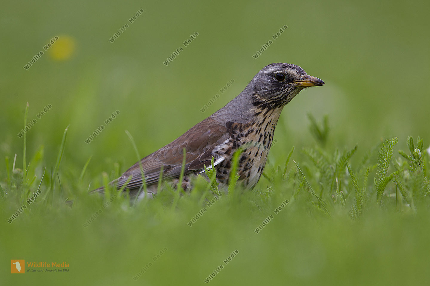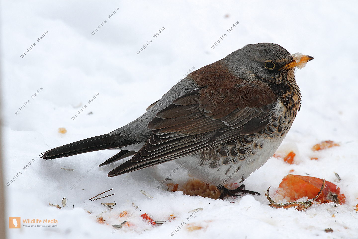 Zoom Eine Wacholderdrossel sitzt auf einem Ast