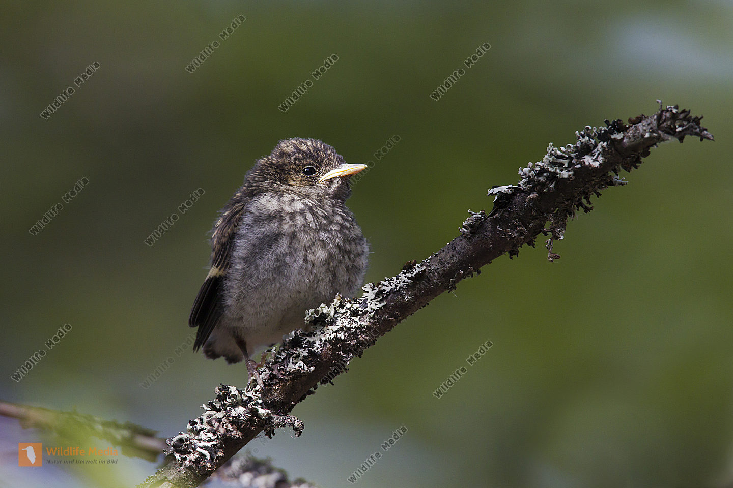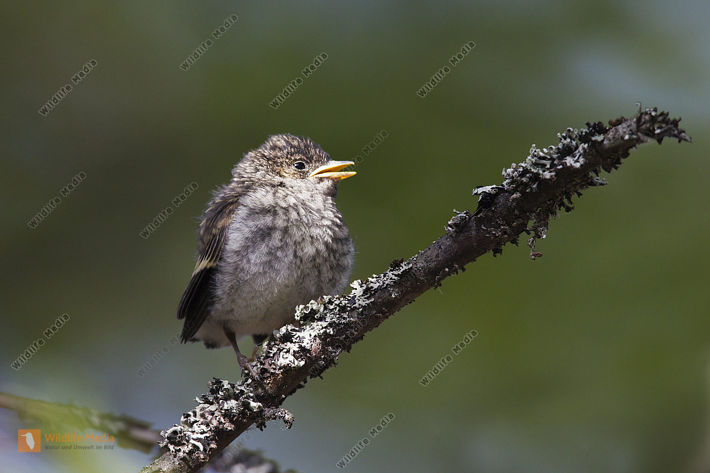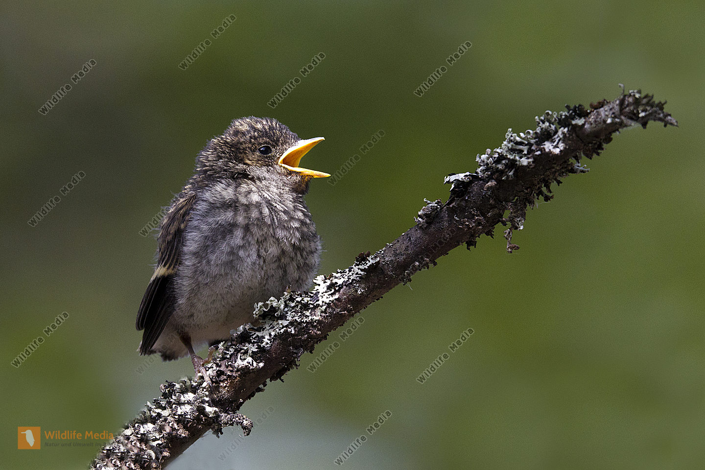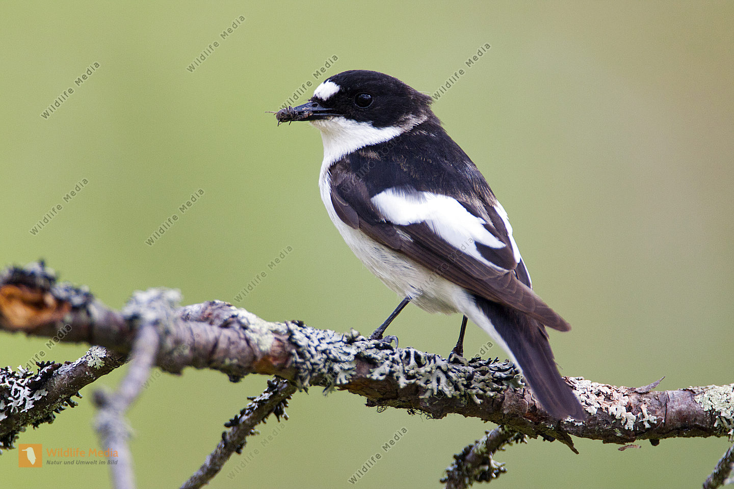 Ein Trauerschnäpper auf Nahrungssuche am Rand einer Wiese