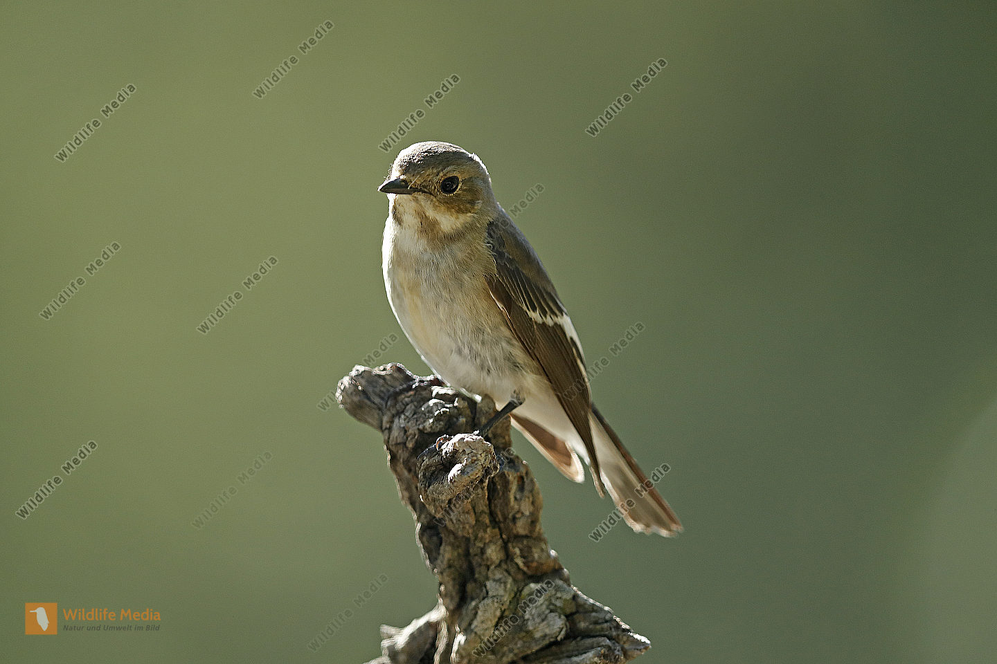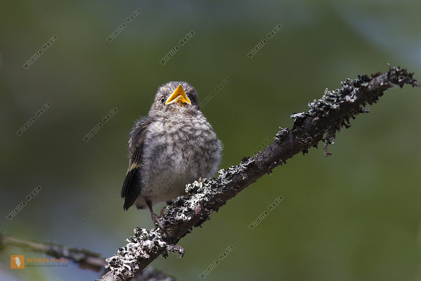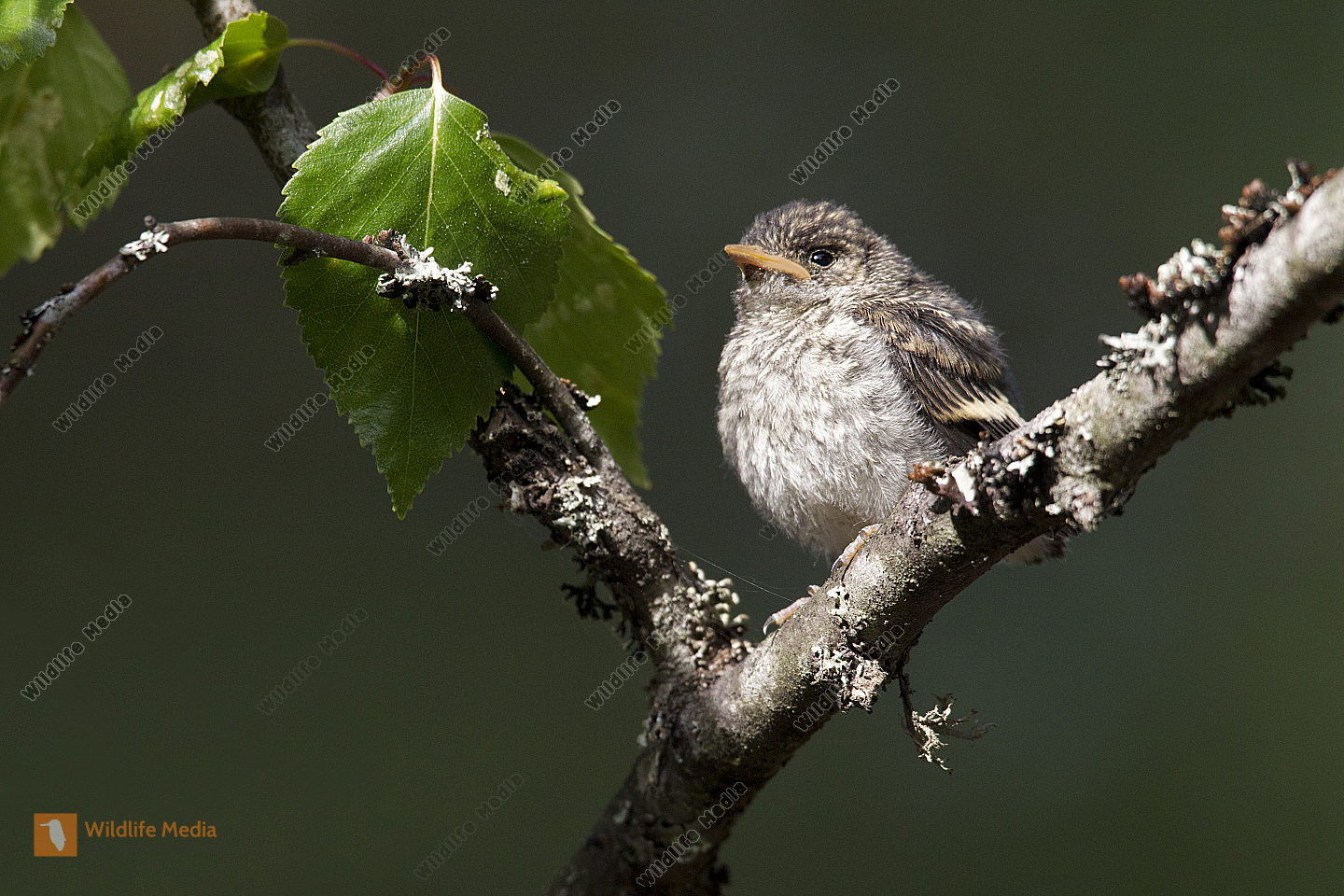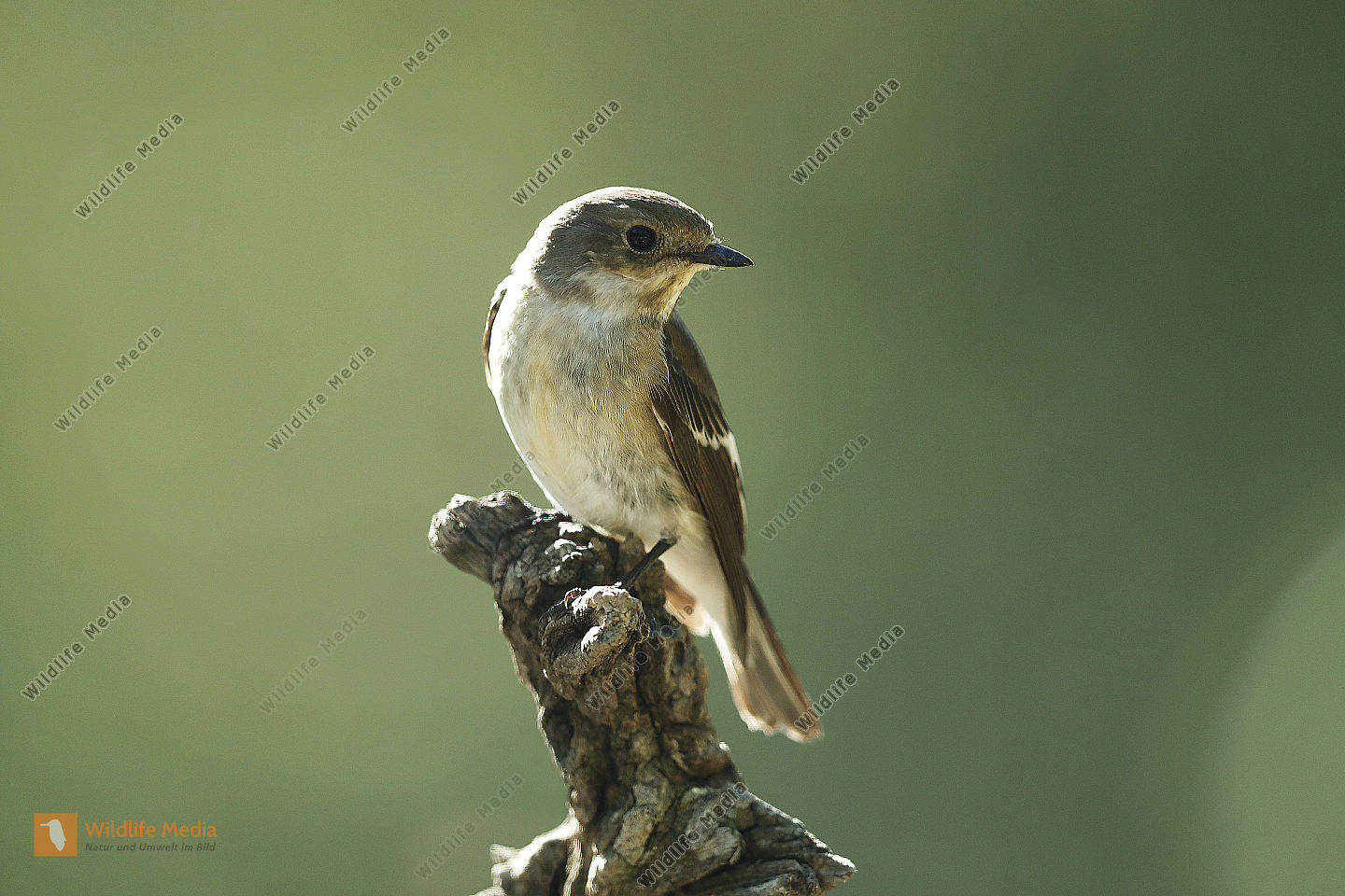 Ein Trauerschnäpper auf Nahrungssuche am Rand einer Wiese
