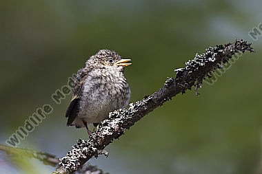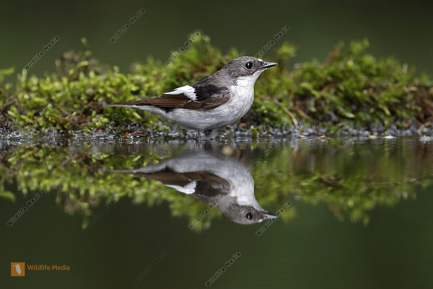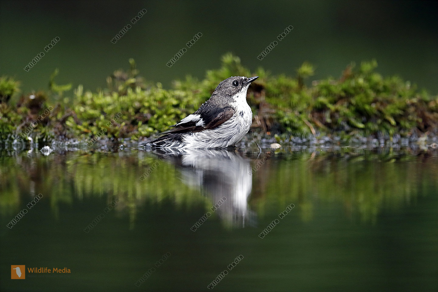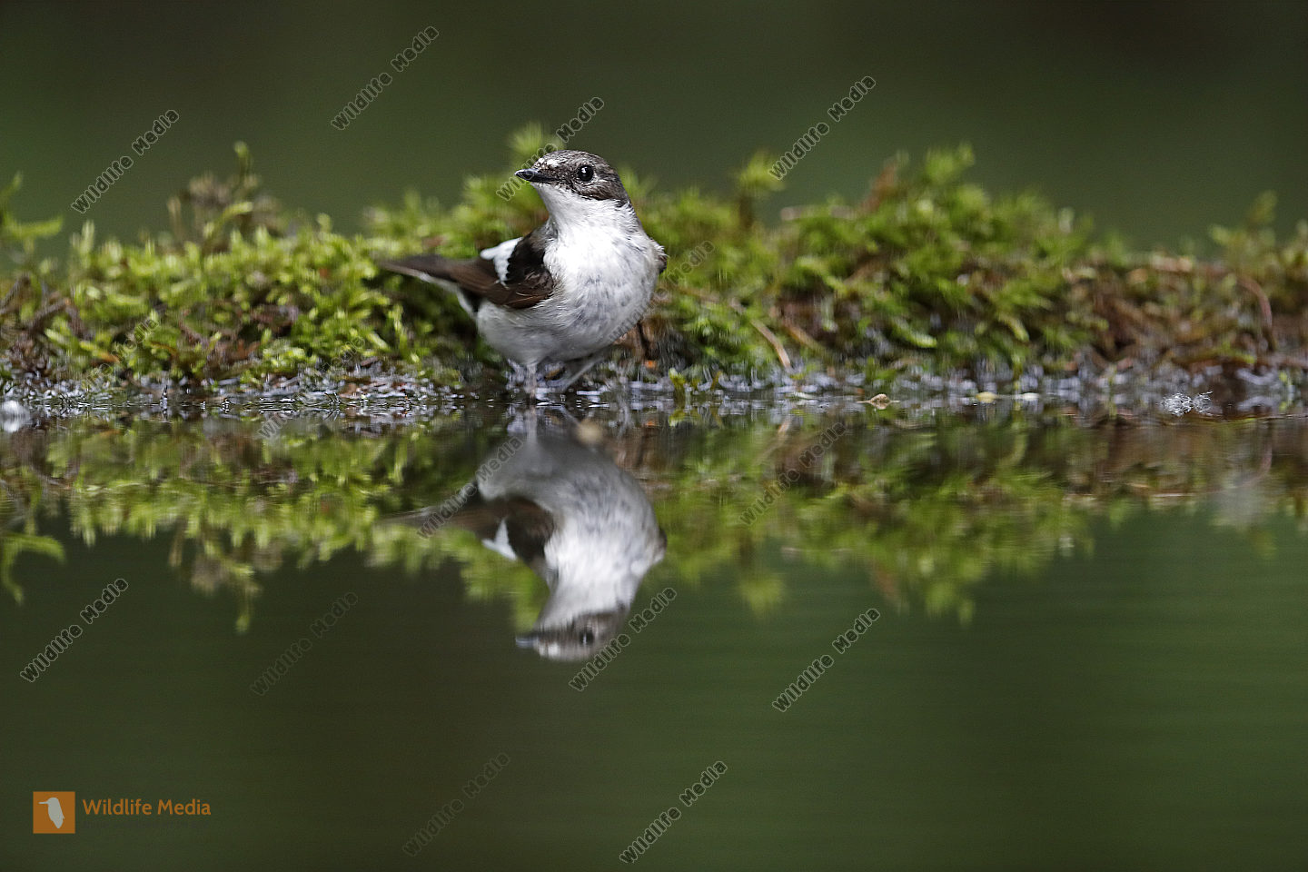 Zoom Ein Trauerschnäpper auf Nahrungssuche am Rand einer Wiese