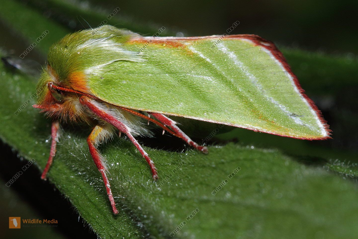 Zoom Eine Buchen-Kahneule in Ruhestellung auf einem Blatt