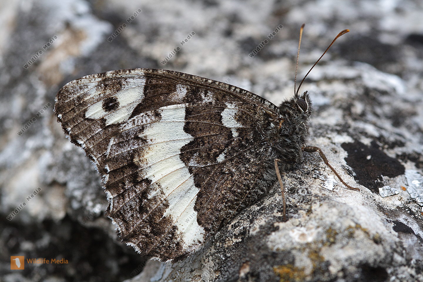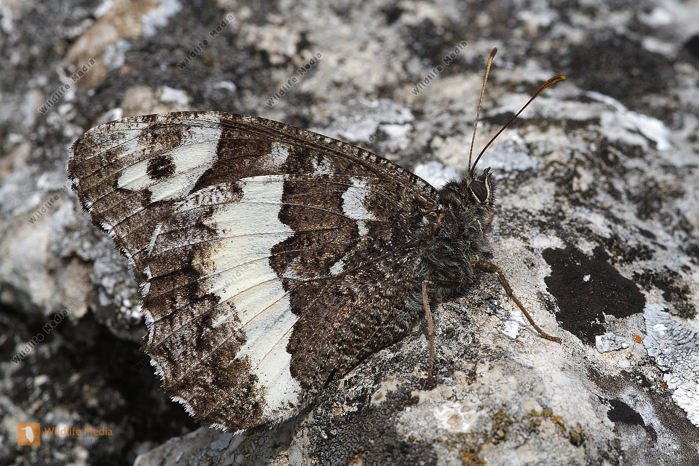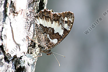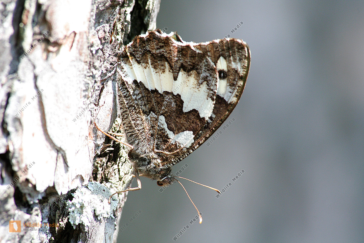 Ein Weißer Waldportier in Ruhestellung. Blick auf die Flügelunterseite.