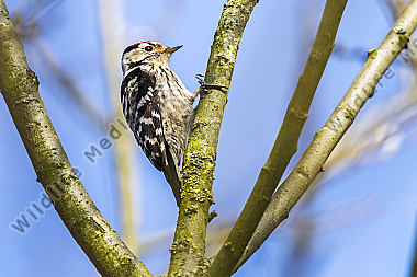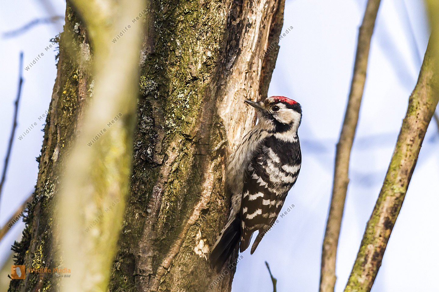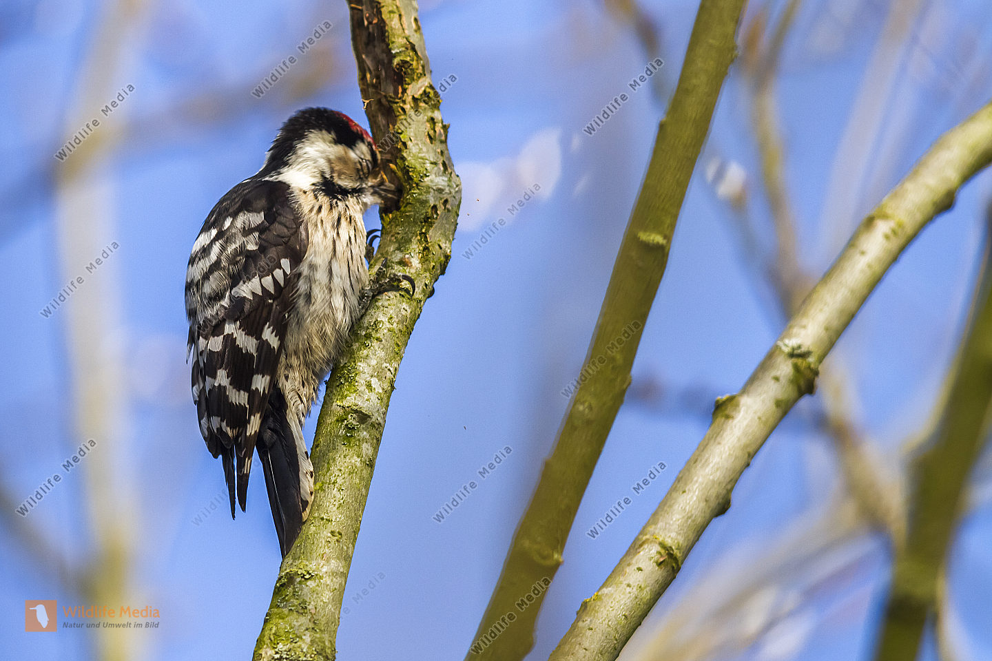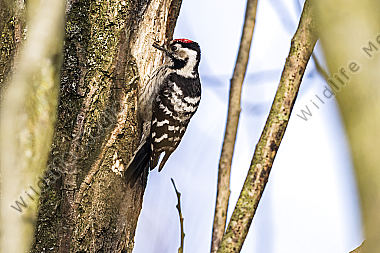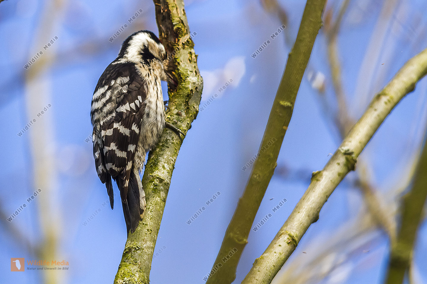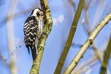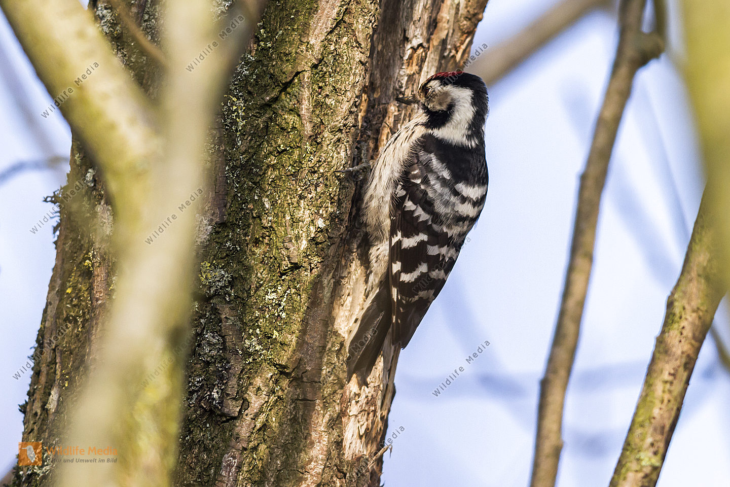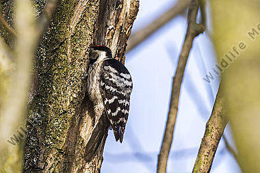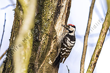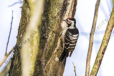 Ein Kleinspecht auf Futtersuche am Baumstamm