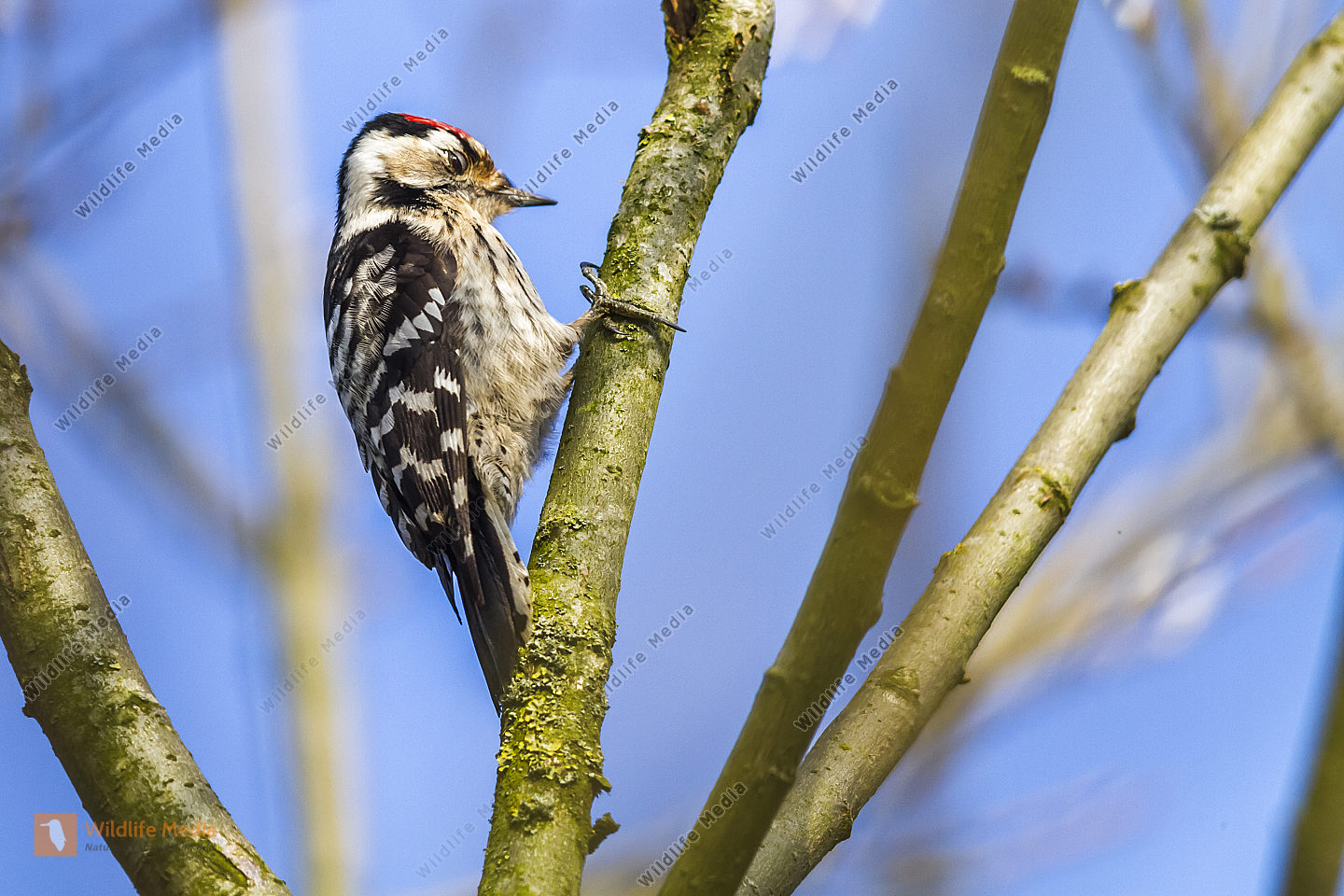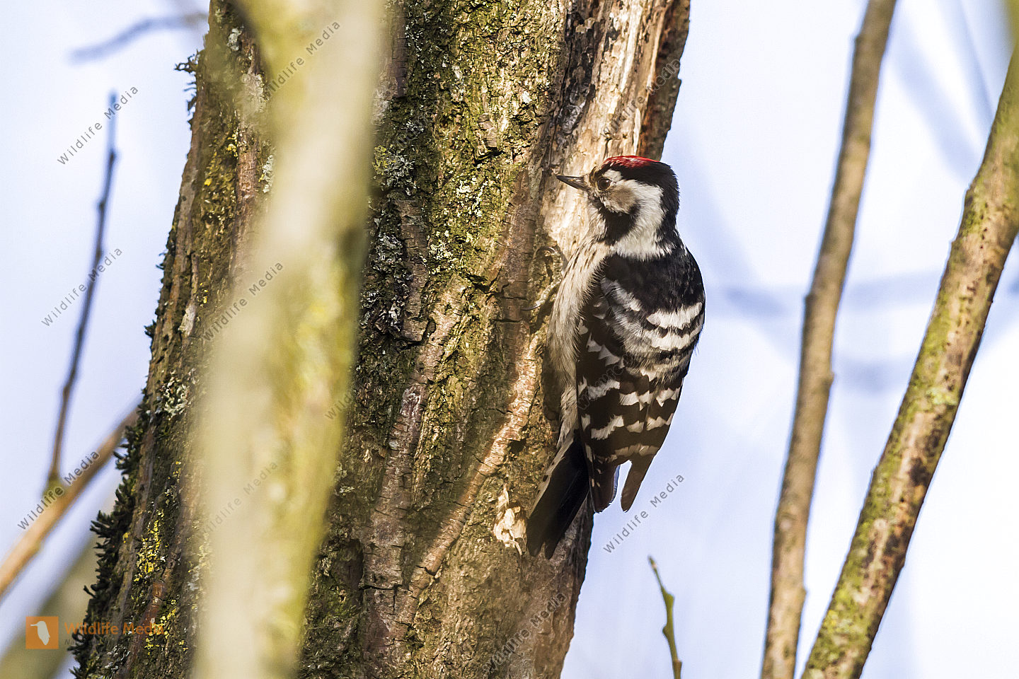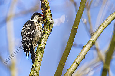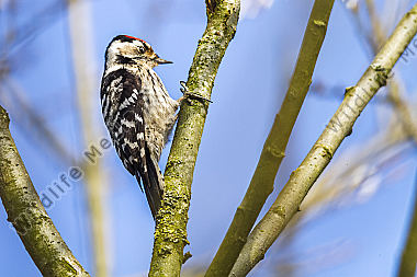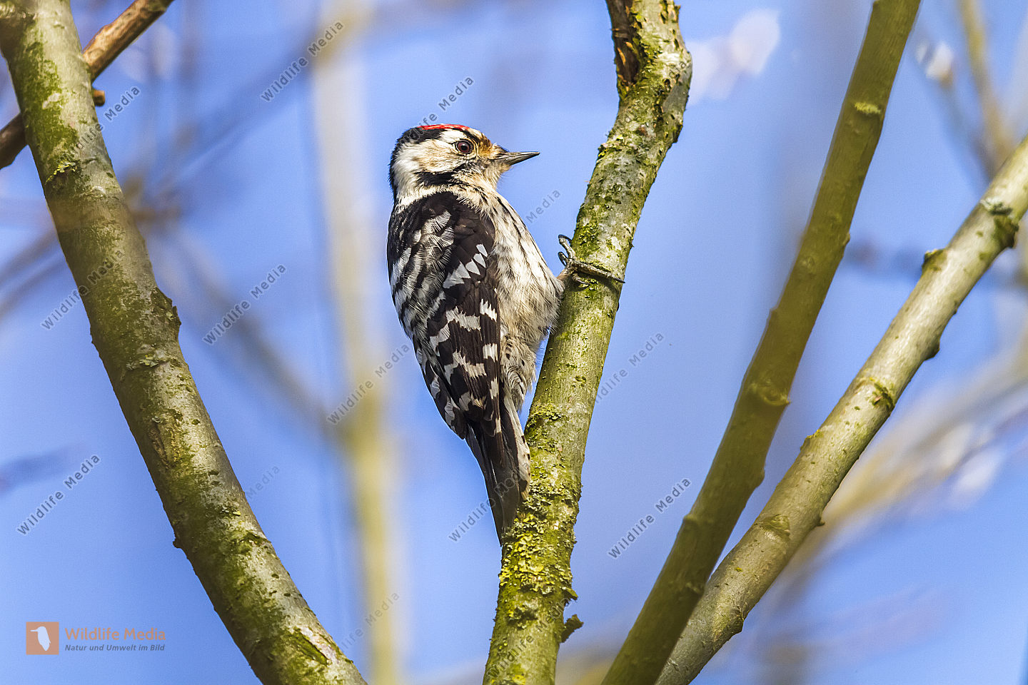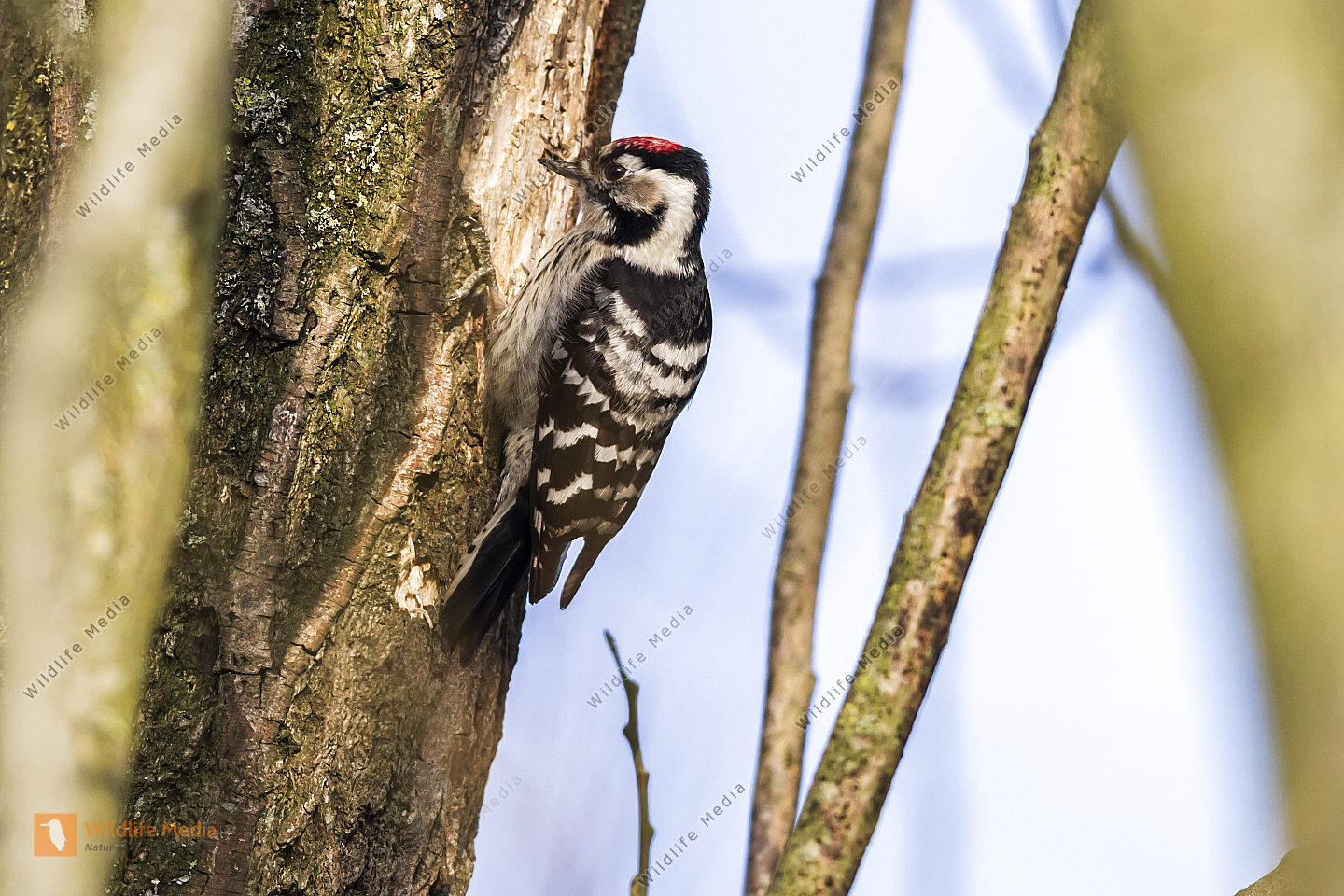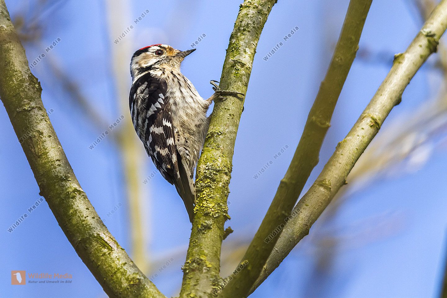 Ein Kleinspecht auf Futtersuche am Baumstamm