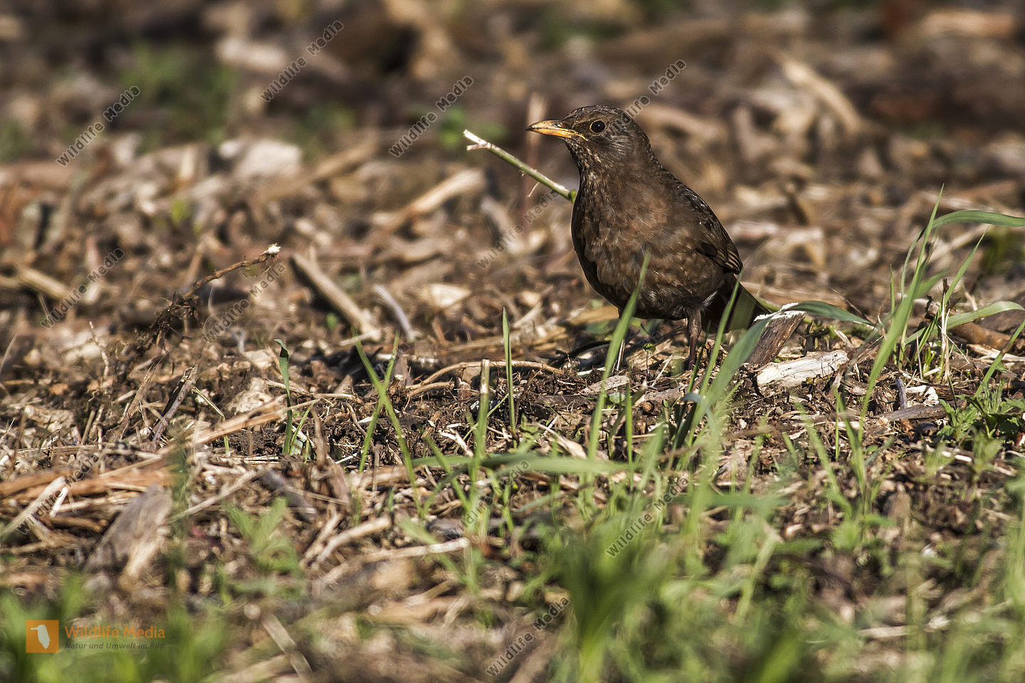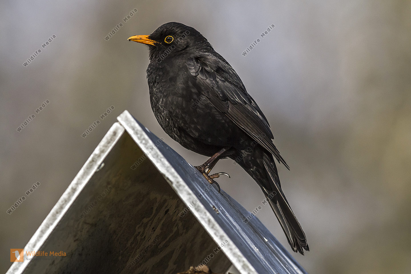 Amsel sitzt auf dem Dach eines Futterhäuschens