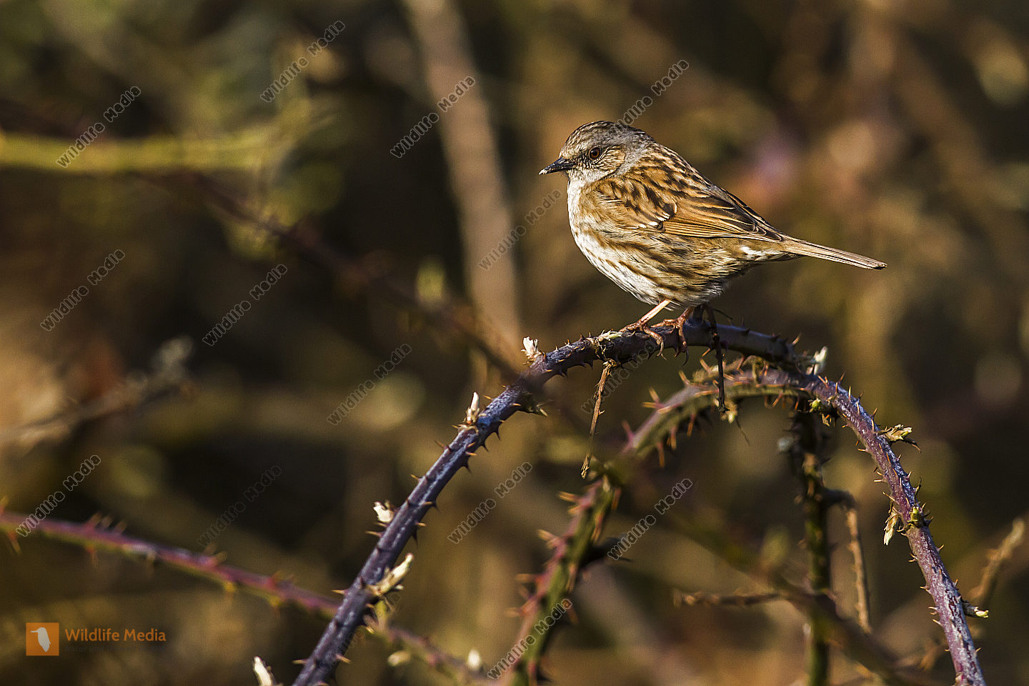 Heckenbraunelle sitzt auf einem Dornenstrauch