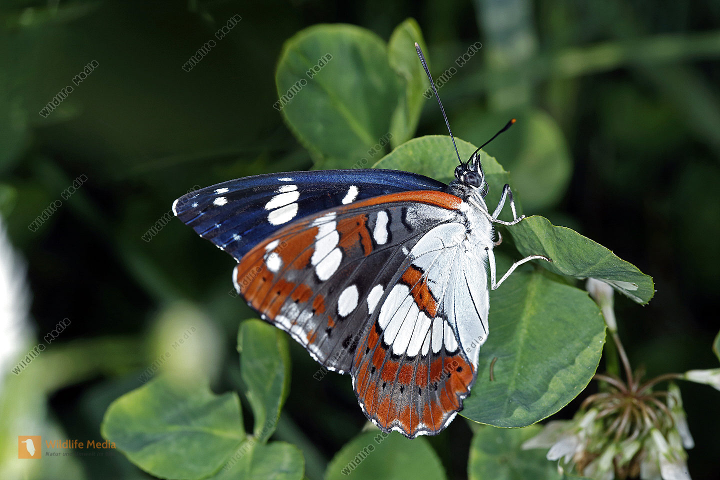 Kleiner Perlmutterfalter sitzt auf weißer Blüte