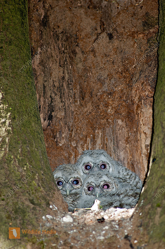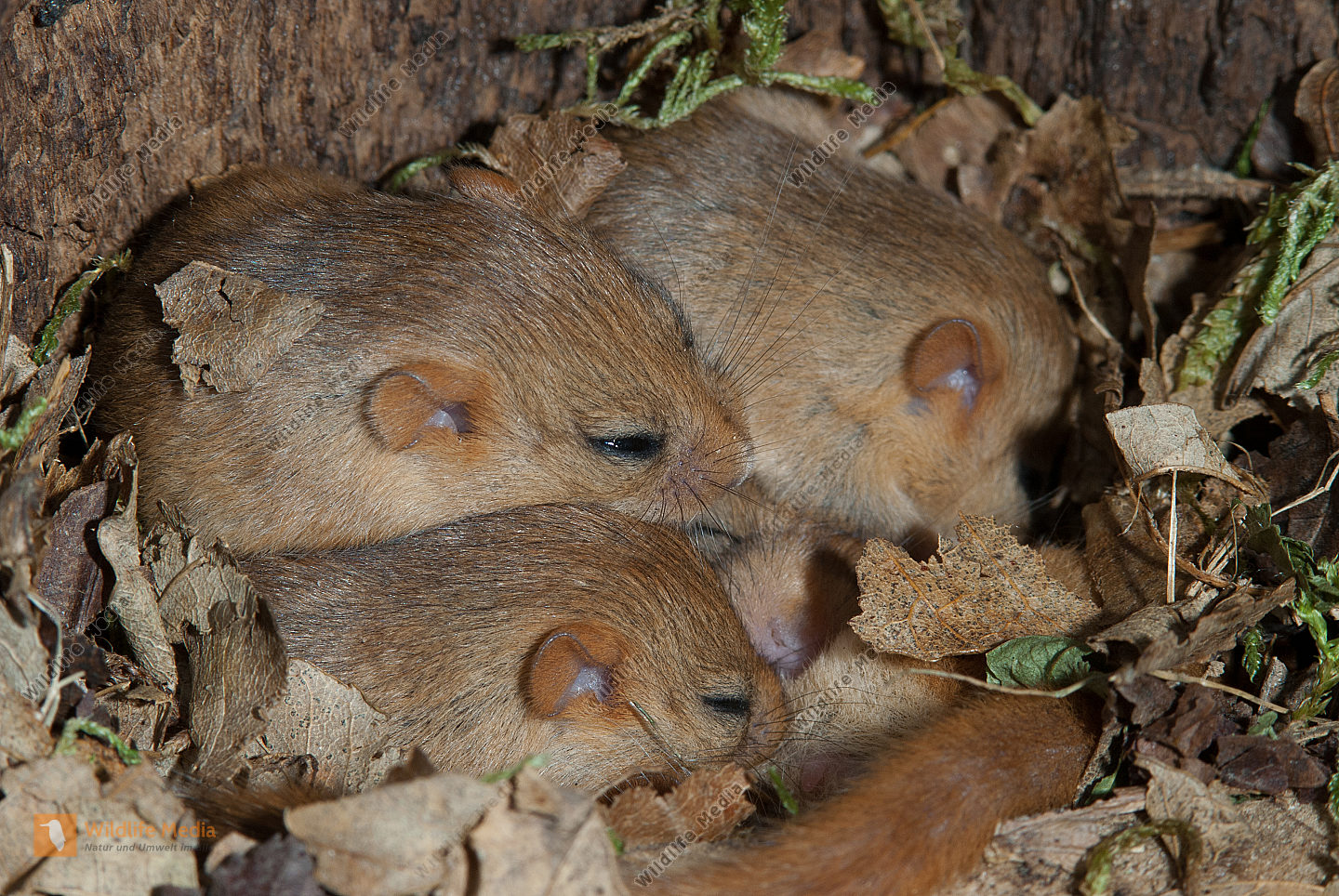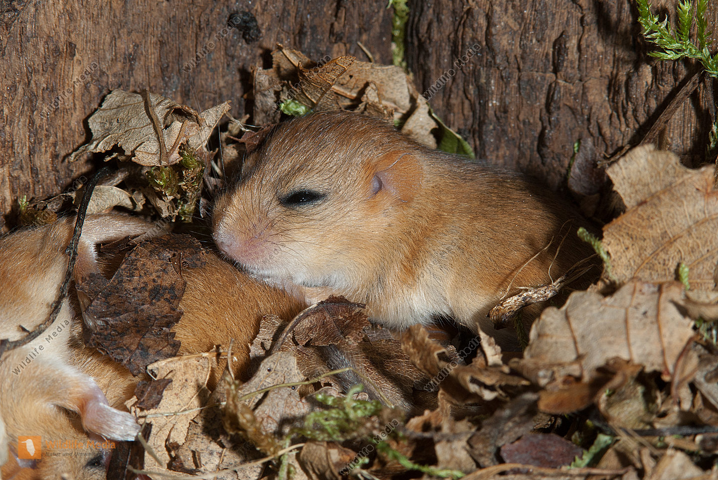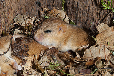 Haselmaus Muscardinus avellanarius Nest in Höhle des Schwarzspechts Jungtiere