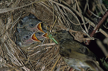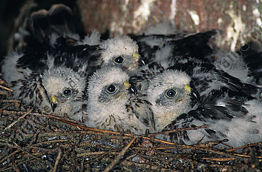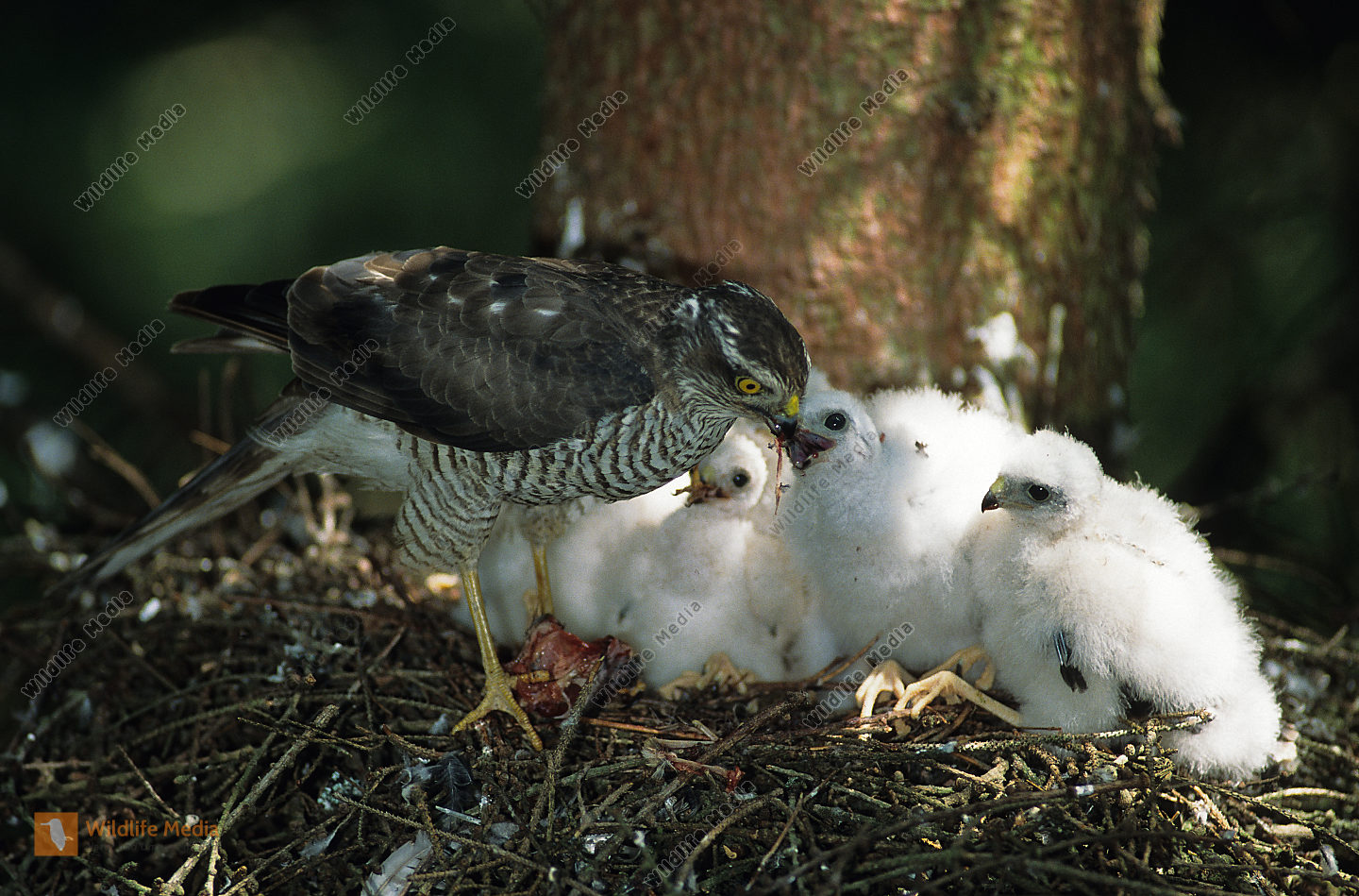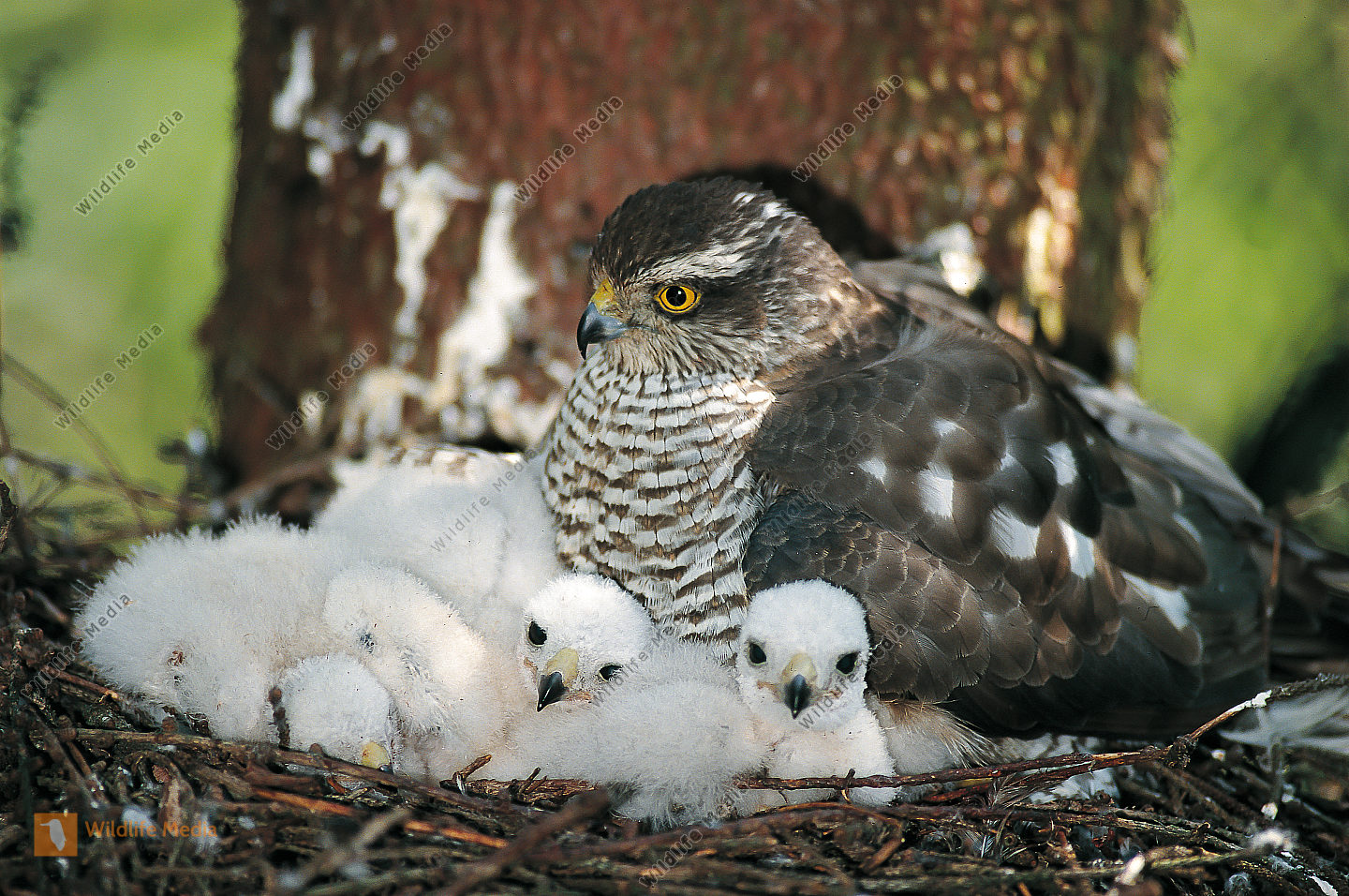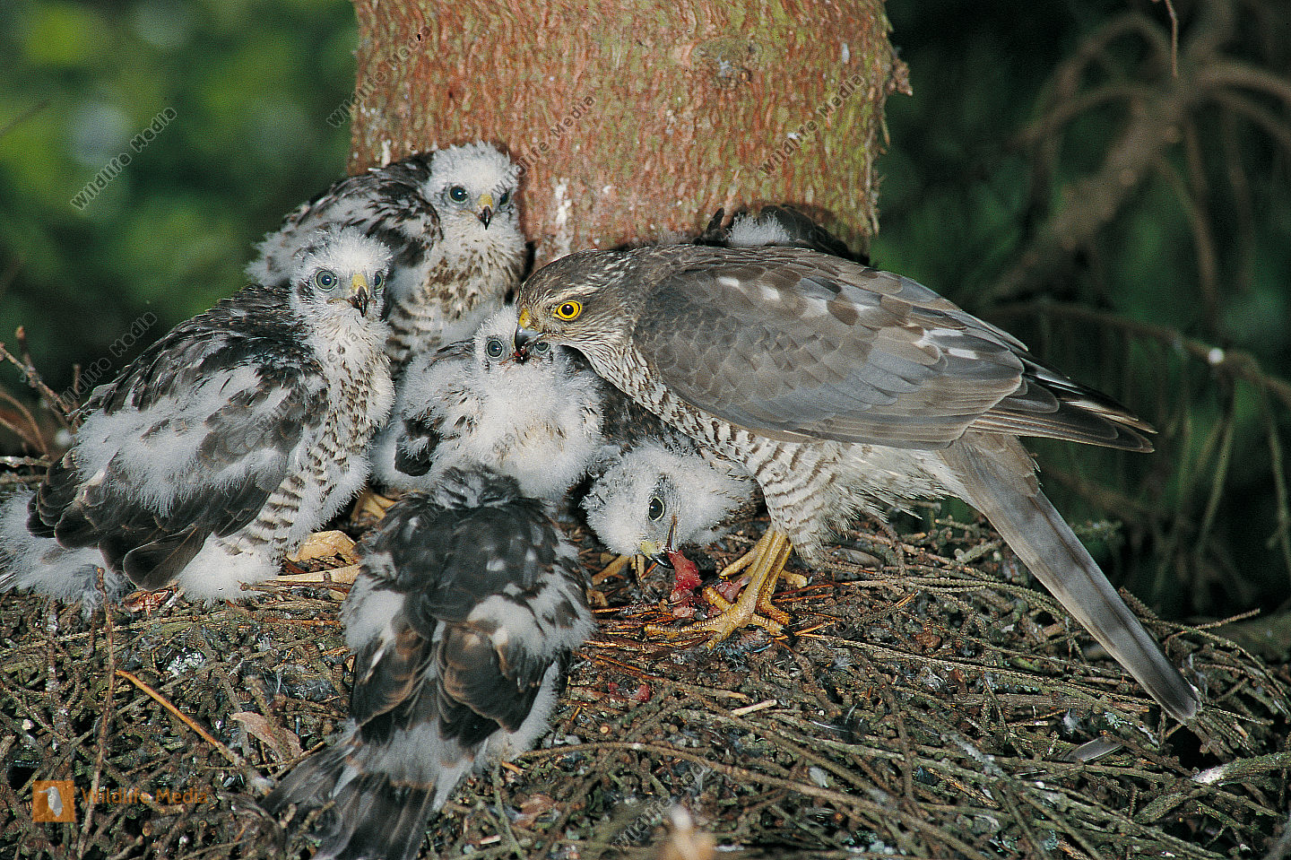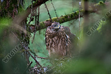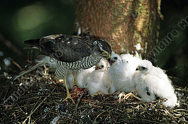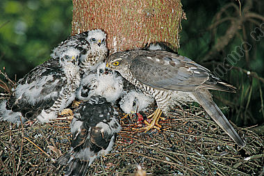 Sperber Accipiter nisus Nest Junge Weibchen hudert Jungvögel