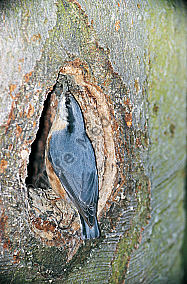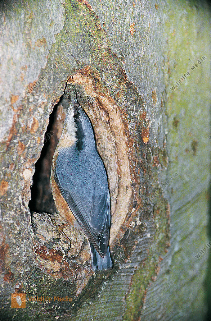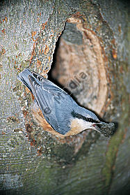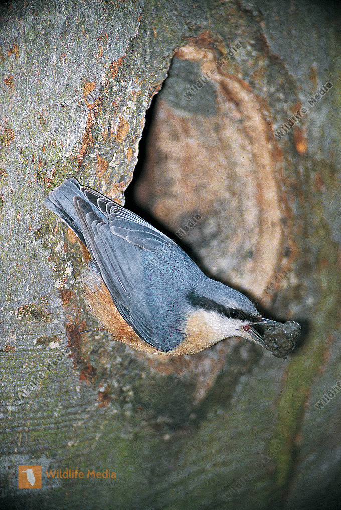 Kleiber Sitta europaea mauert Höhleneingang einer Schwarzspechthöhle zu Dryocopus martius