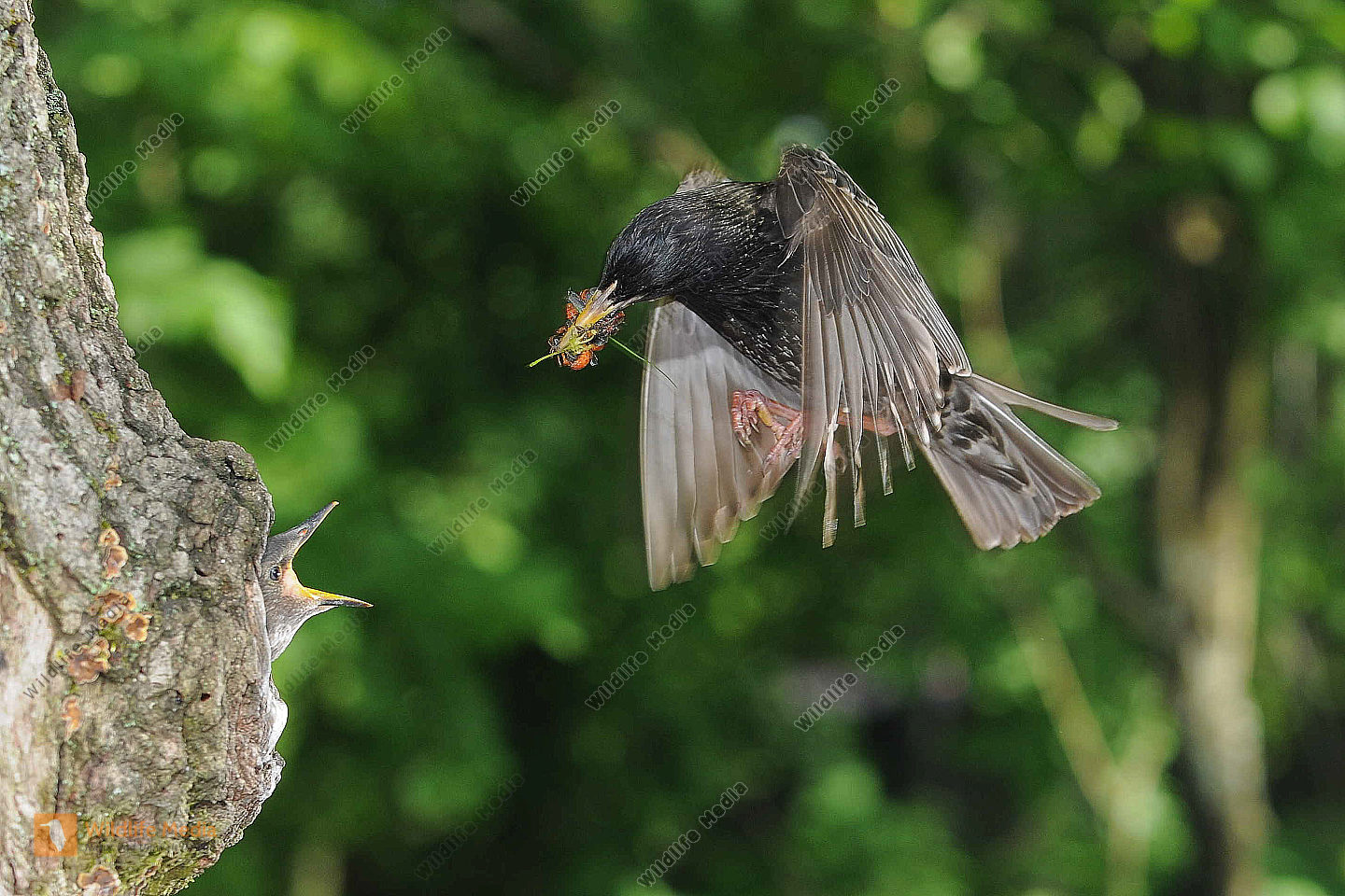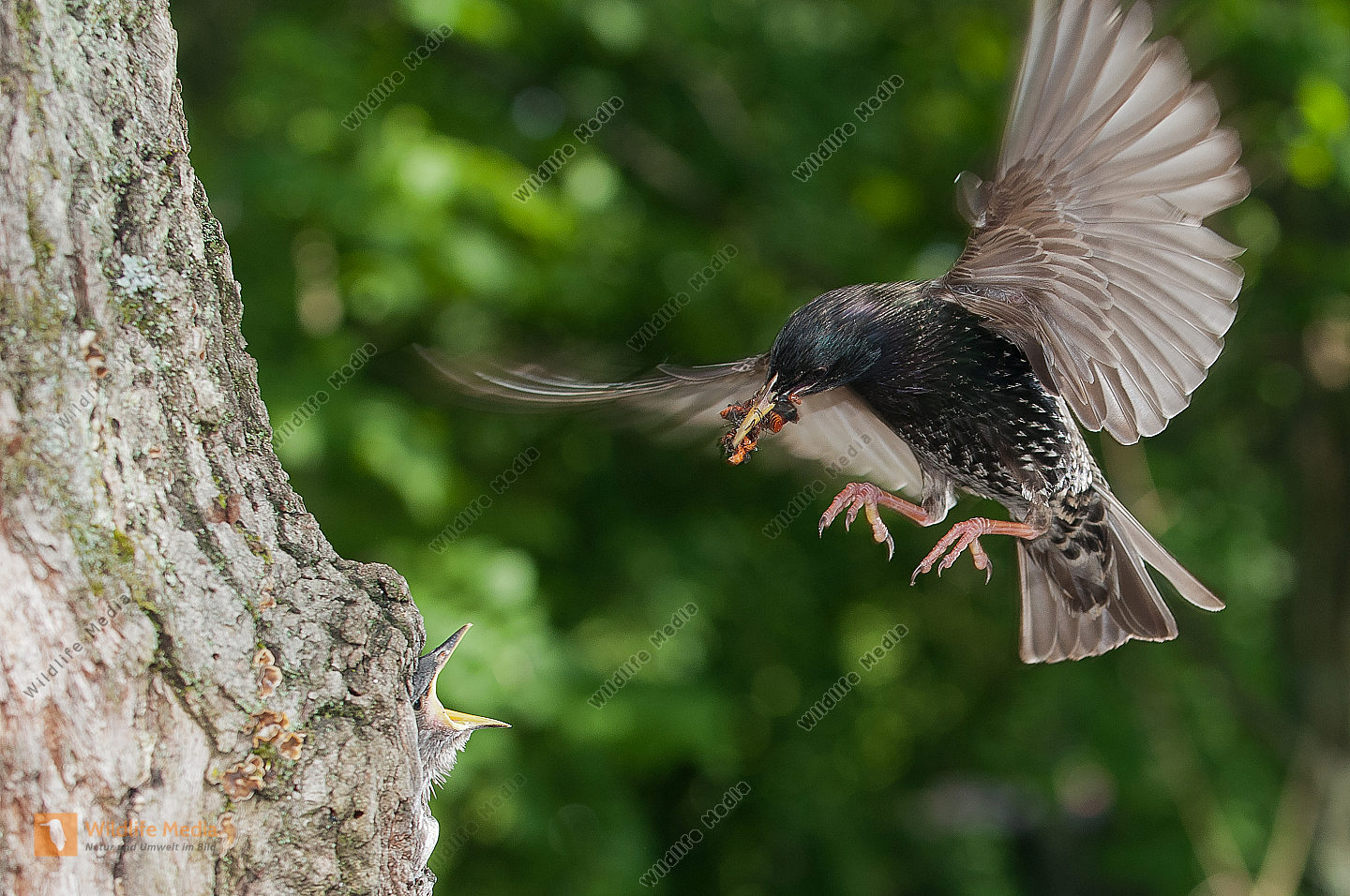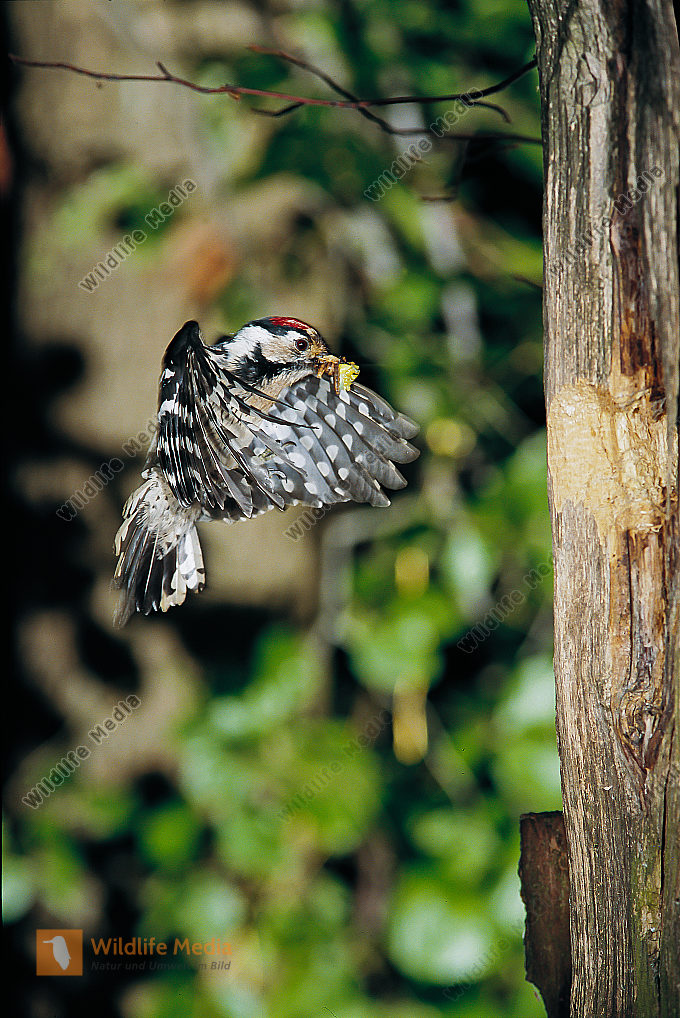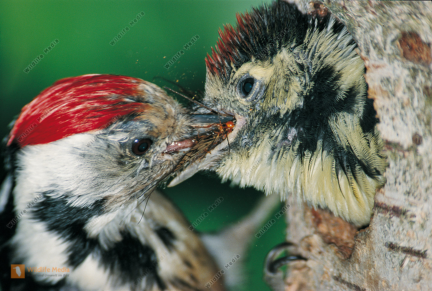 Buntspecht Dendrocopos major fast flügger Jungvogel wird von Altvogel gefüttert Distanzfütterung