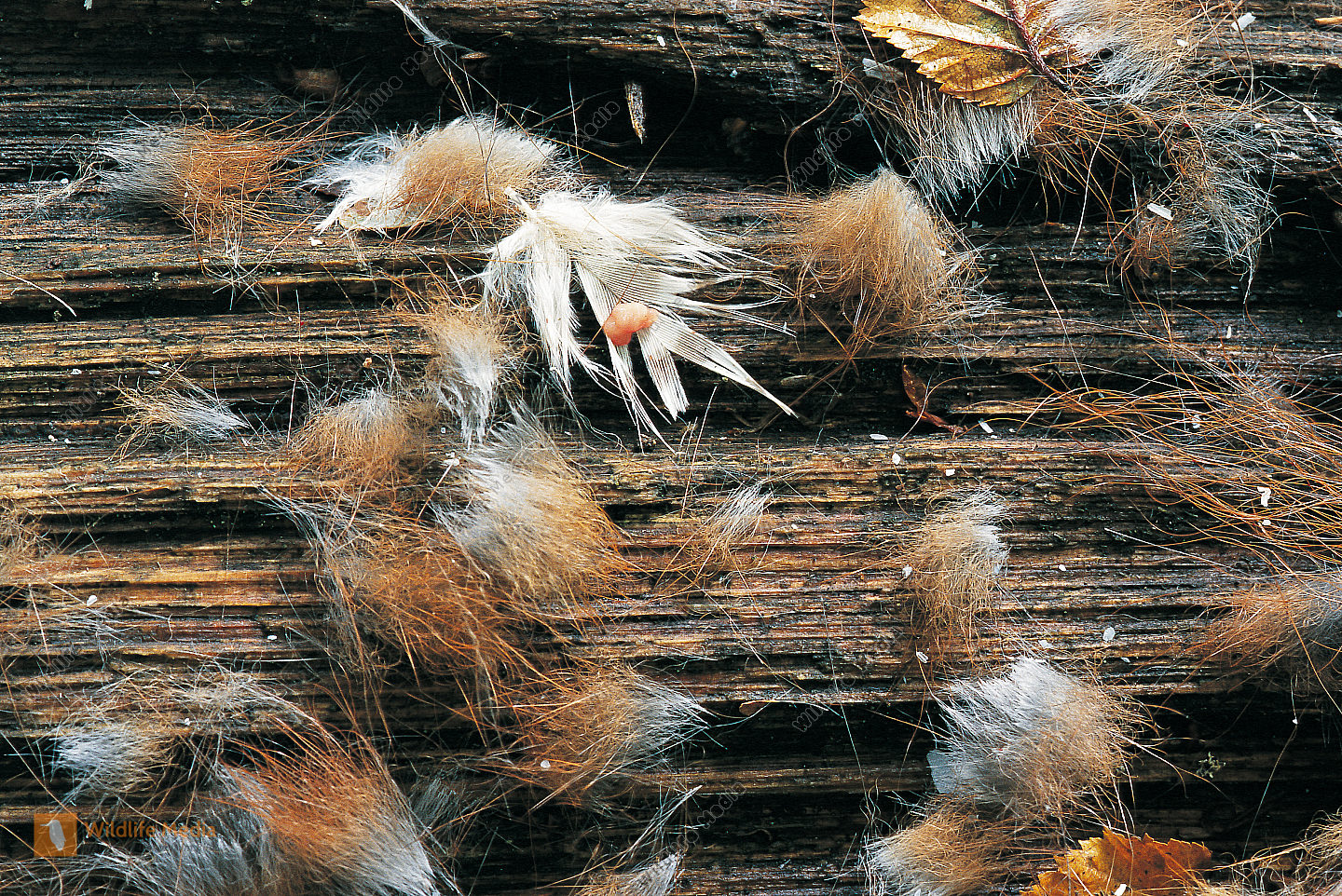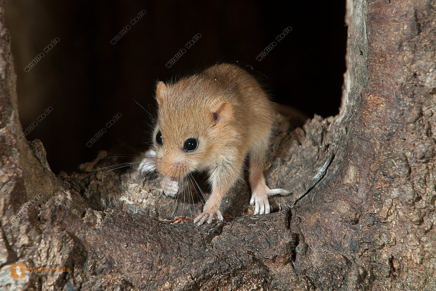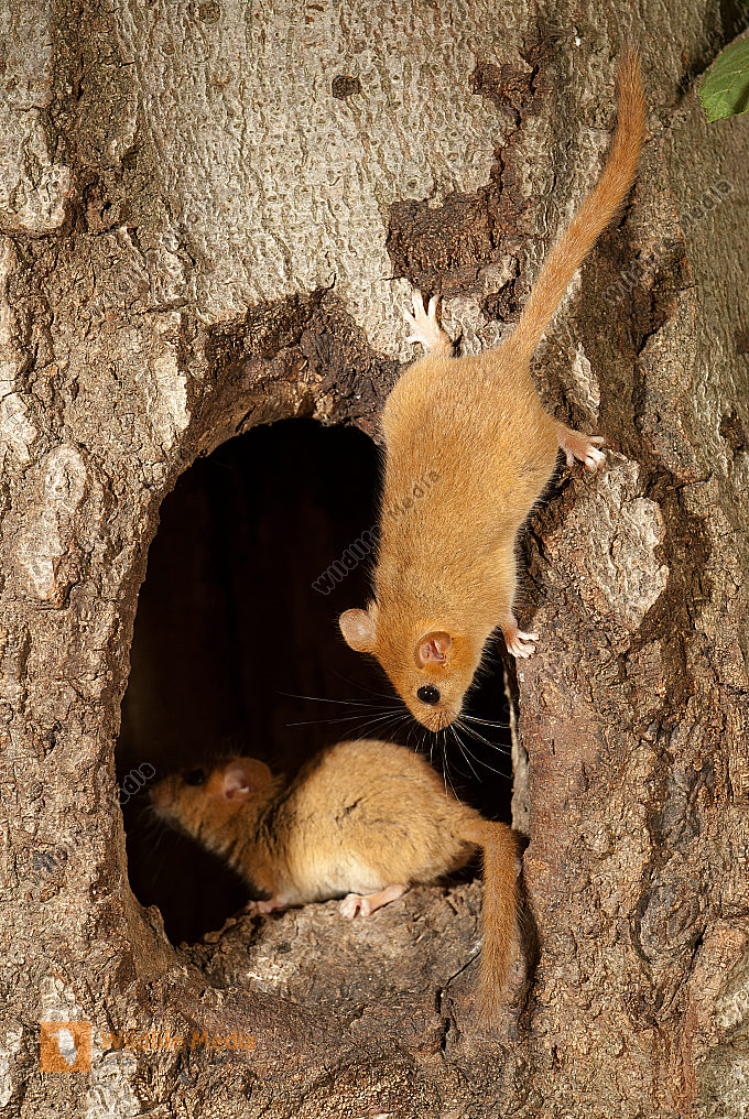 Haselmaus Muscardinus avellanarius Nest in Höhle des Schwarzspechts