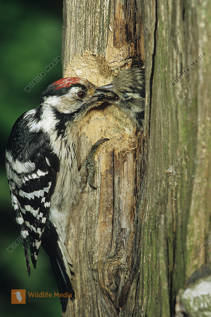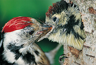 Mittelspecht Leiopicus medius Altvogel füttert fast flüggen Jungvogel