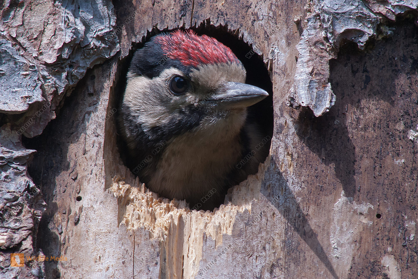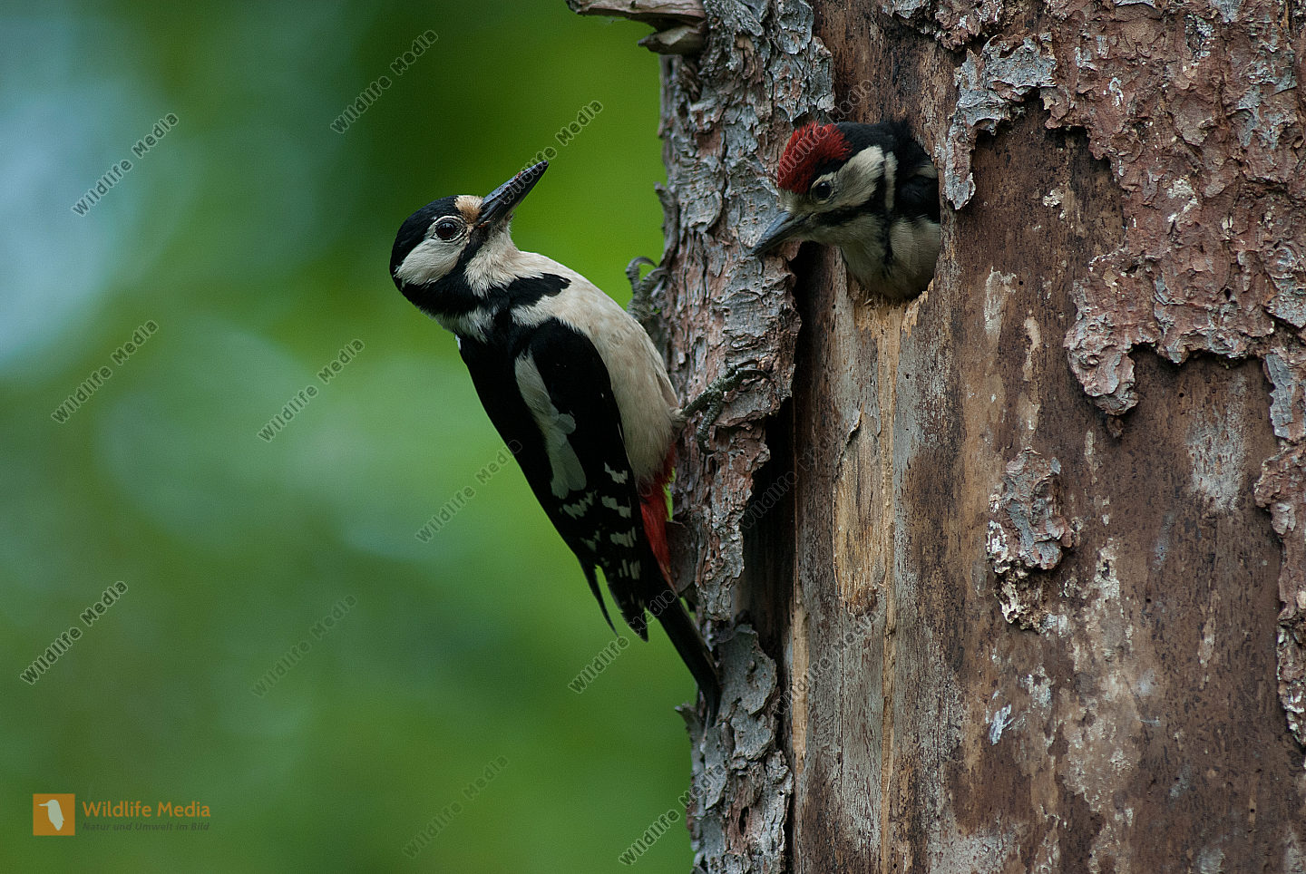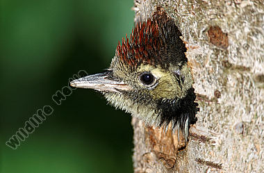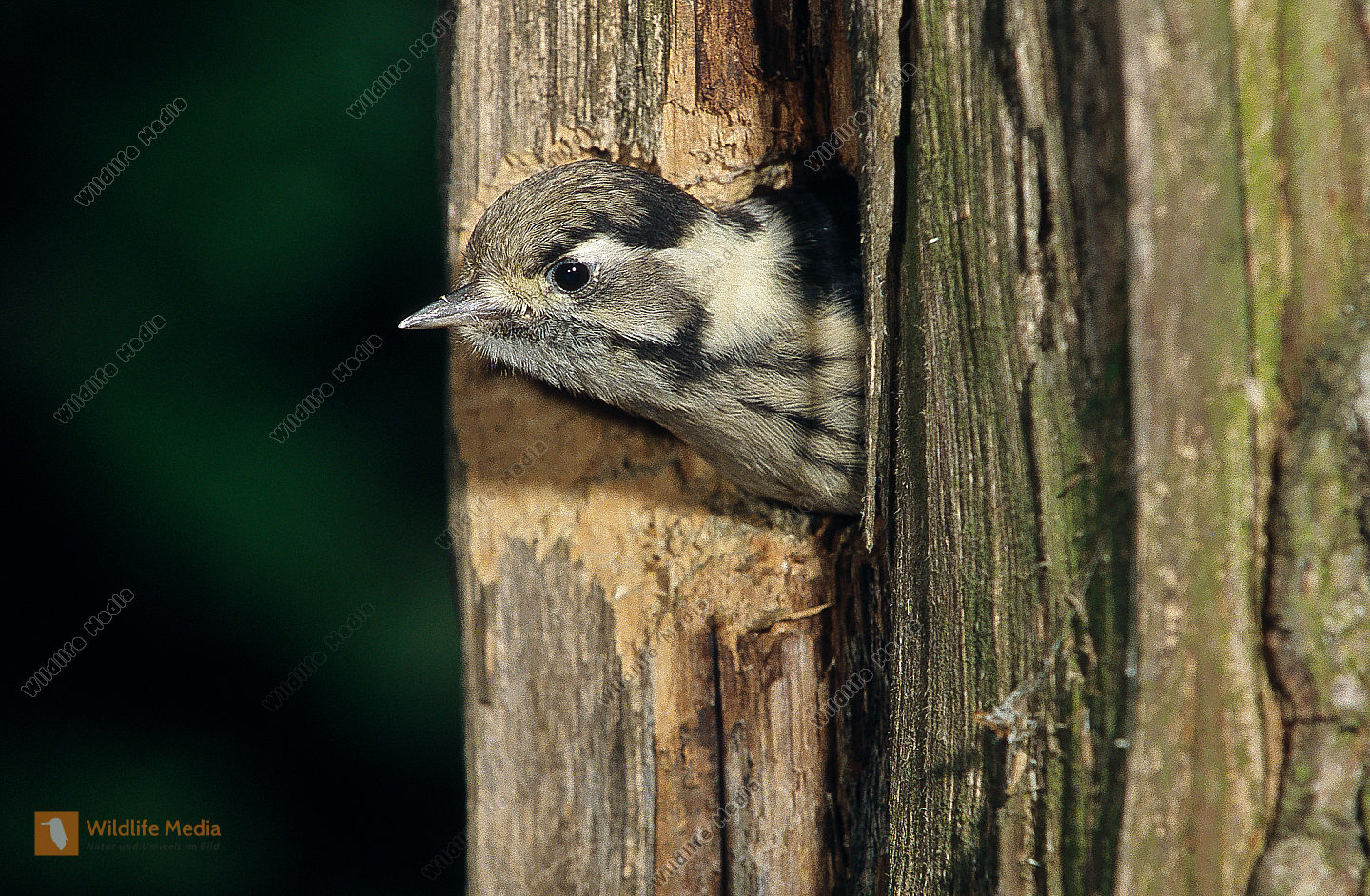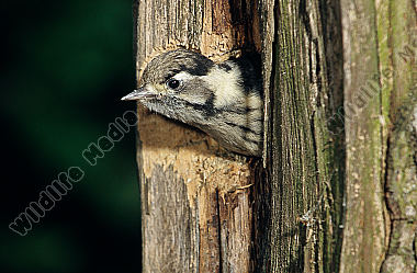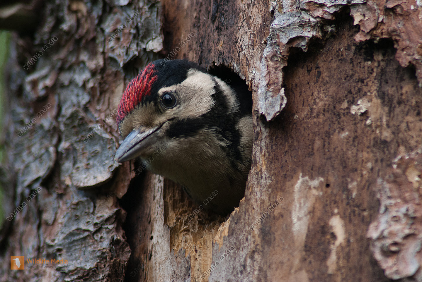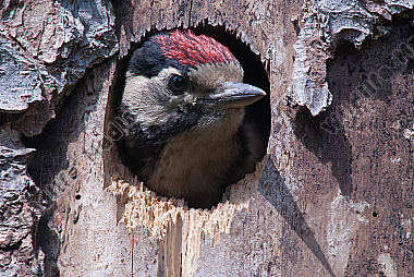 Buntspecht Dendrocopos major fast flügger Jungvogel schaut aus Höhle in Fichte