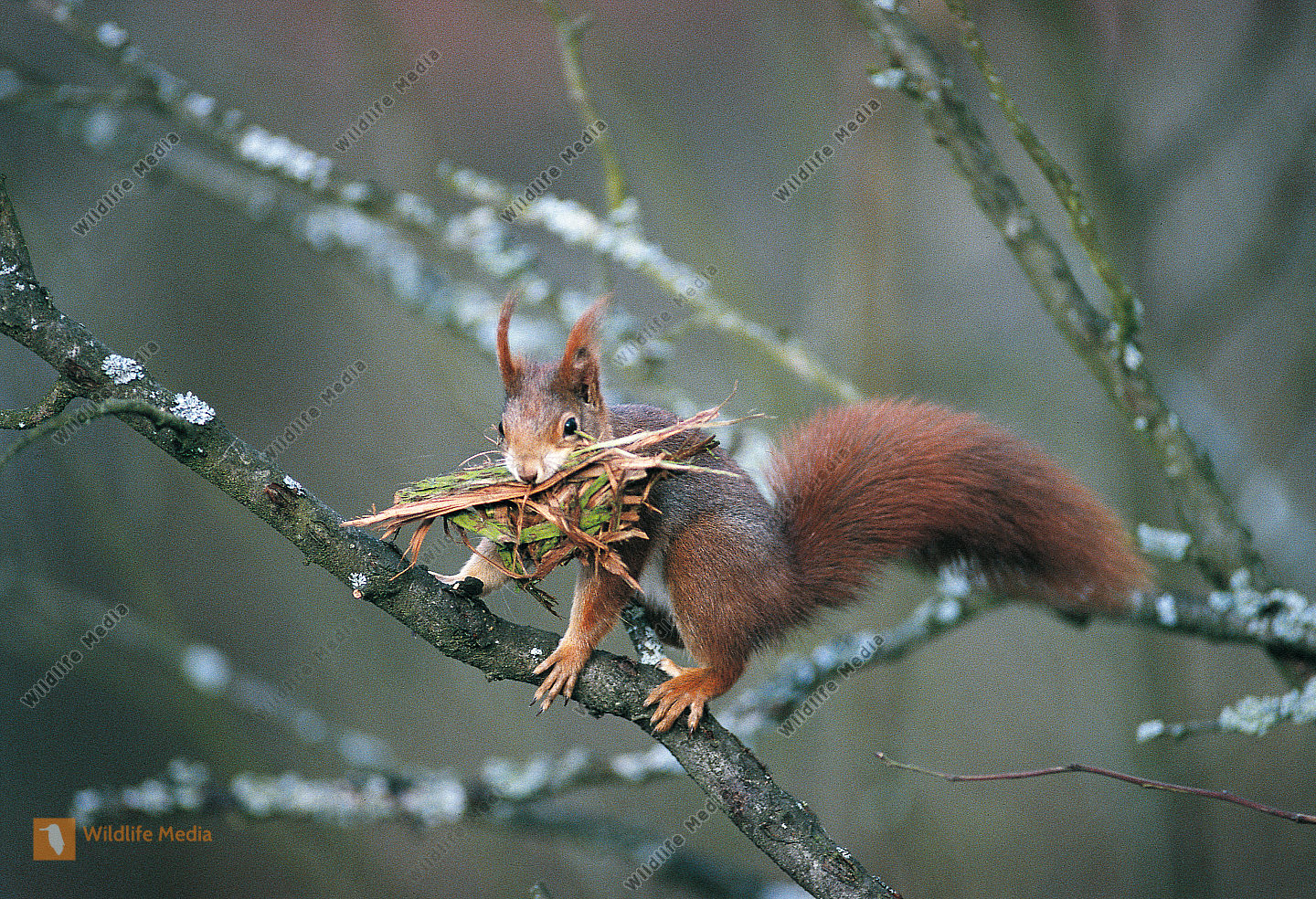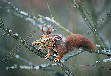 Eichhoernchen Sciurus vulgarissammelt Nistmaterial