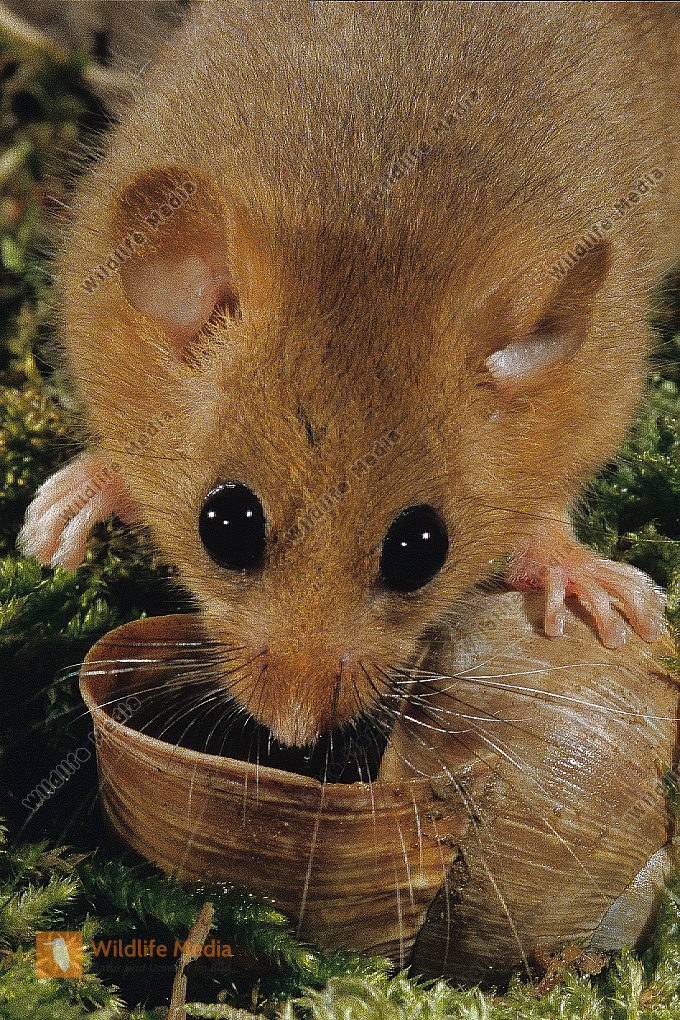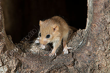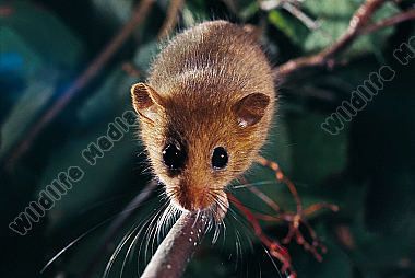 Haselmaus Muscardinus avellanarius auf Ast balancierend