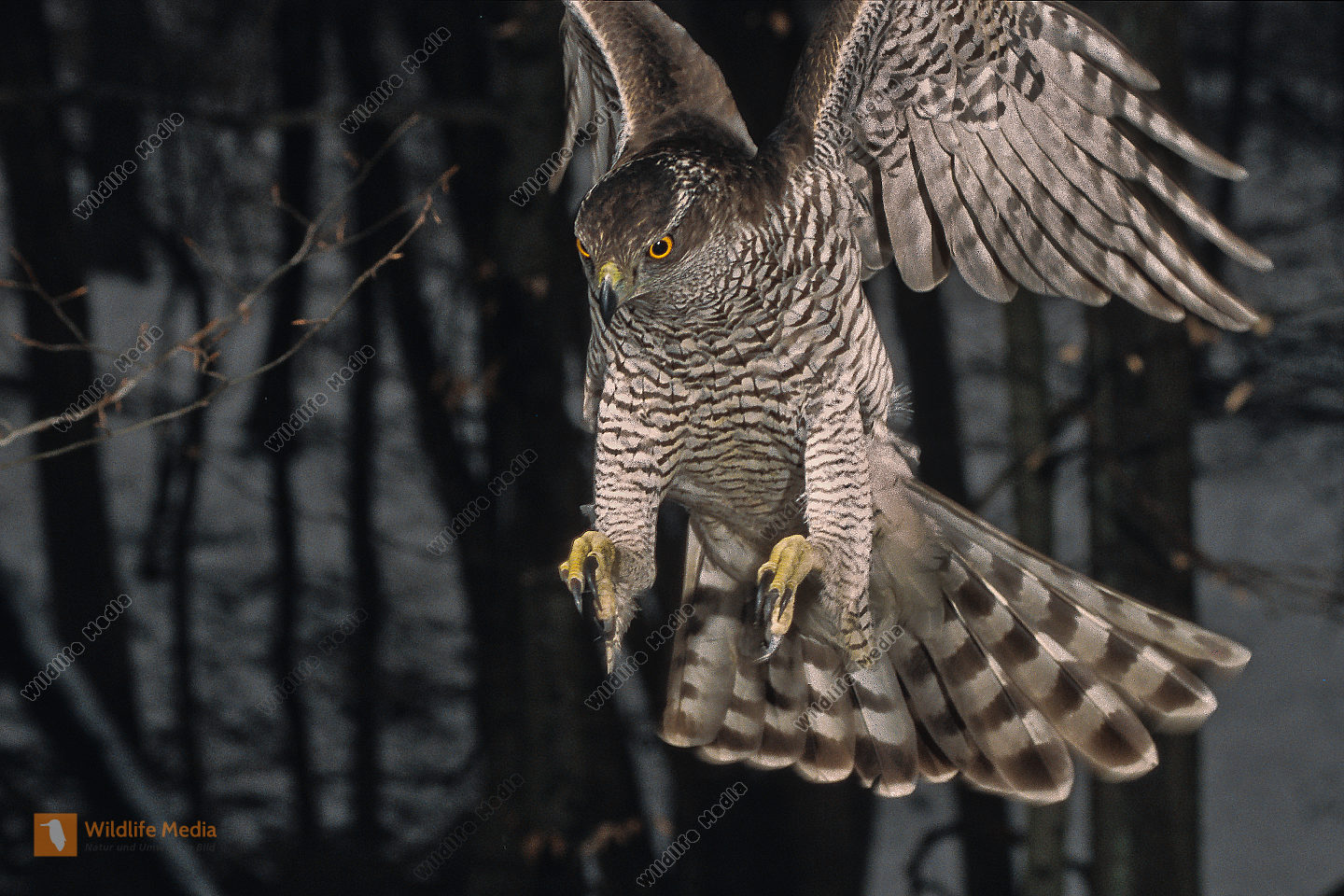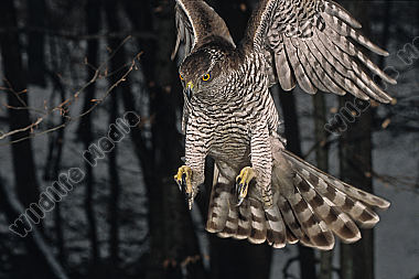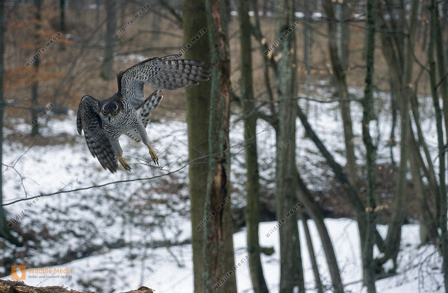 Habicht Accipiter gentilis Weibchen im Jagdflug Wald Winter