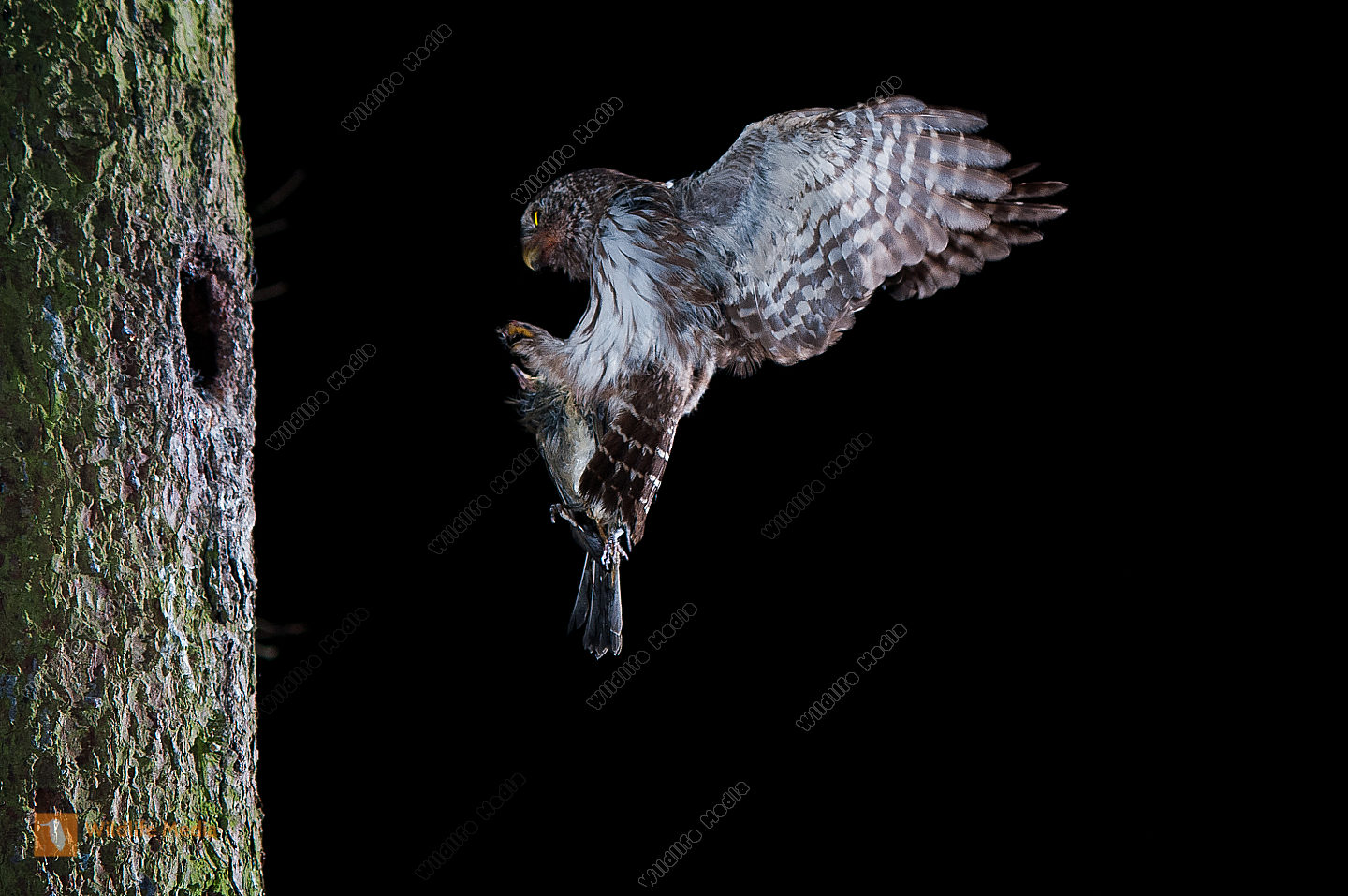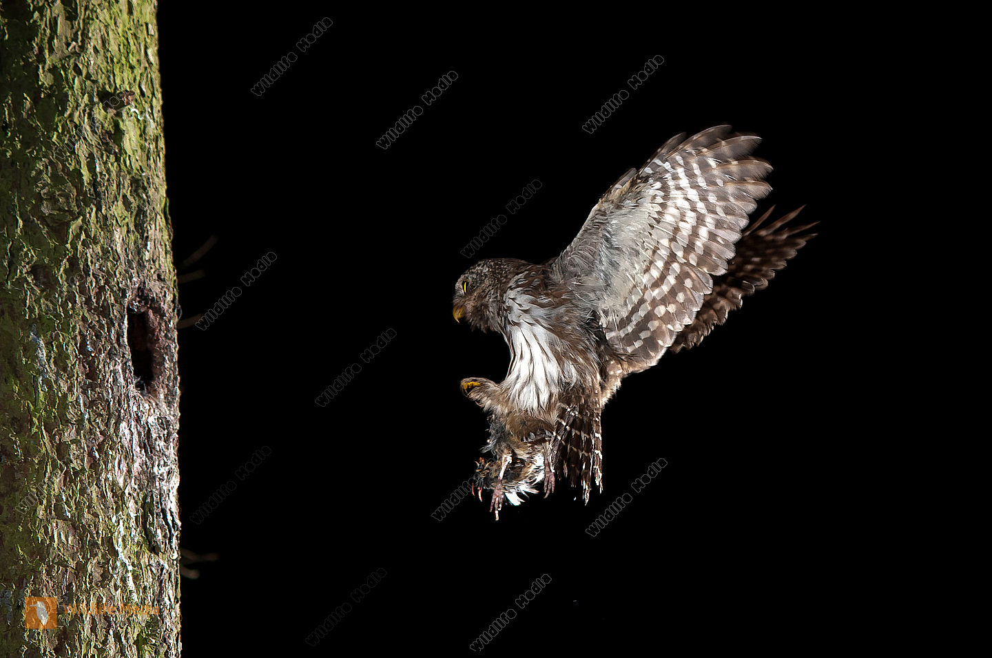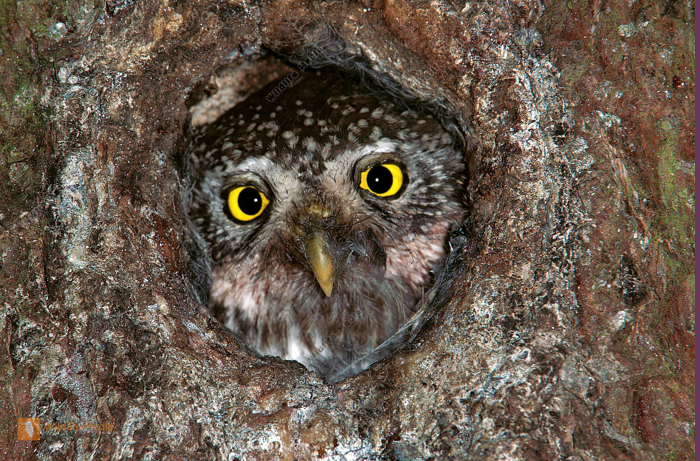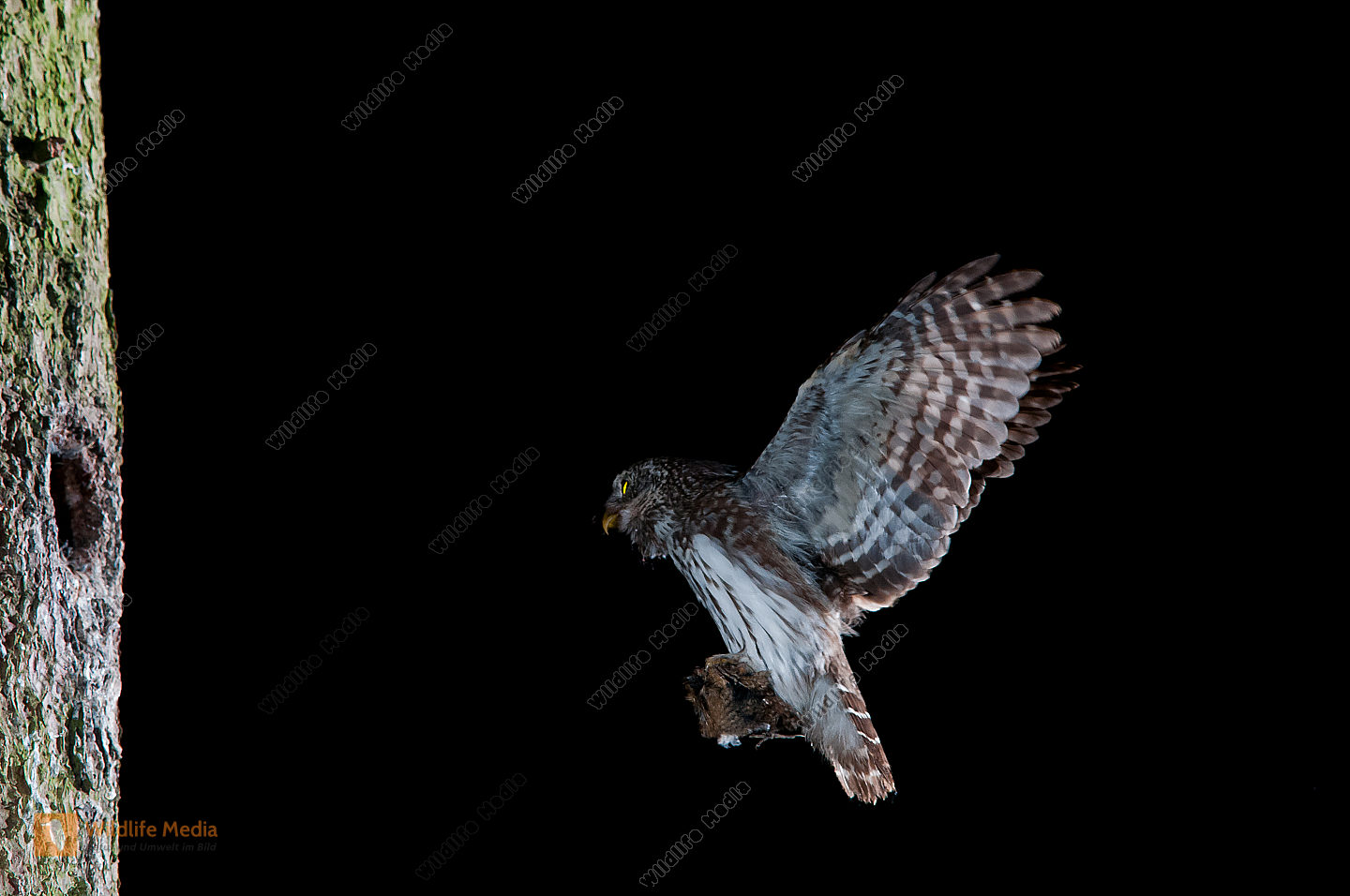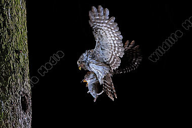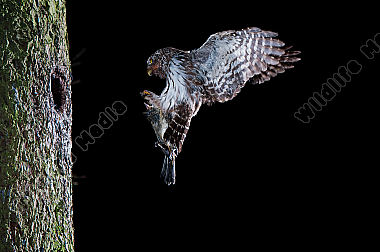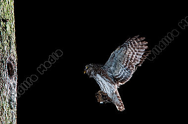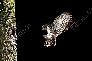Altvogel Anflug Beute Bruthöhle Eulen fütterung Glaucidium passerinum Porträt Sperlingskauz