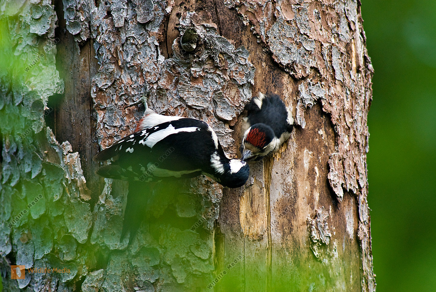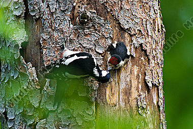 Buntspecht Dendrocopos major fast flügger Jungvogel wird von Altvogel gefüttert