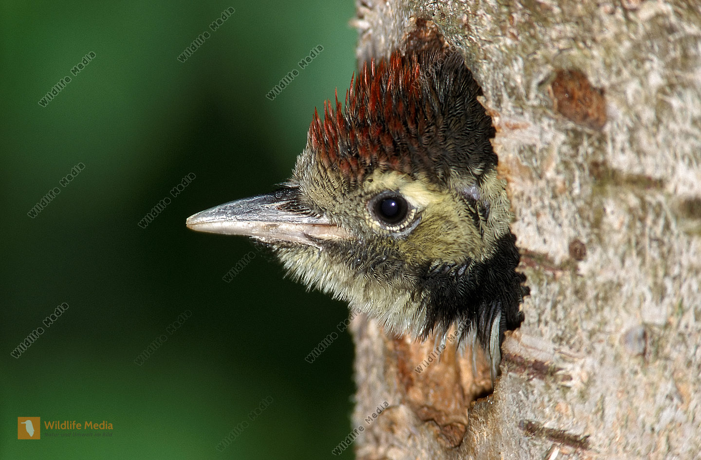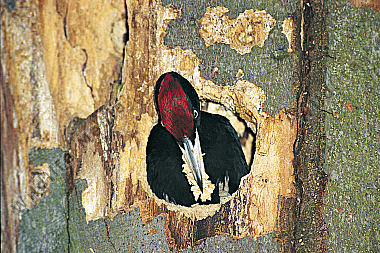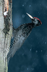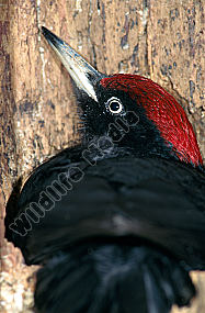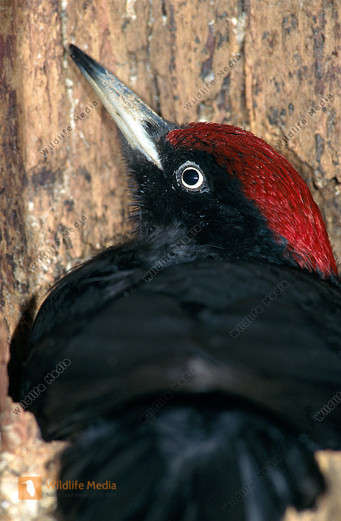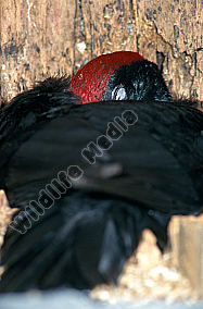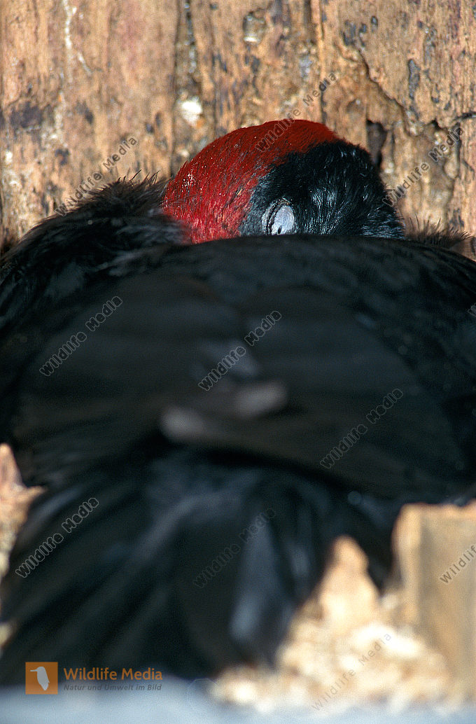 Schwarzspecht Dryocopus martius Männchen sichert während des Höhlenbaus