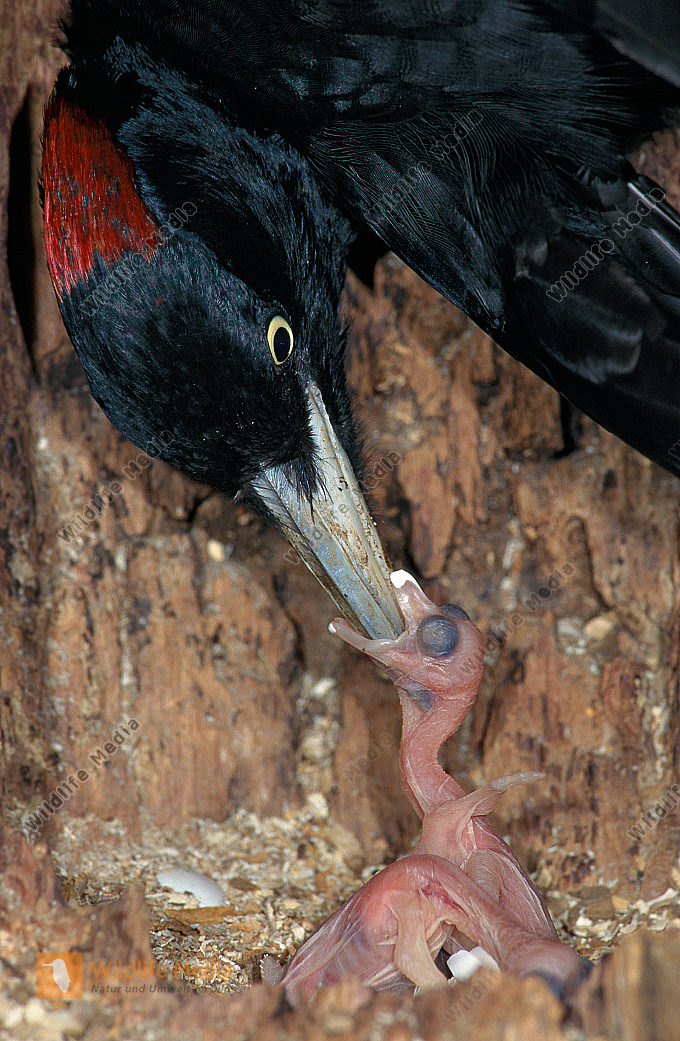 Schwarzspecht Dryocopus martius Weibchen füttert frisch geschlüpftes Küken