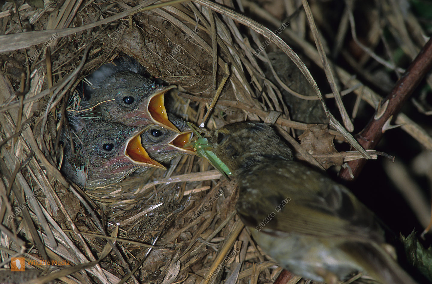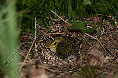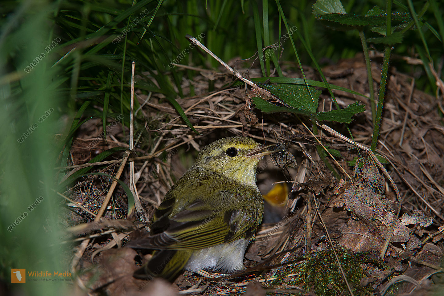 Waldlaubsänger Phylloscopus sibilatrix Nest Fütterung Wald Boden Tarnung