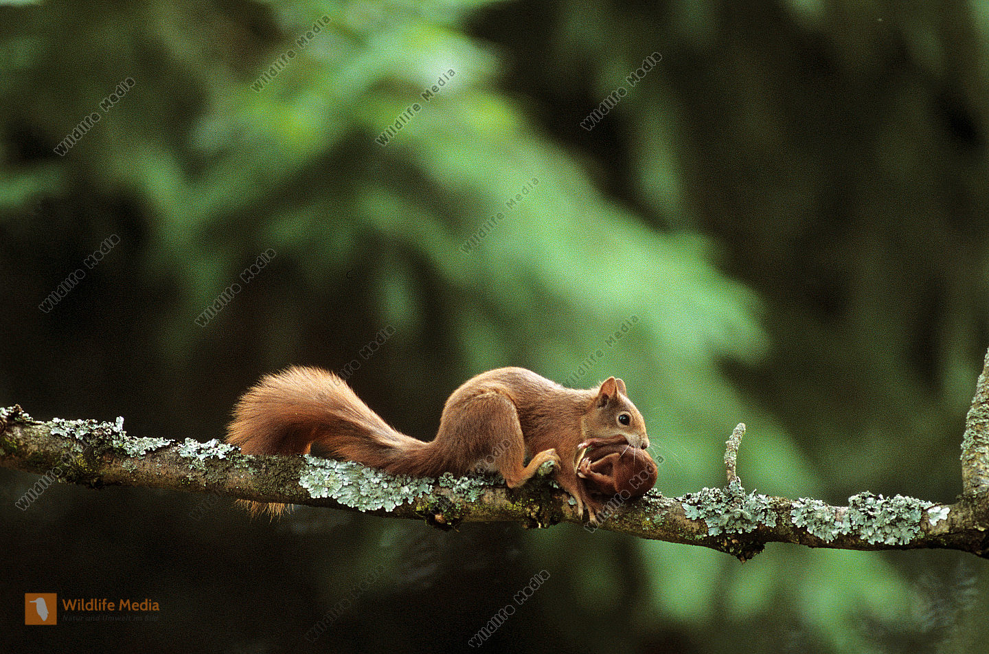 Eichhoernchen Sciurus vulgaris transportiert Junges