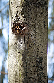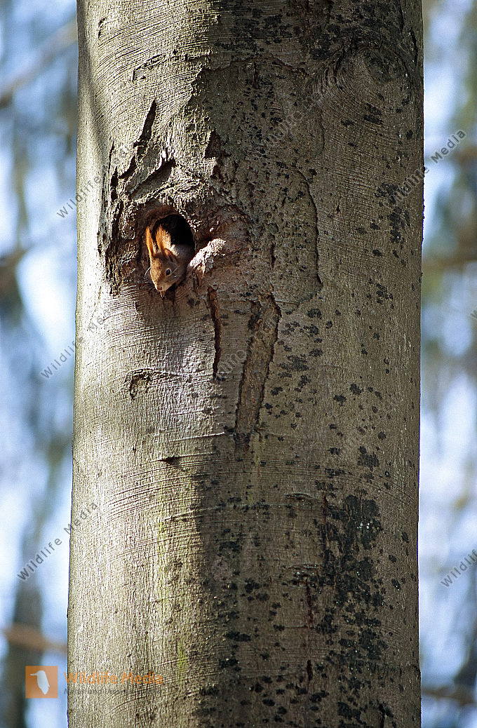 Eichhoernchen Höhle Rotbuche Schwarzspecht Sciurus vulgaris