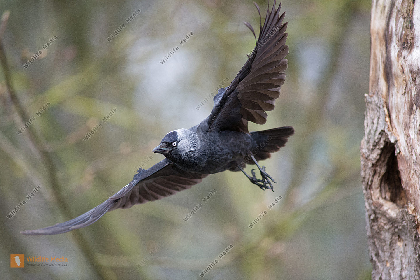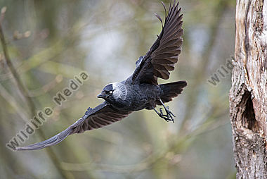 Dohle Corvus monedula fliegt aus einer Höhle des Schwarzspechtes Dryocopus martius