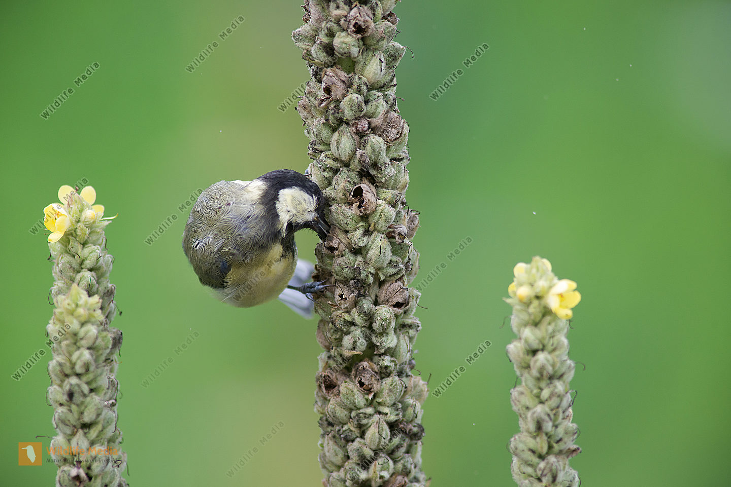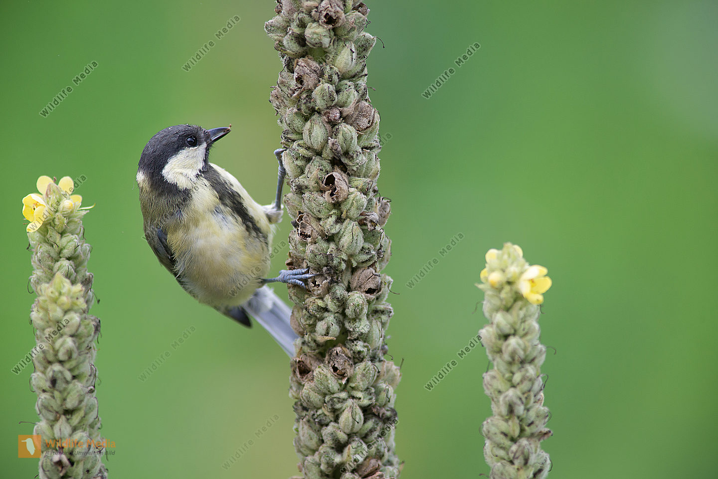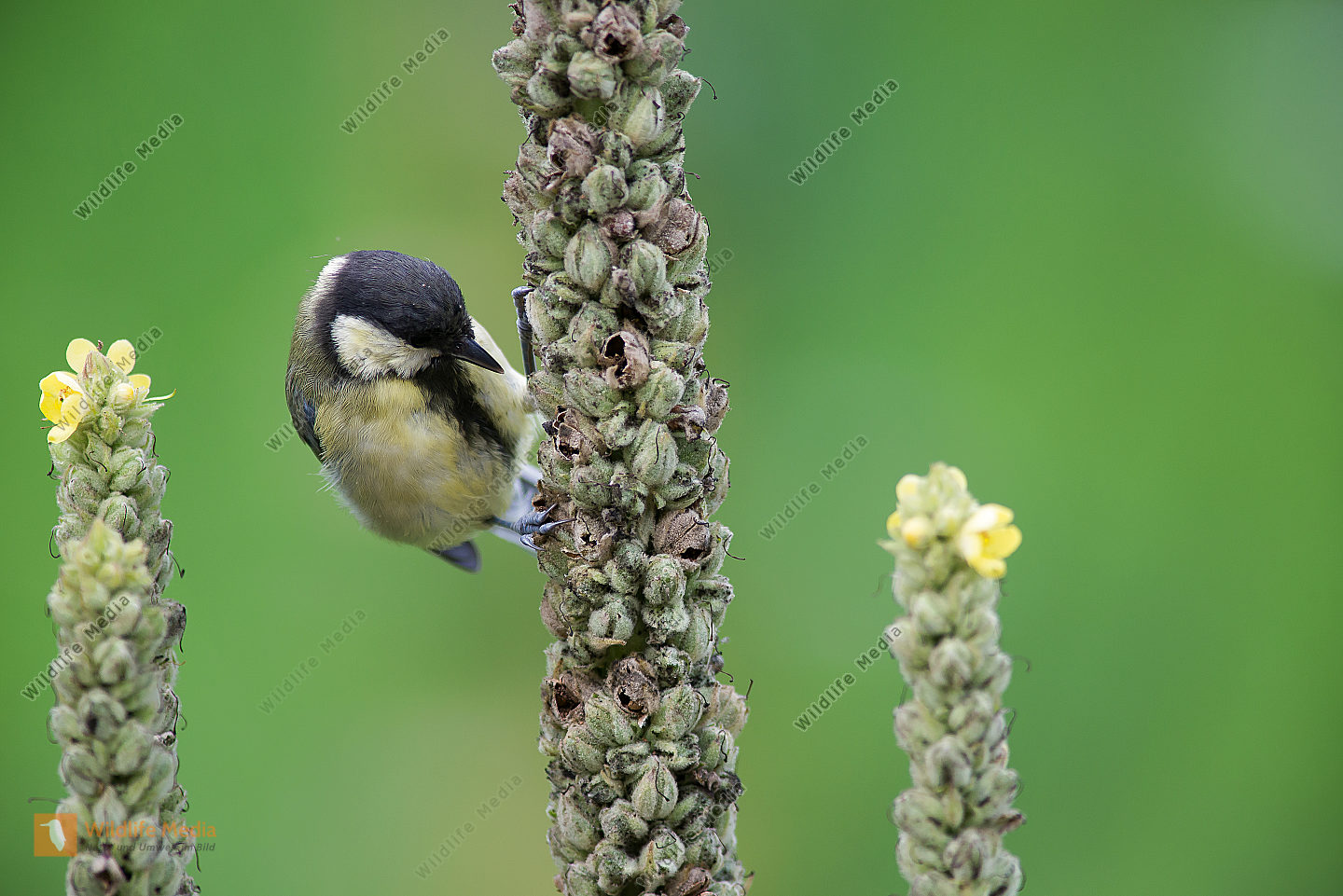 Kohlmeise Parus major frisst an Königskerze Verbascum thapsus