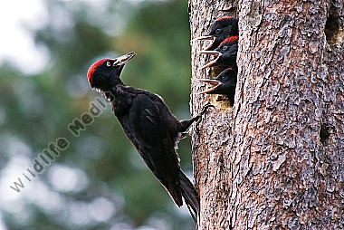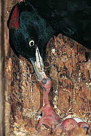 Schwarzspecht Dryocopus martius Weibchen füttert frisch geschlüpfte Junge