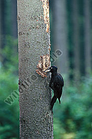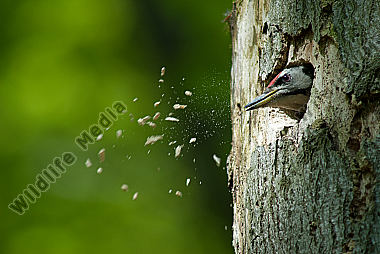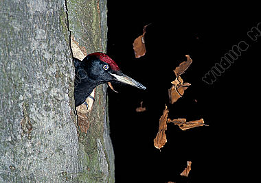 Schwarzspecht Dryocopus martius Männchen wirft Späne aus der Bruthöhle Nestbau