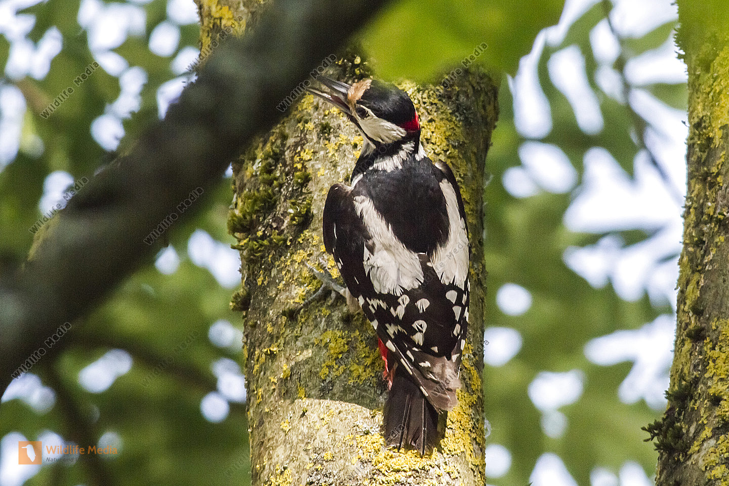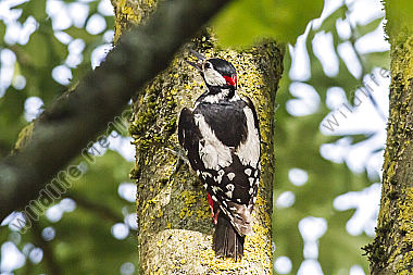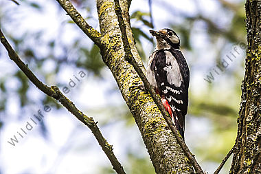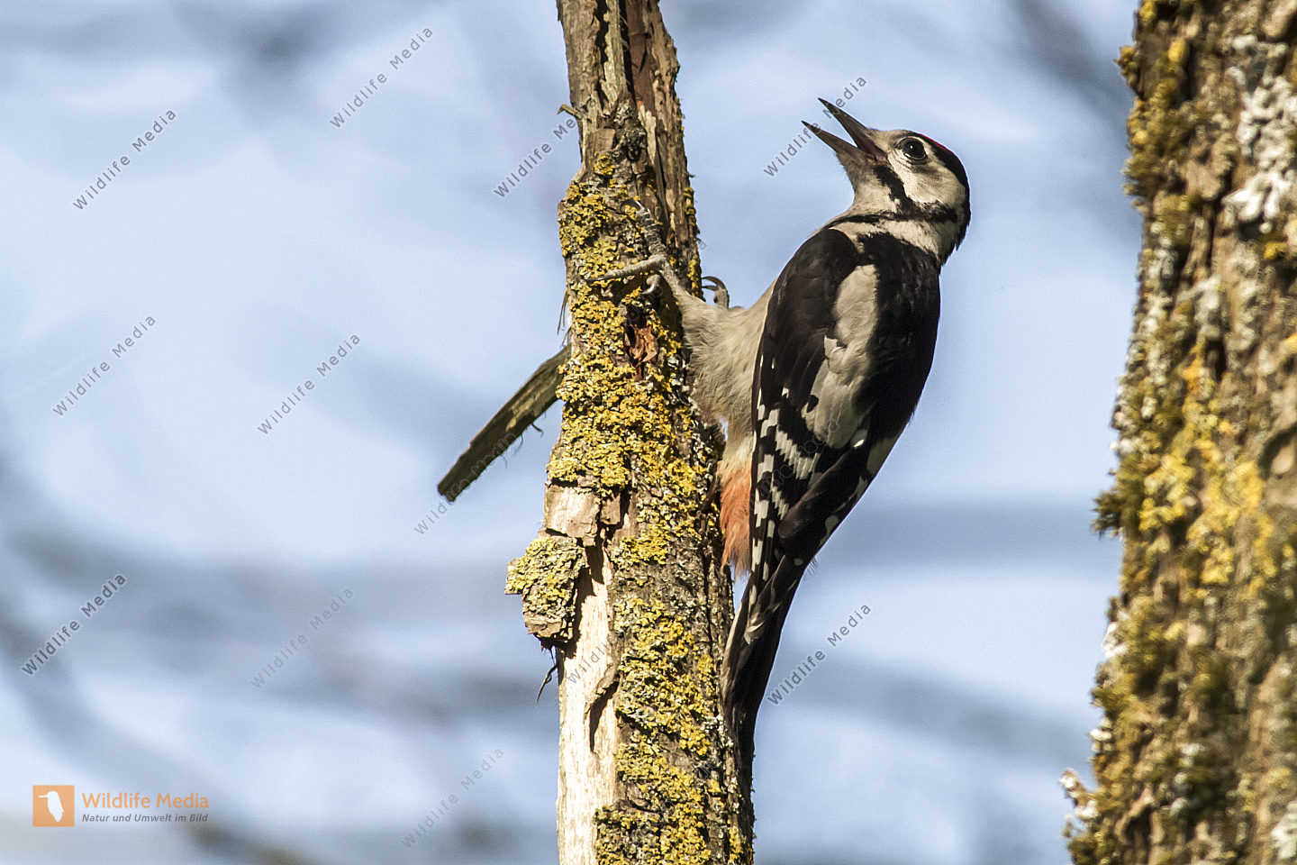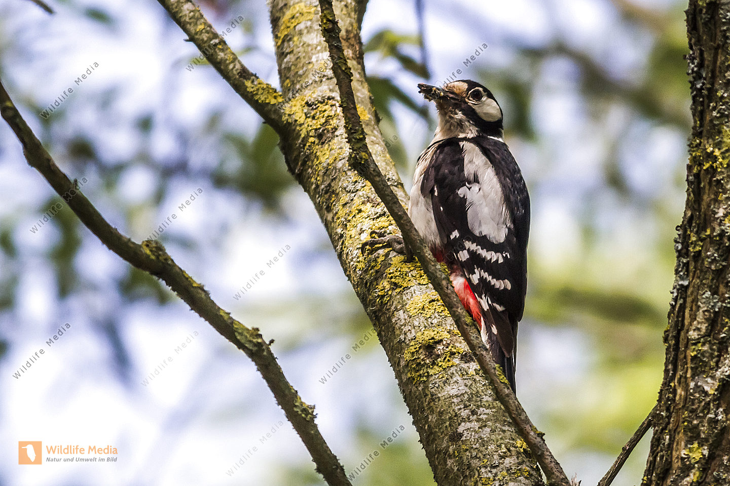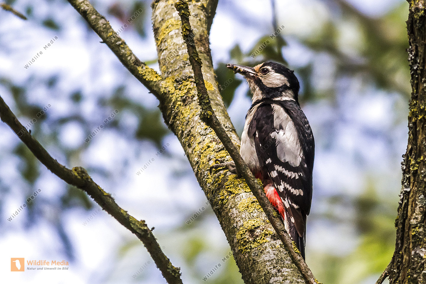 Ein Buntspecht am Baumstamm sucht nach Nahrung