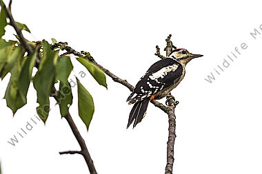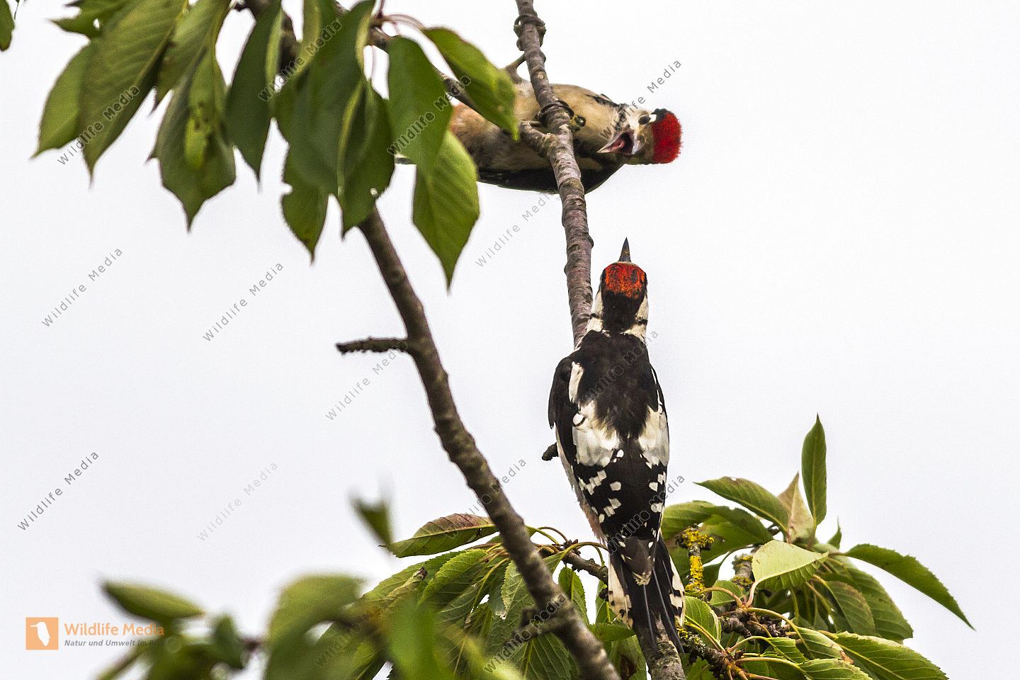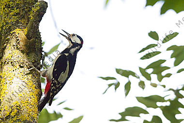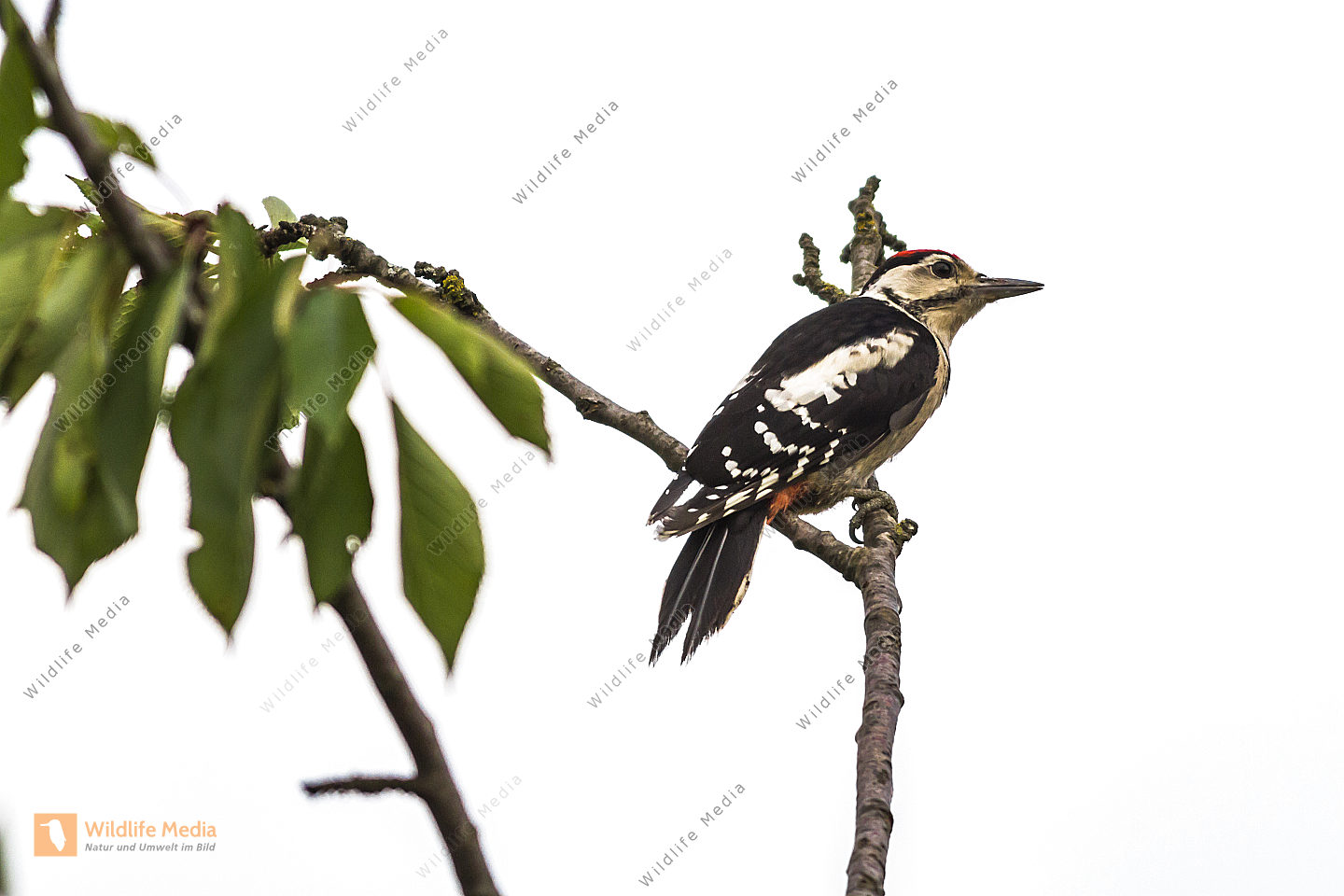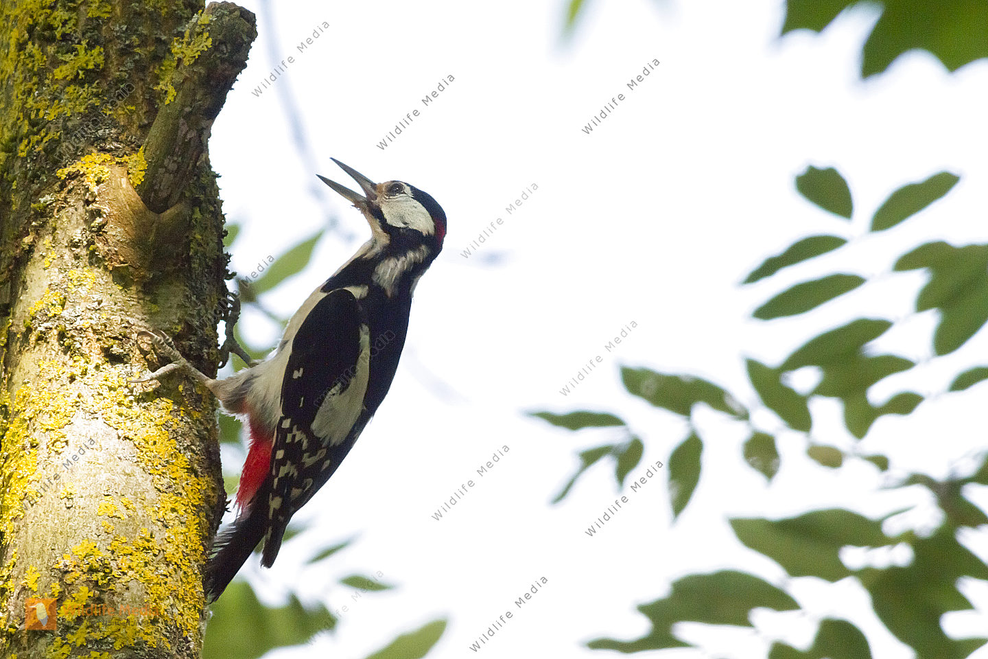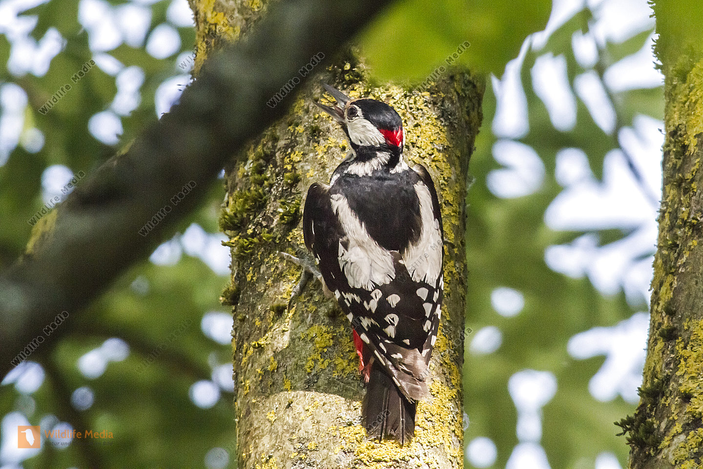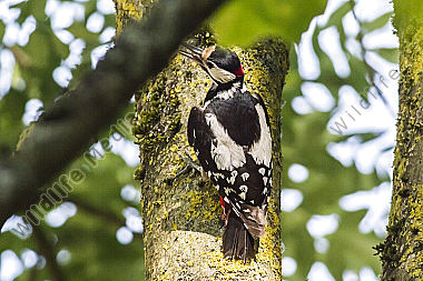 Ein Buntspecht am Baumstamm sucht nach Nahrung