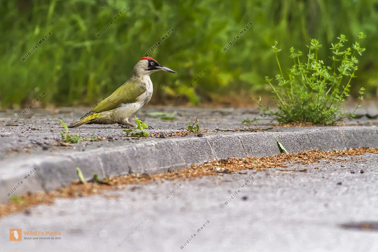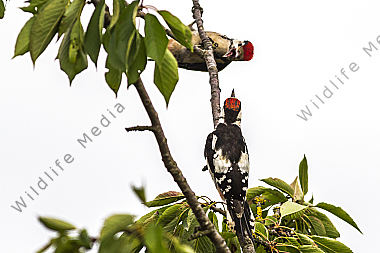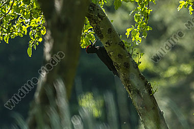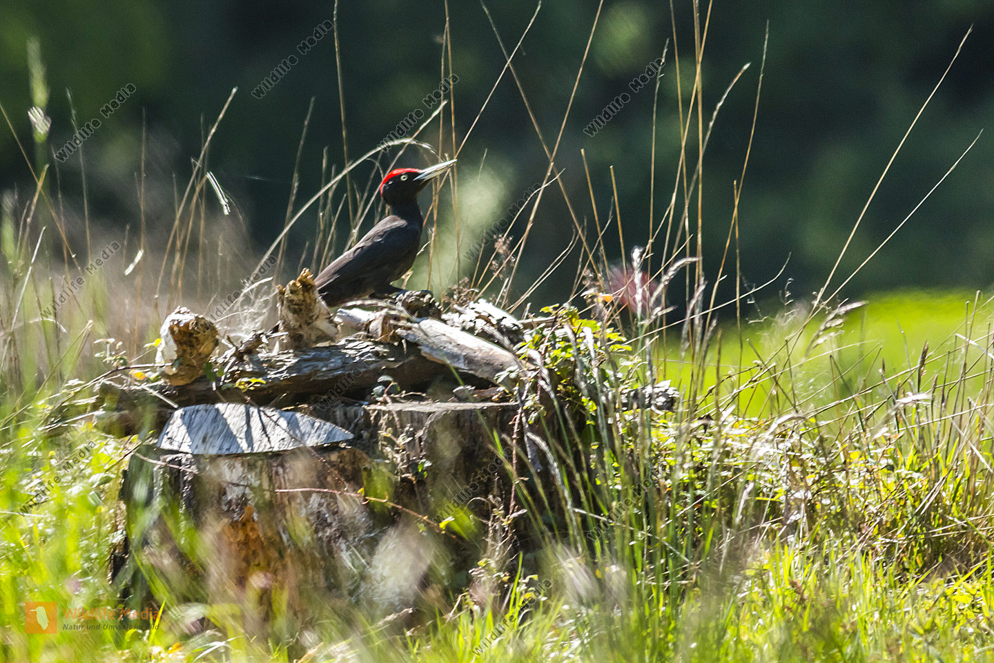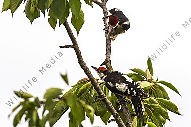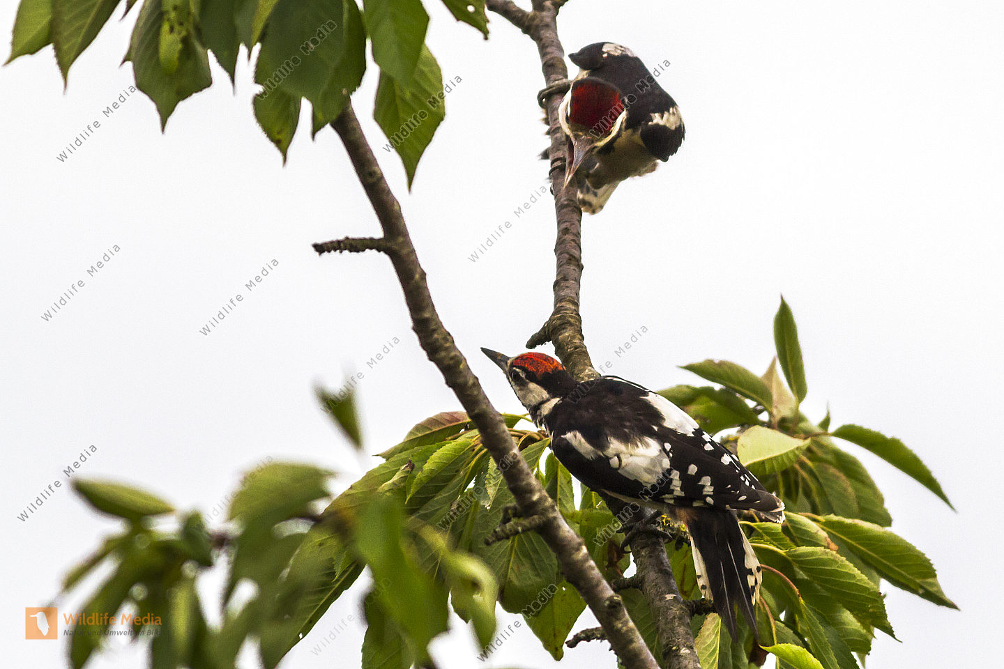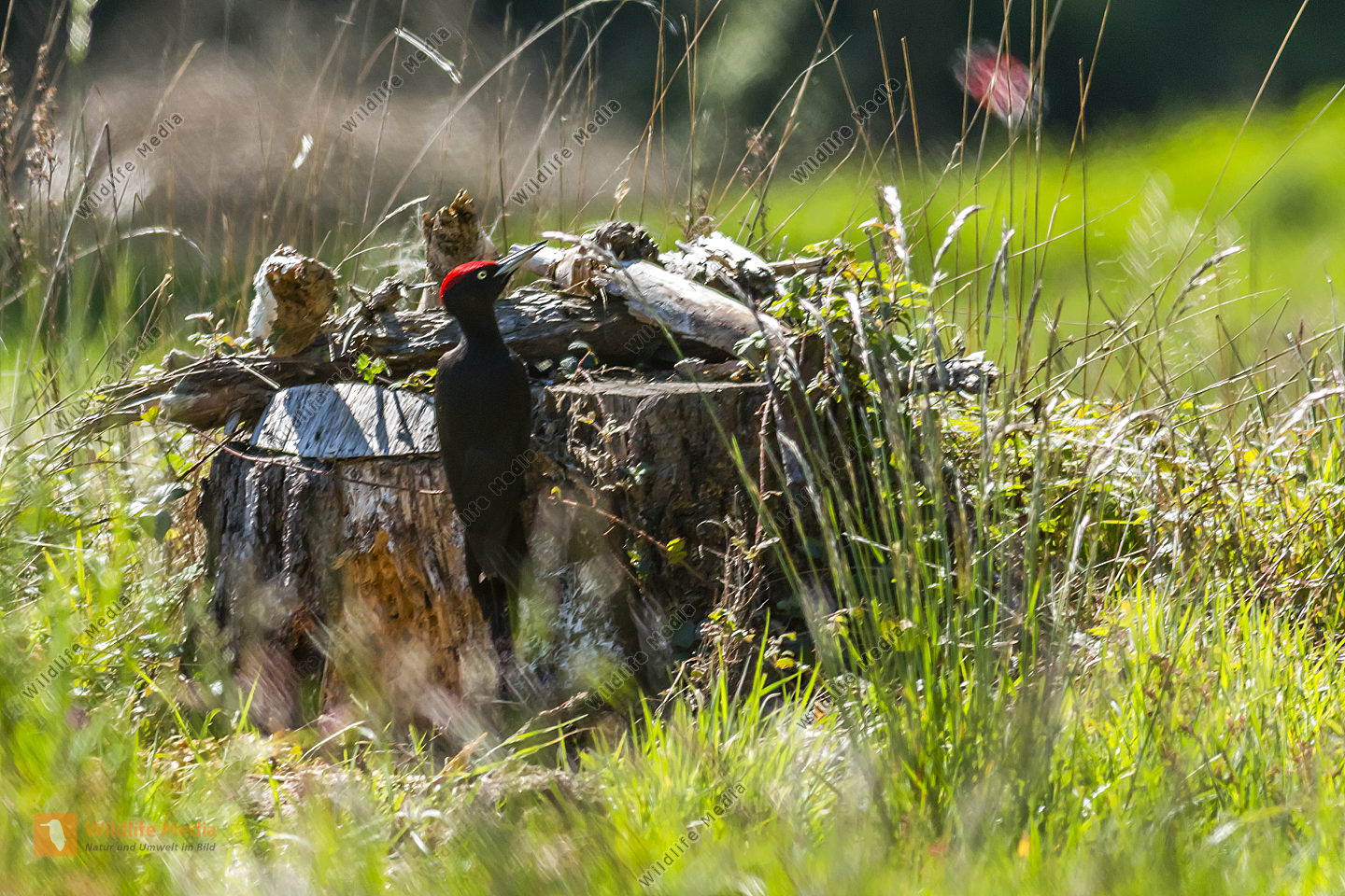 Ein Buntspecht am Baumstamm sucht nach Nahrung