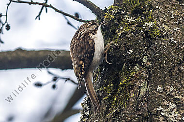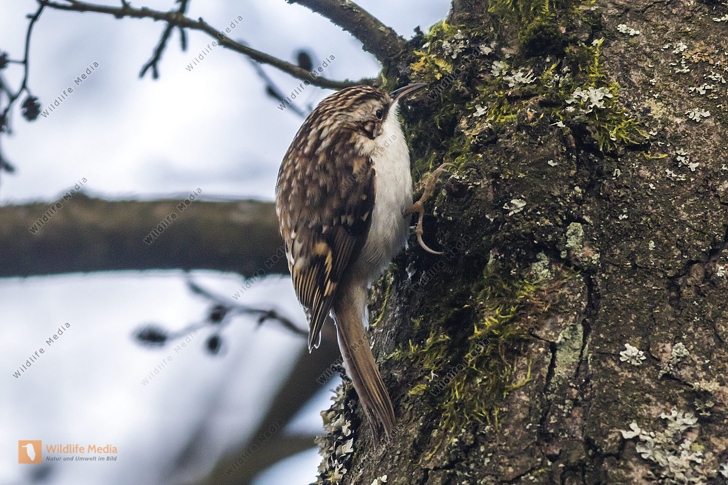 Ein Gartenbaumläufer auf Futtersuche am Baumstamm