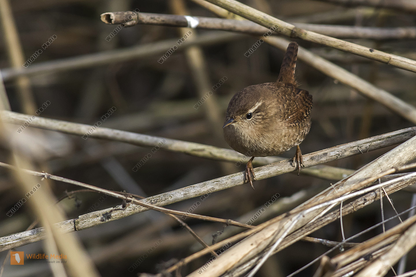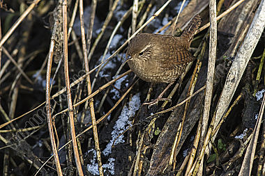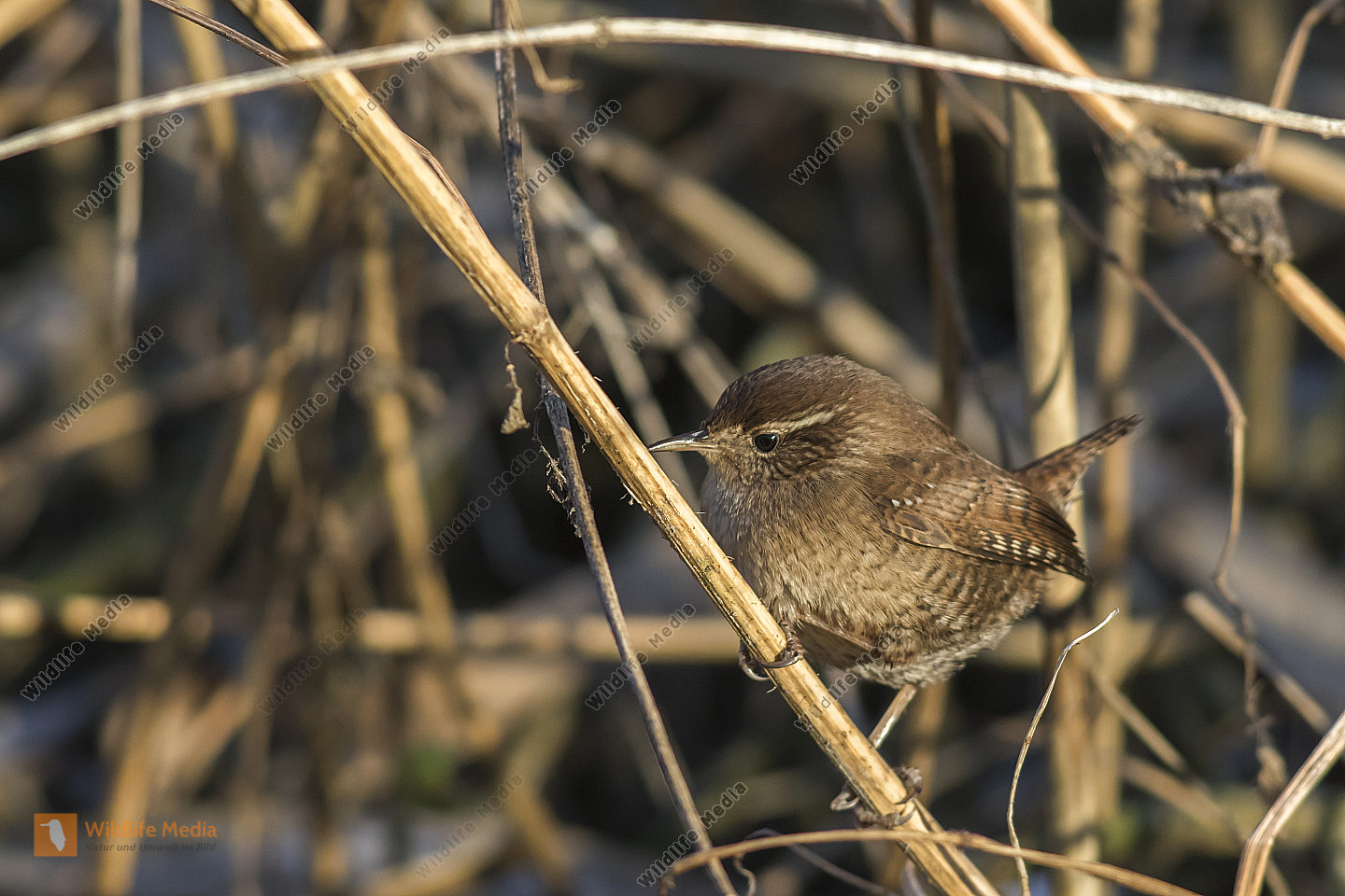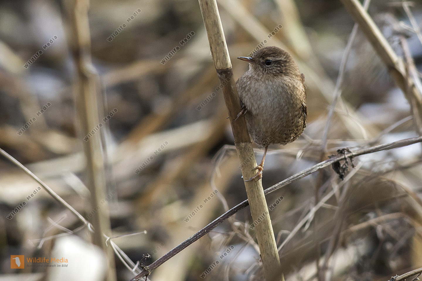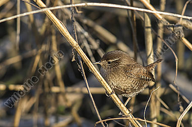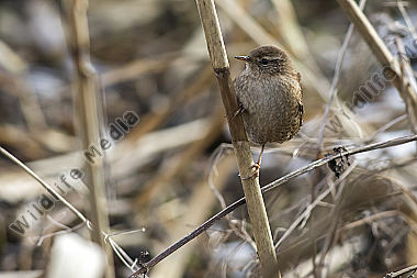 Ein Zaunkönig im Schilf eines Bachufers