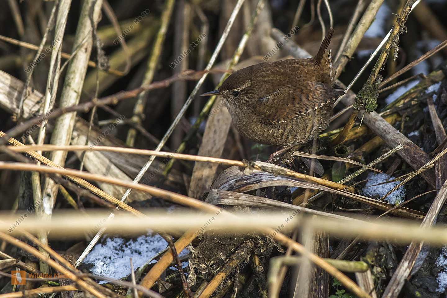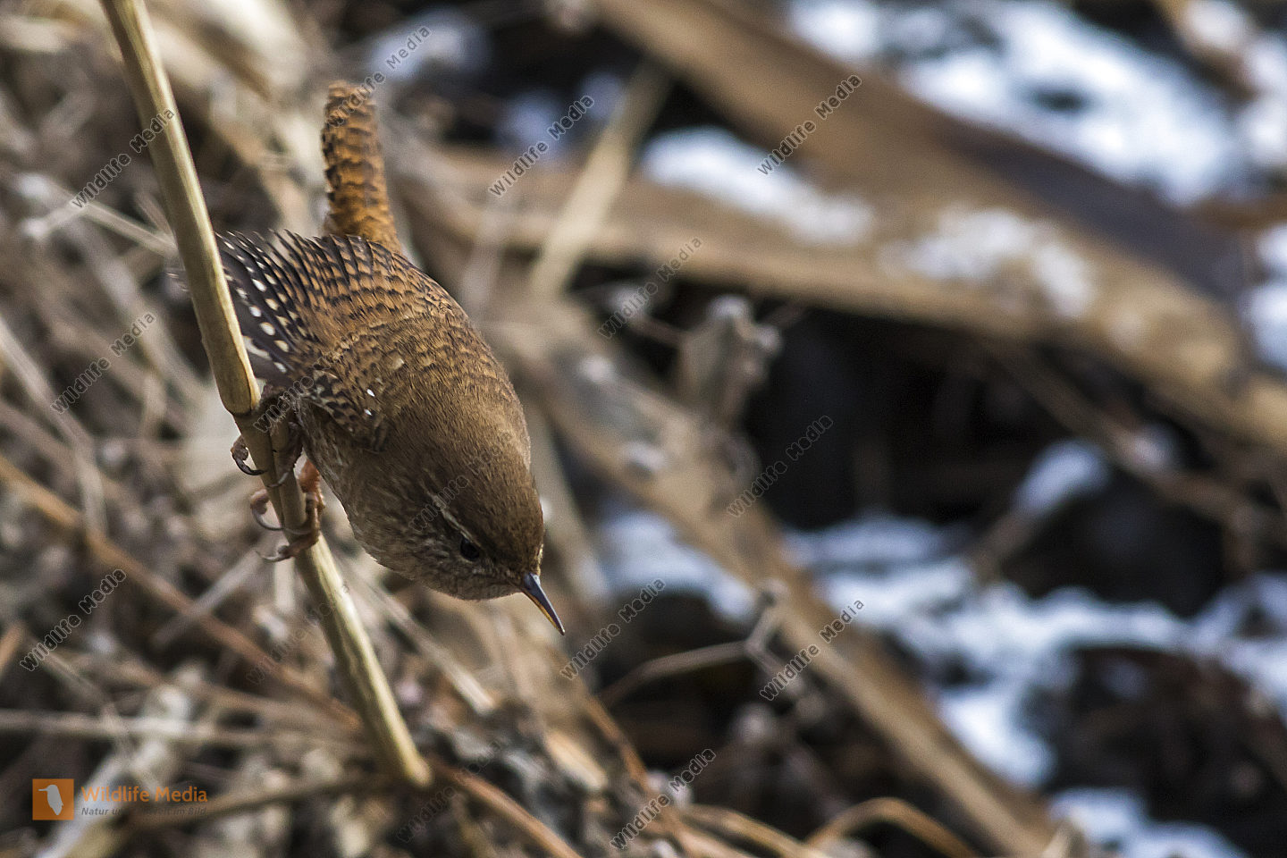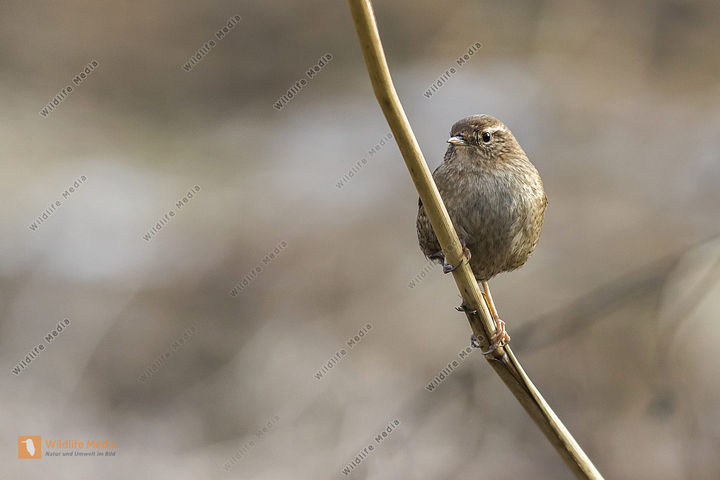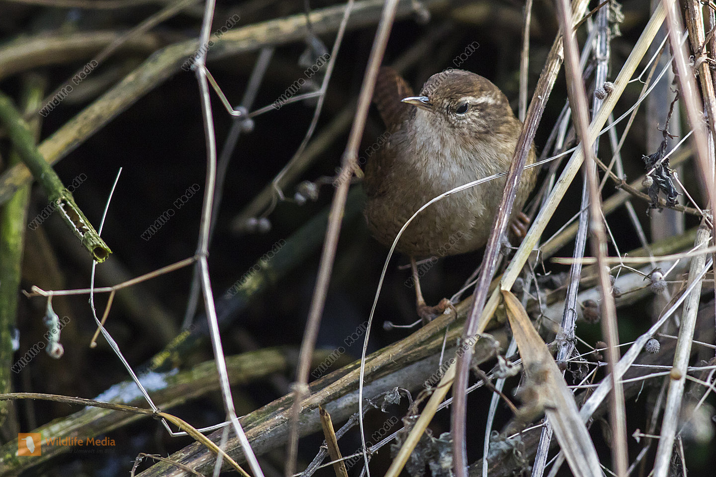 Ein Zaunkönig im Schilf eines Bachufers
