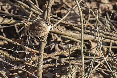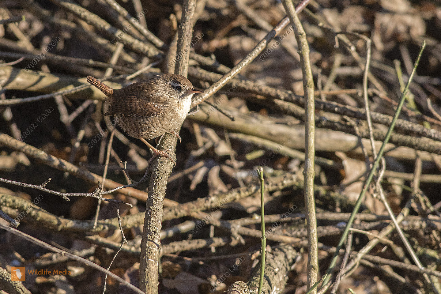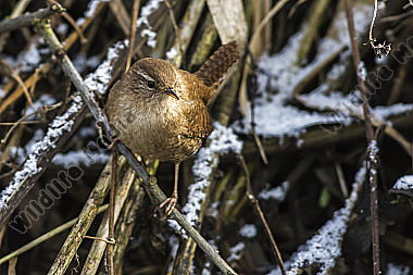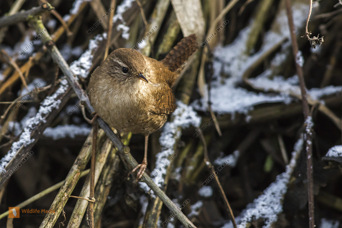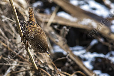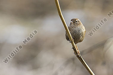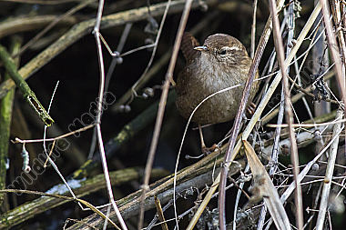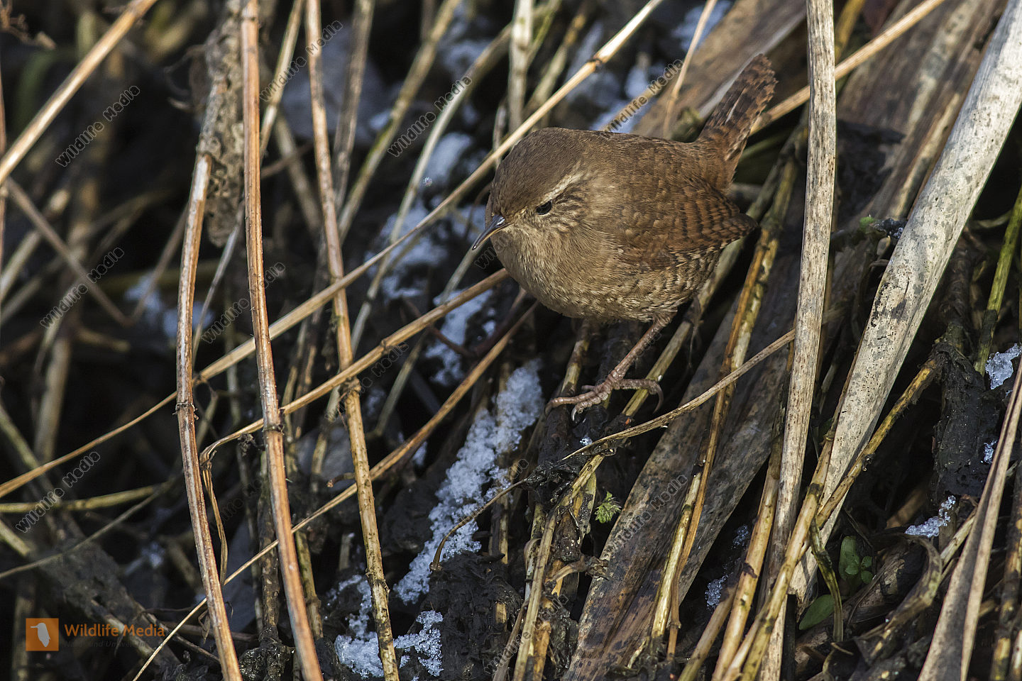 Ein Zaunkönig im Schilf eines Bachufers