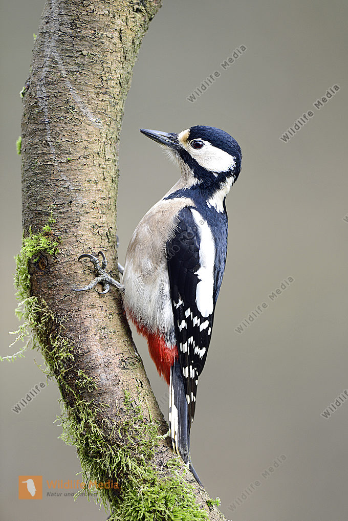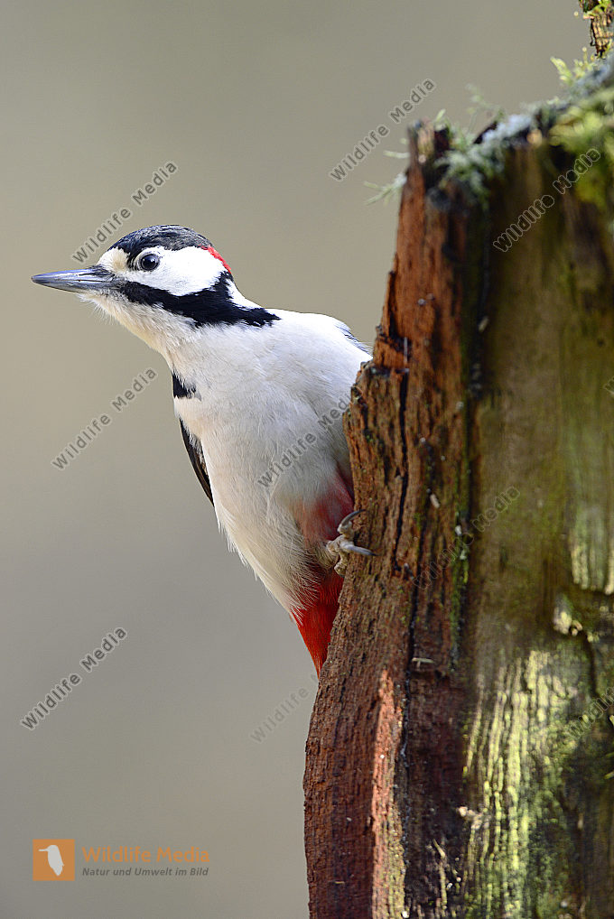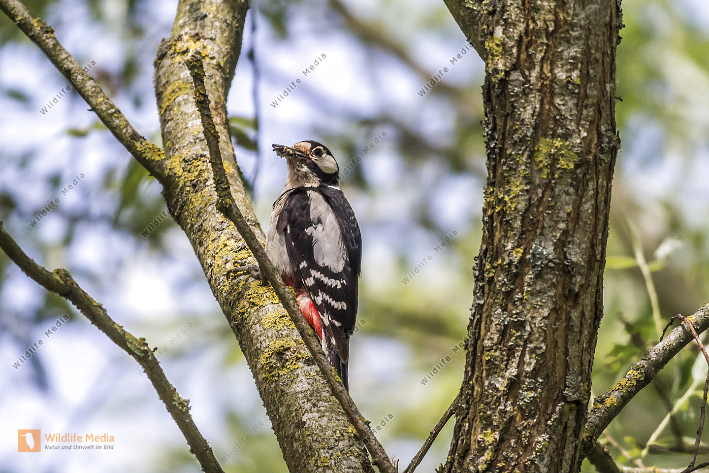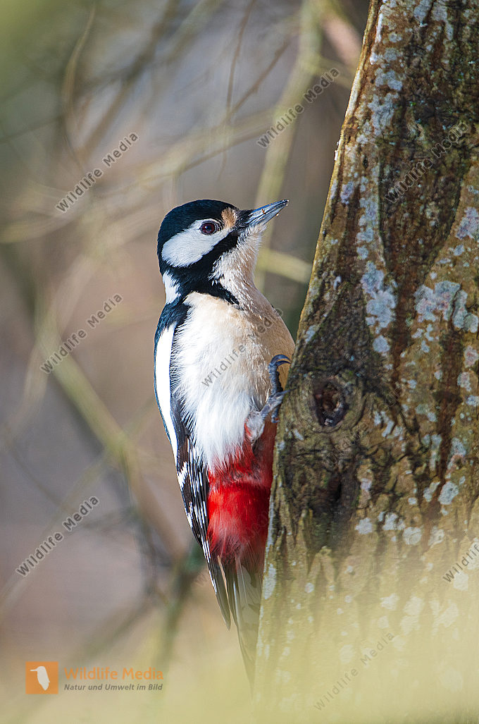 Ein Buntspecht am Baumstamm sucht nach Nahrung