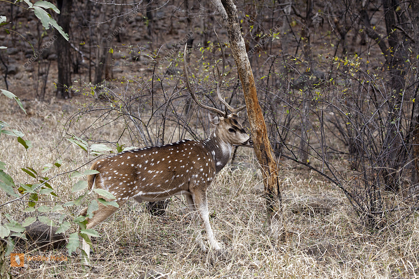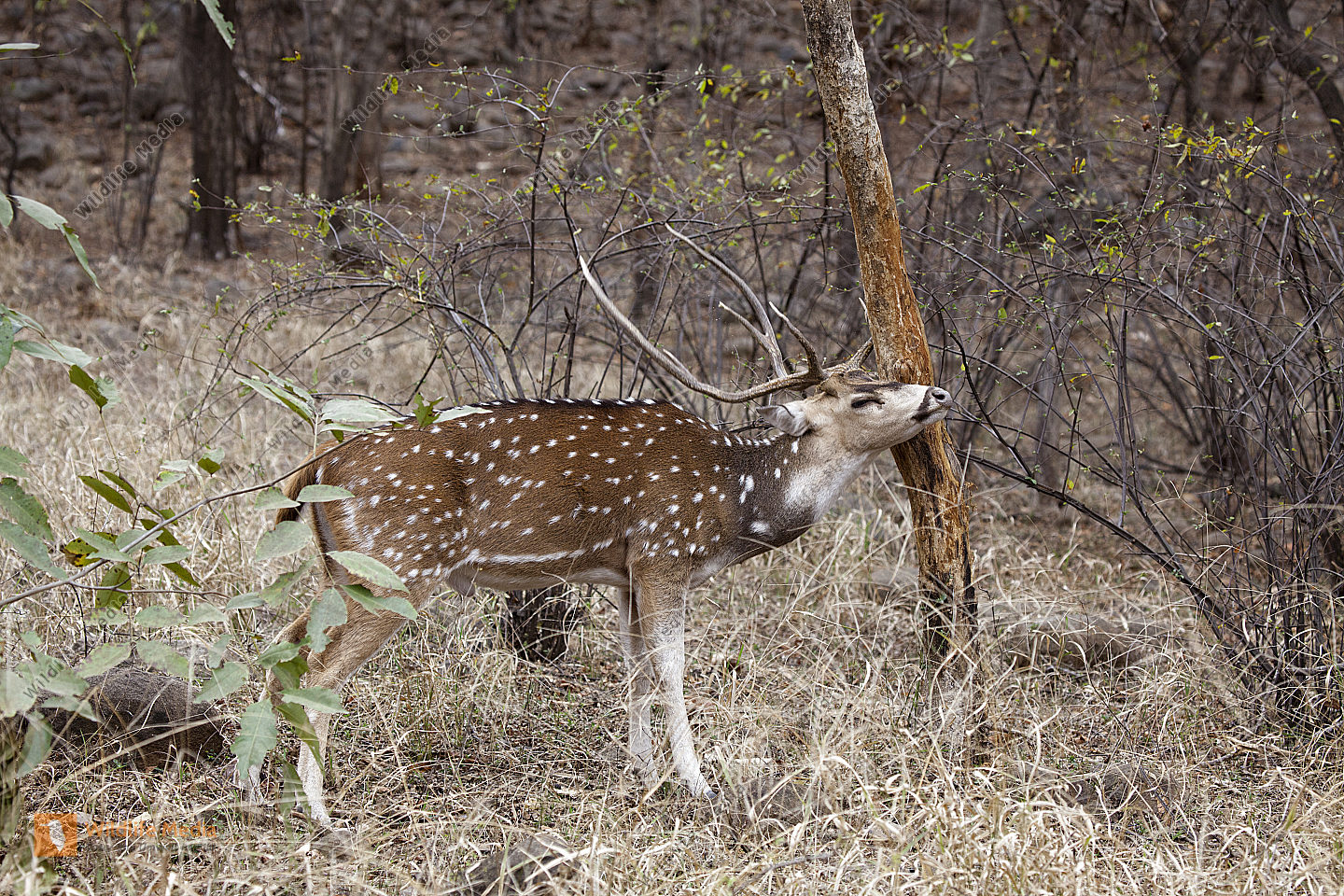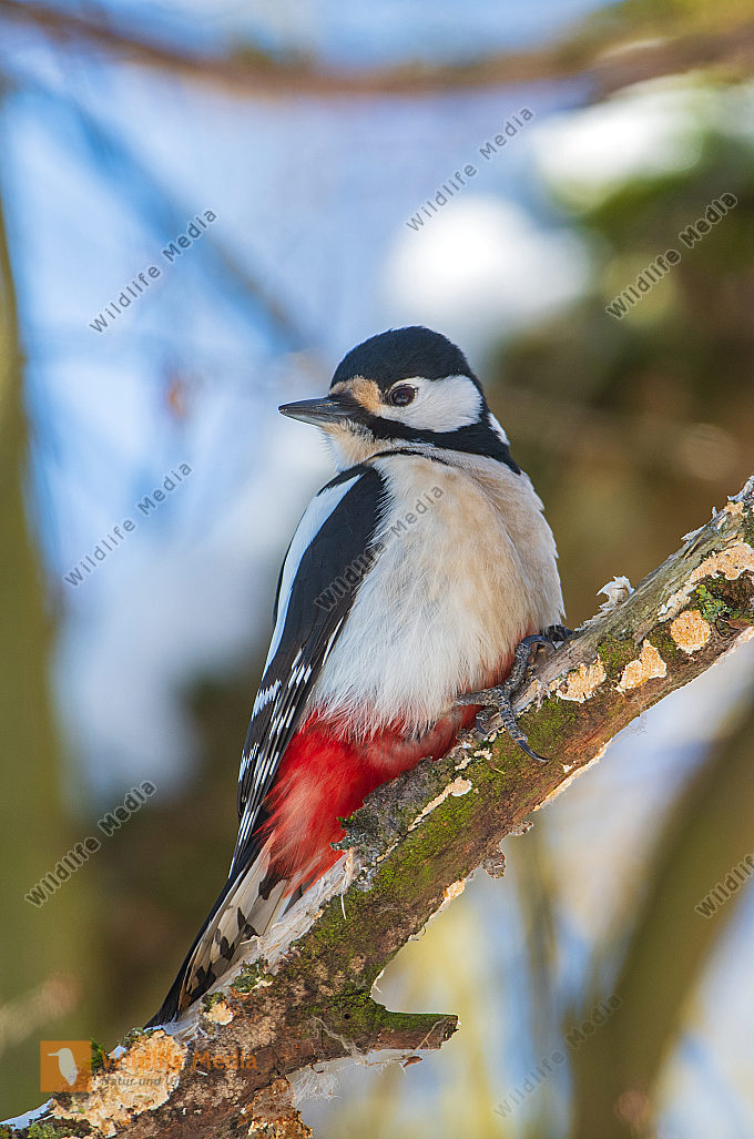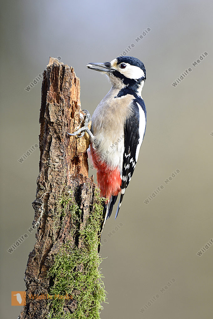 Ein Buntspecht am Baumstamm sucht nach Nahrung