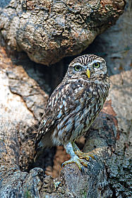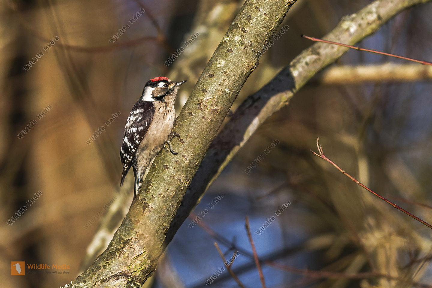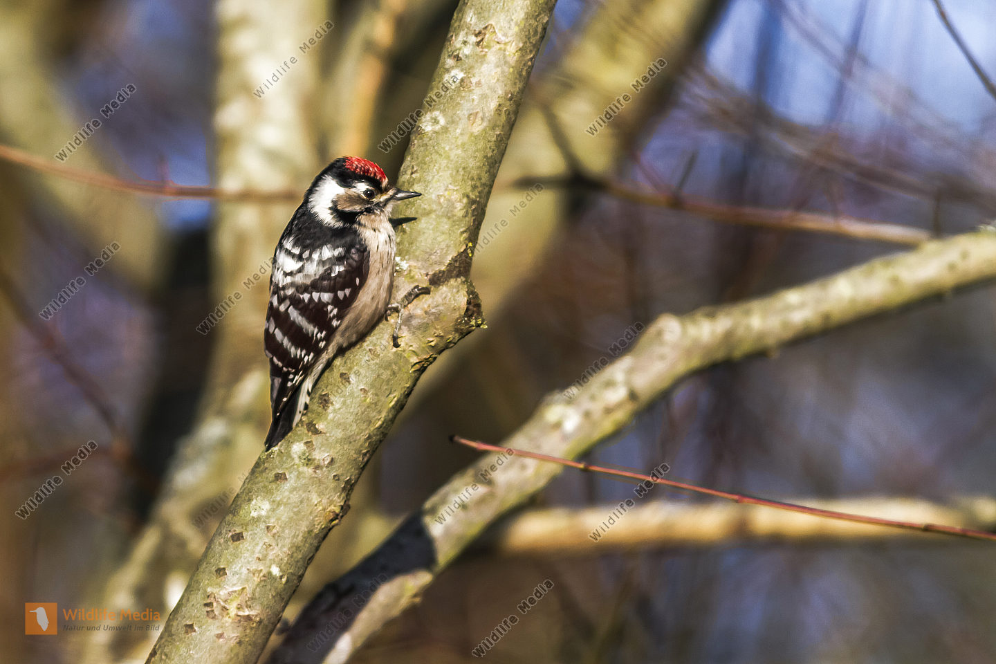 Ein Kleinspecht auf Futtersuche am Baumstamm