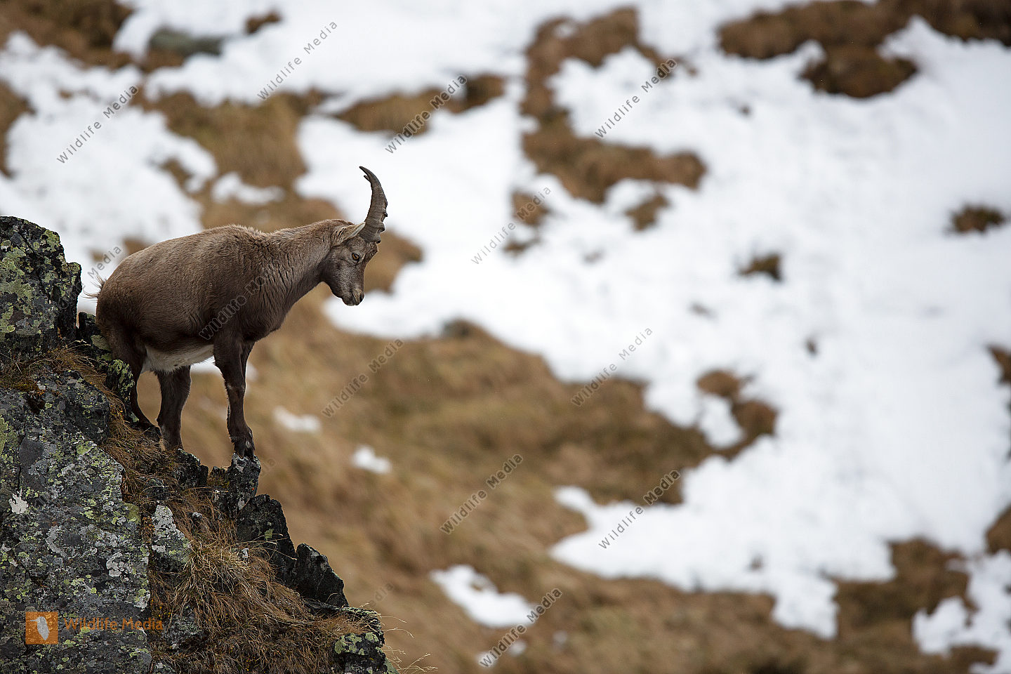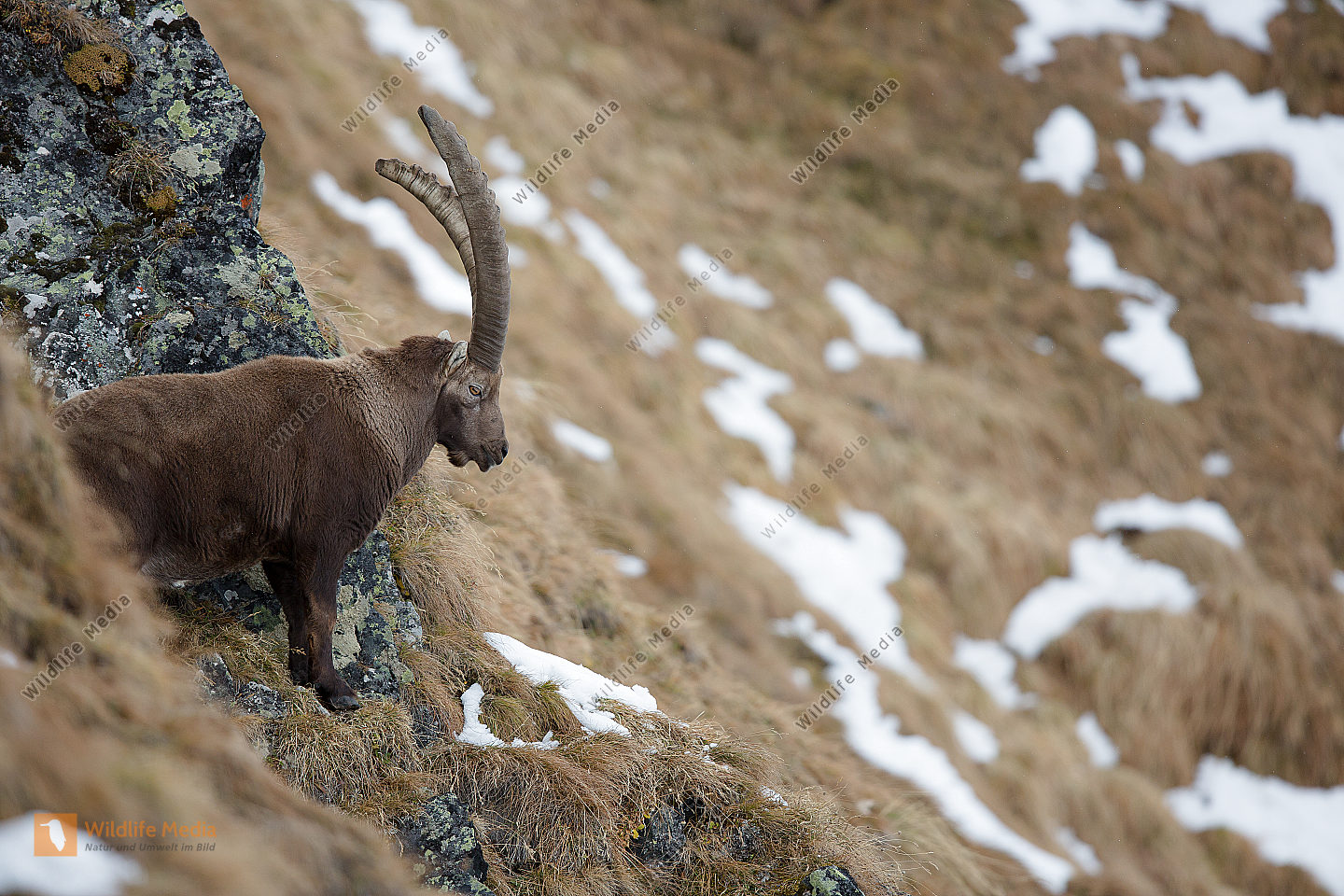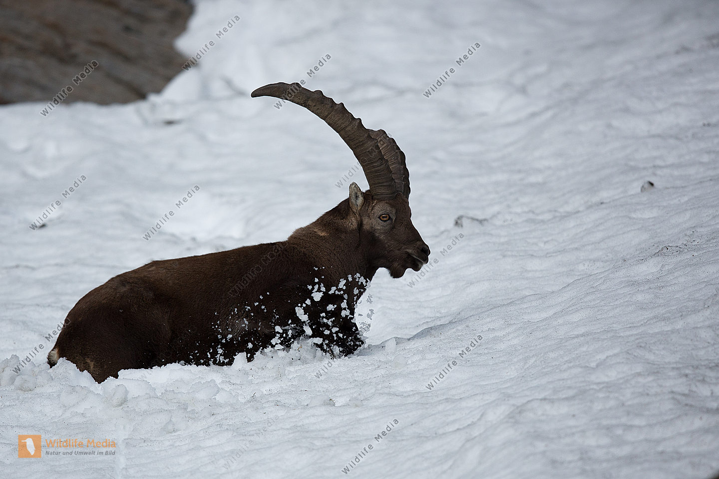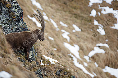 Alpensteinbock durchquert Schneefeld